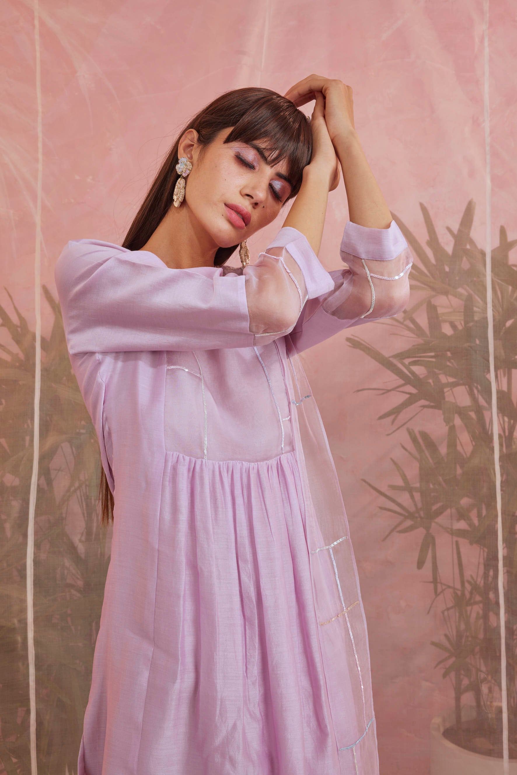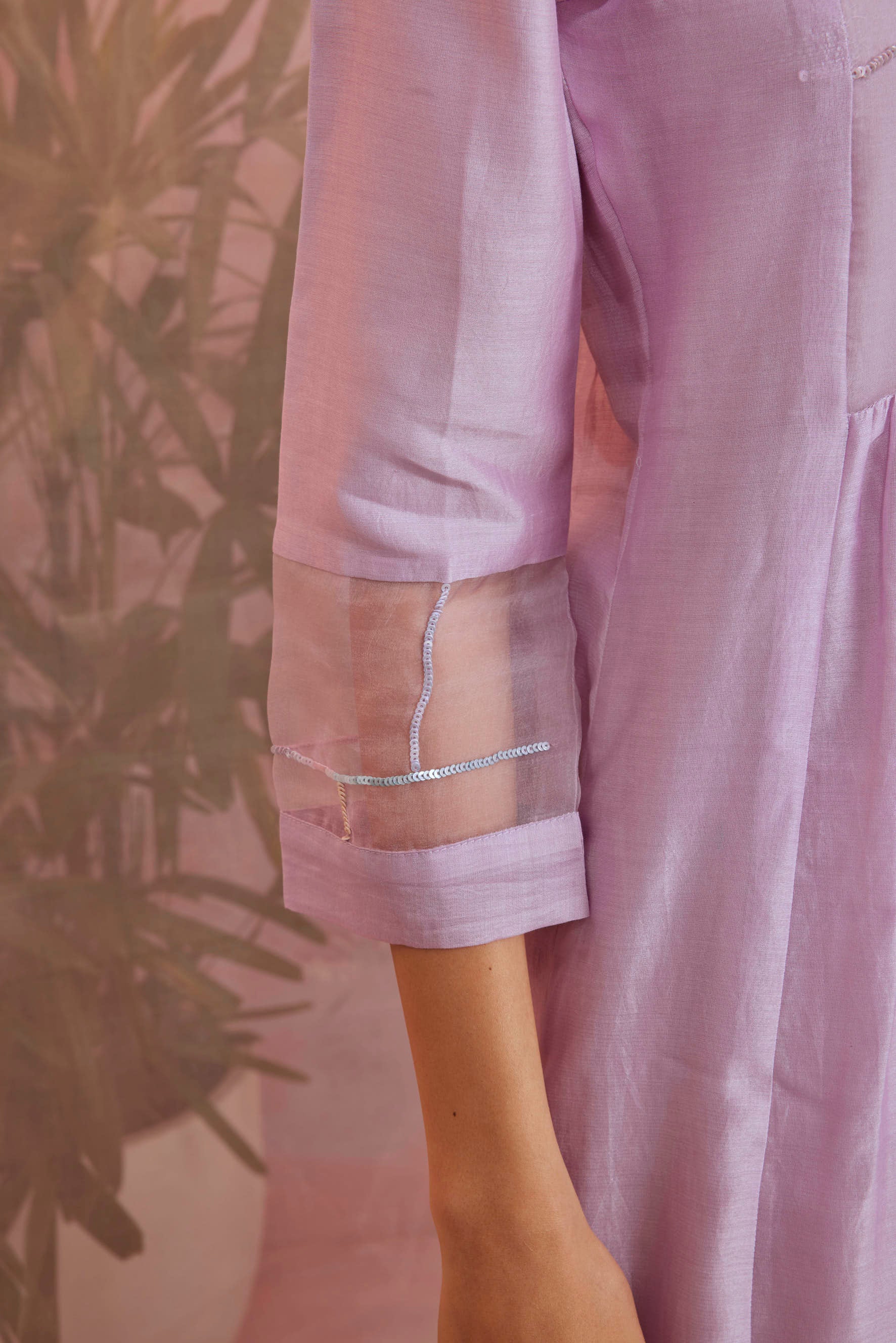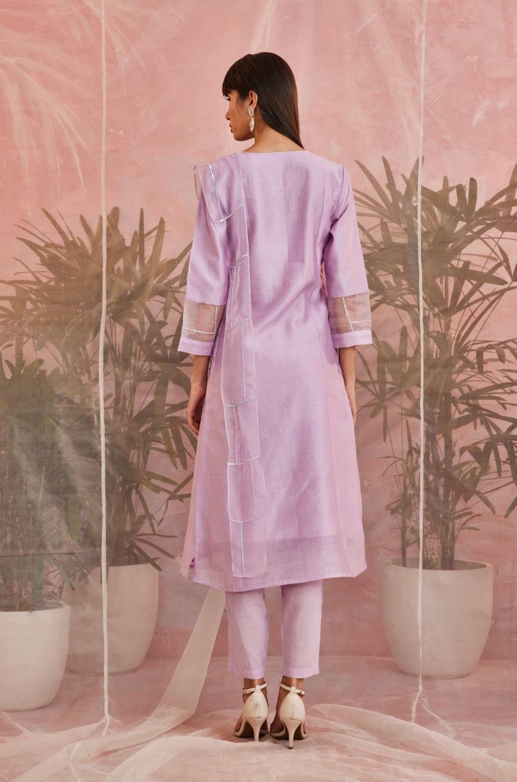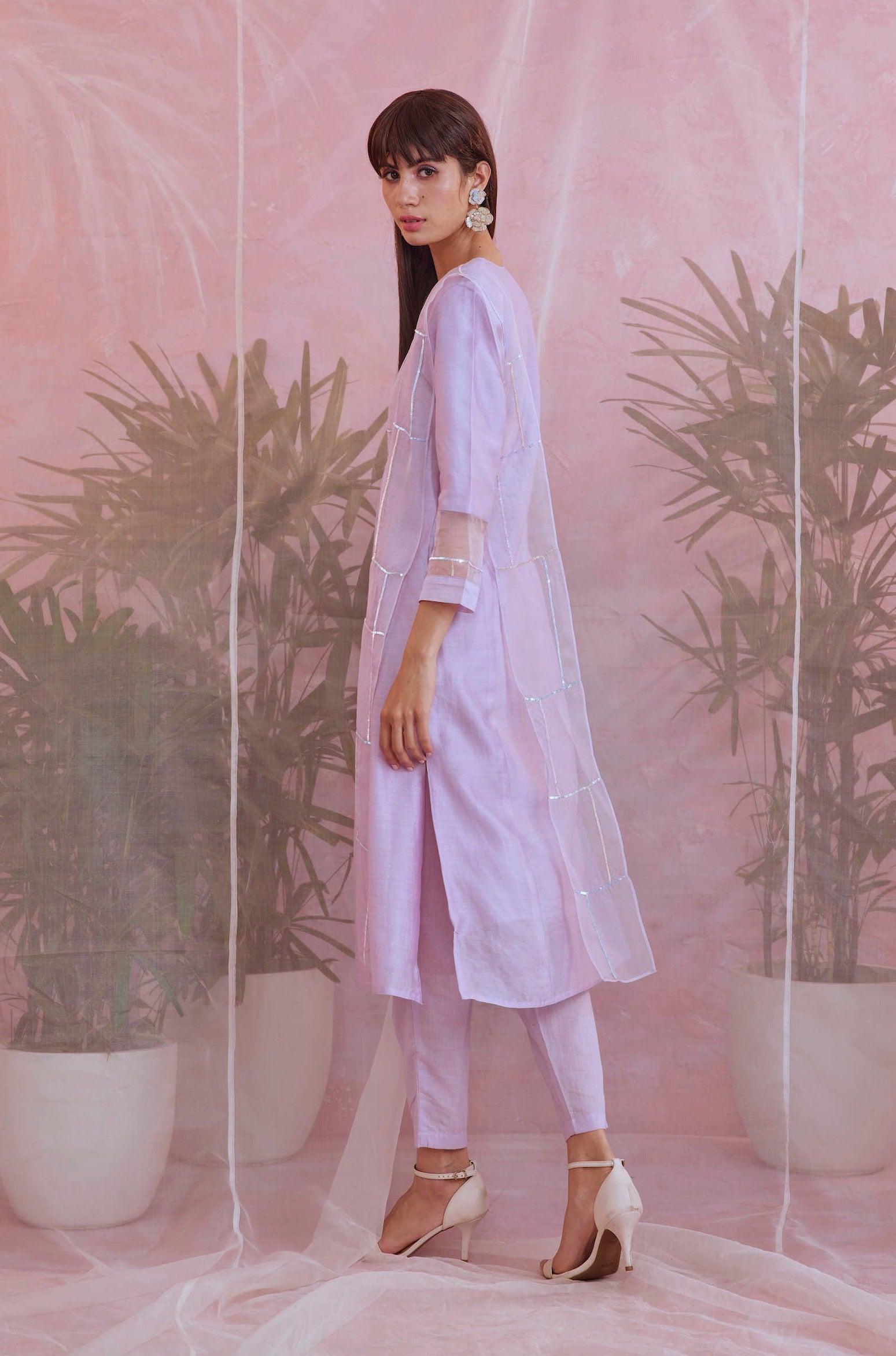 Our classic straight kurta with yoke and gathers in front, sequin embroidery on yoke and sleeves with organza inlay. This kurta is paired with straight cotton pants and an organza narrow dupatta with sequin work.