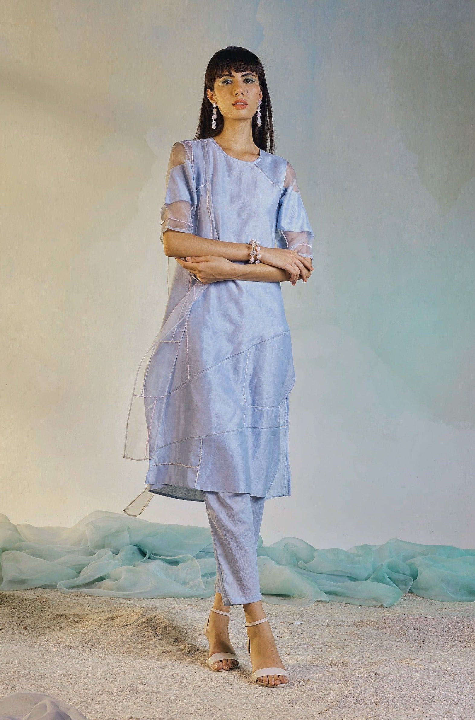 Straight panelled kurta with inlay of organza and sequin embroidery on front panel, paired with straight pants and sequin embroidered narrow organza dupatta.