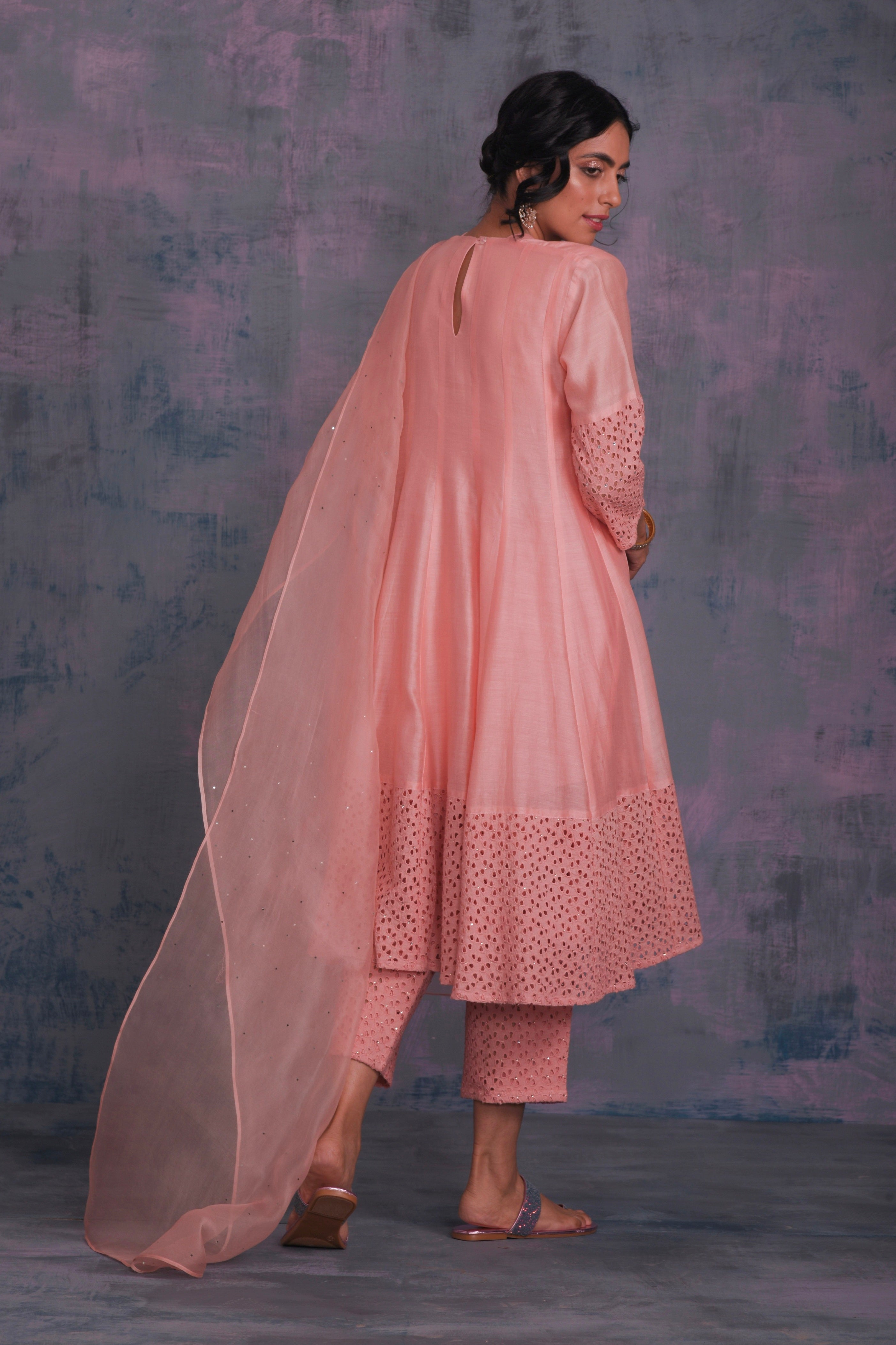 Chanderi peach kurta with jagged neckline and cutwork on sleeve & hem studded with swarovski. This kalidar kurta is paired with straight cutwork pants studded with swarovski and organza dupatta embellished with swarovski.