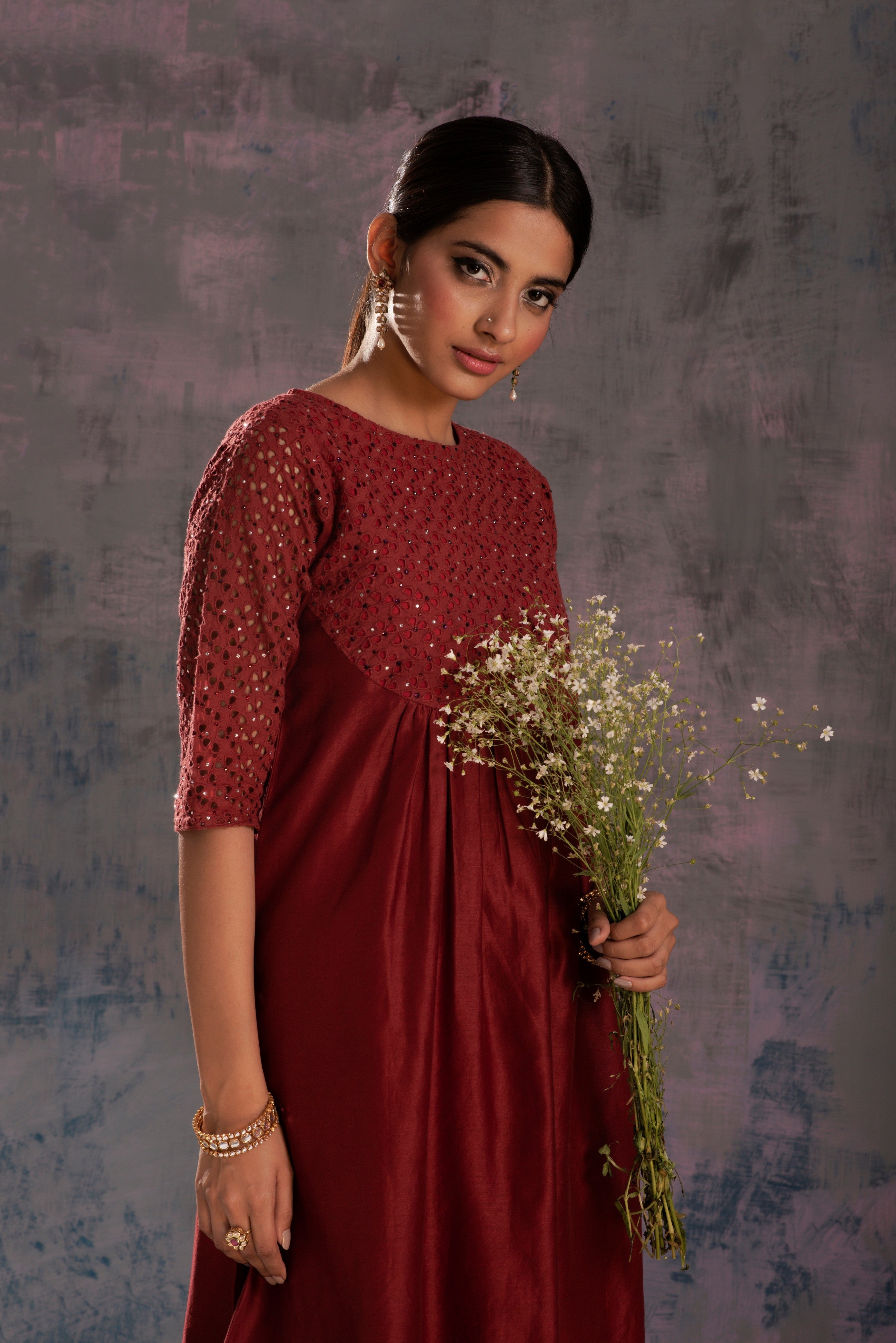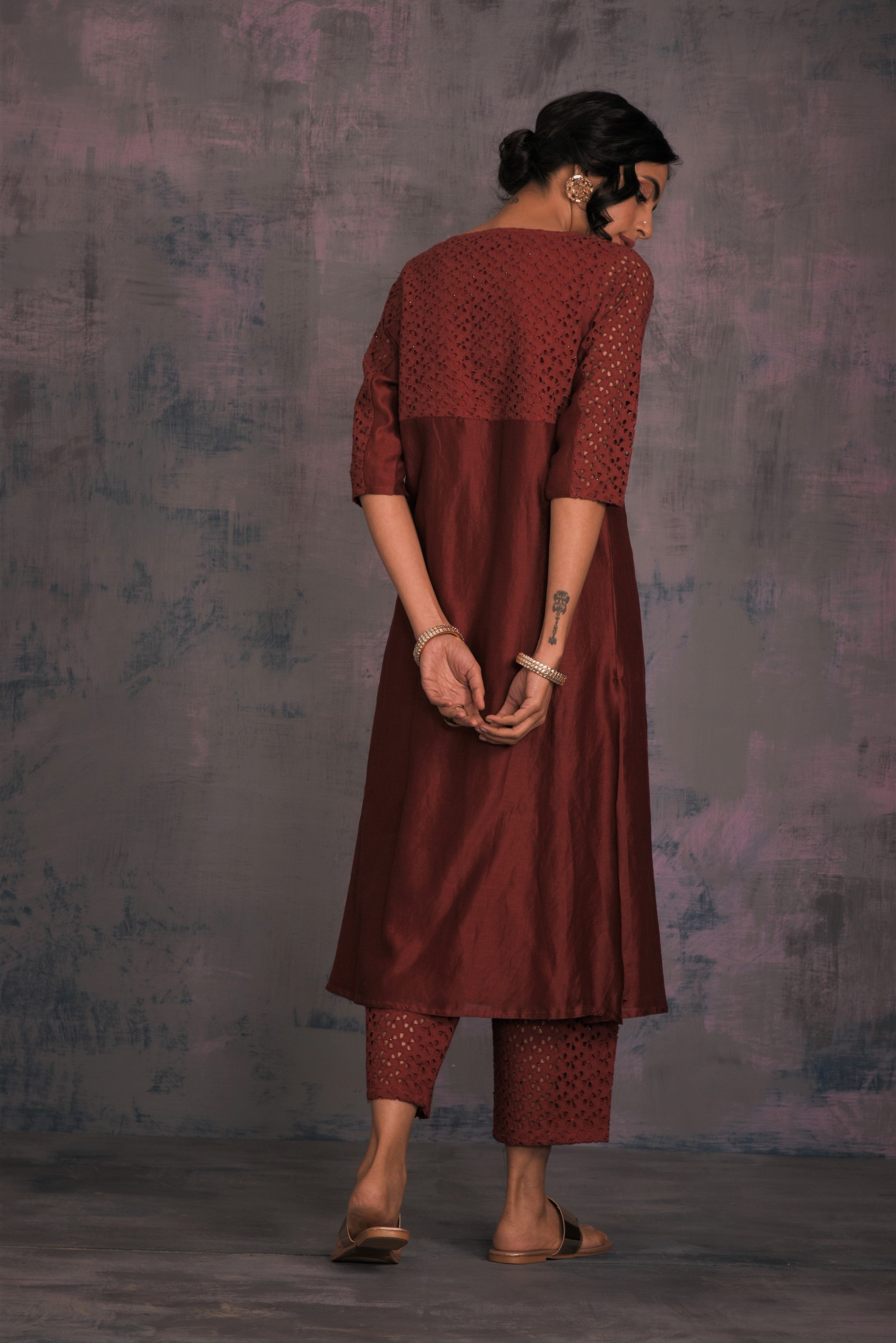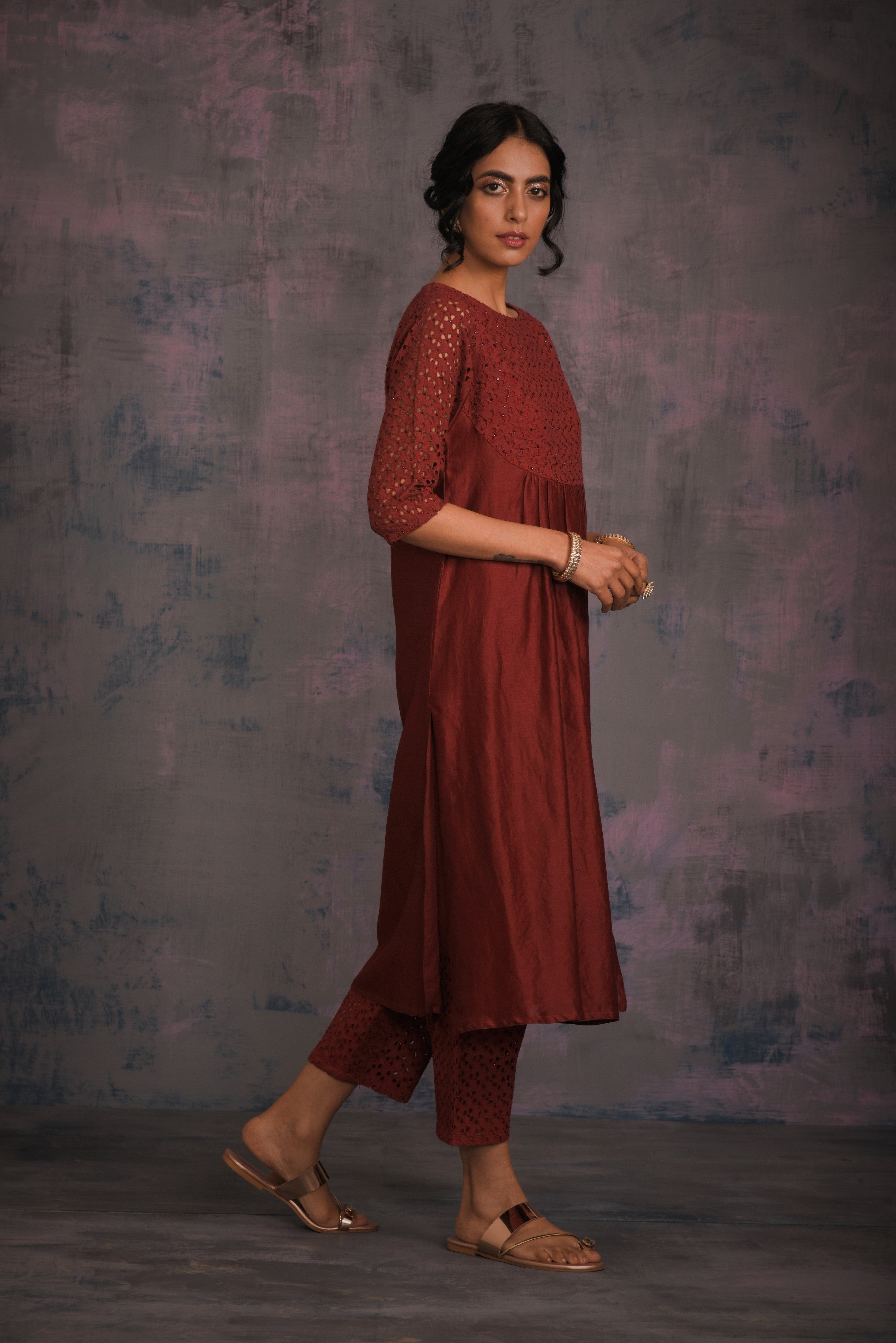 Chanderi Rust kurta with cutwork on yoke & sleeve studded with swarovski. This round yoke kurta is paired with straight cutwork pants studded with swarovski and optional organza dupatta embellished with swarovski.