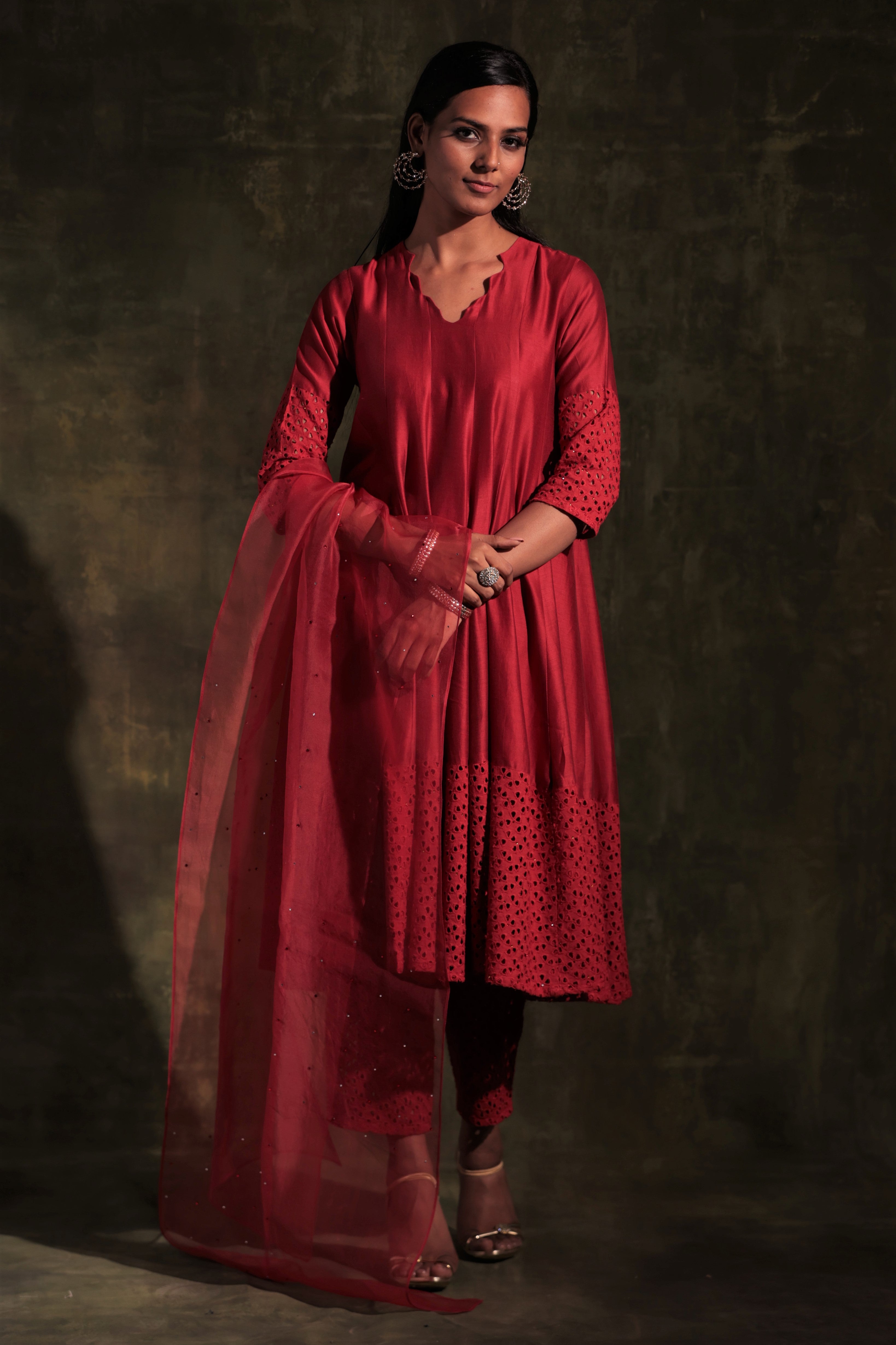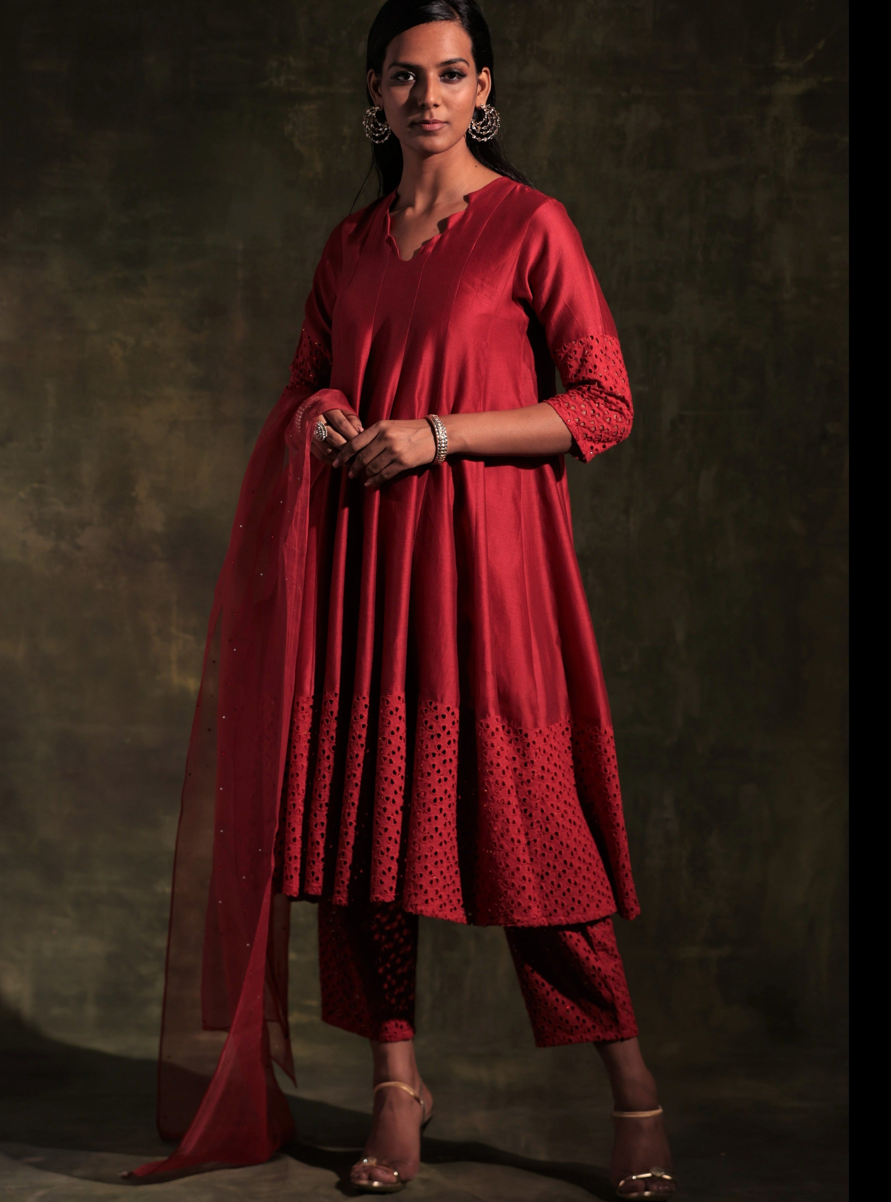 Chanderi red kurta with jagged neckline and cutwork on sleeve & hem studded with swarovski. This kalidar kurta is paired with straight cutwork pants studded with swarovski and organza dupatta embellished with swarovski.