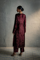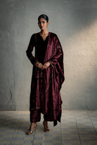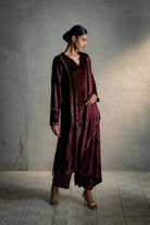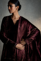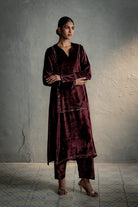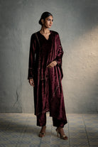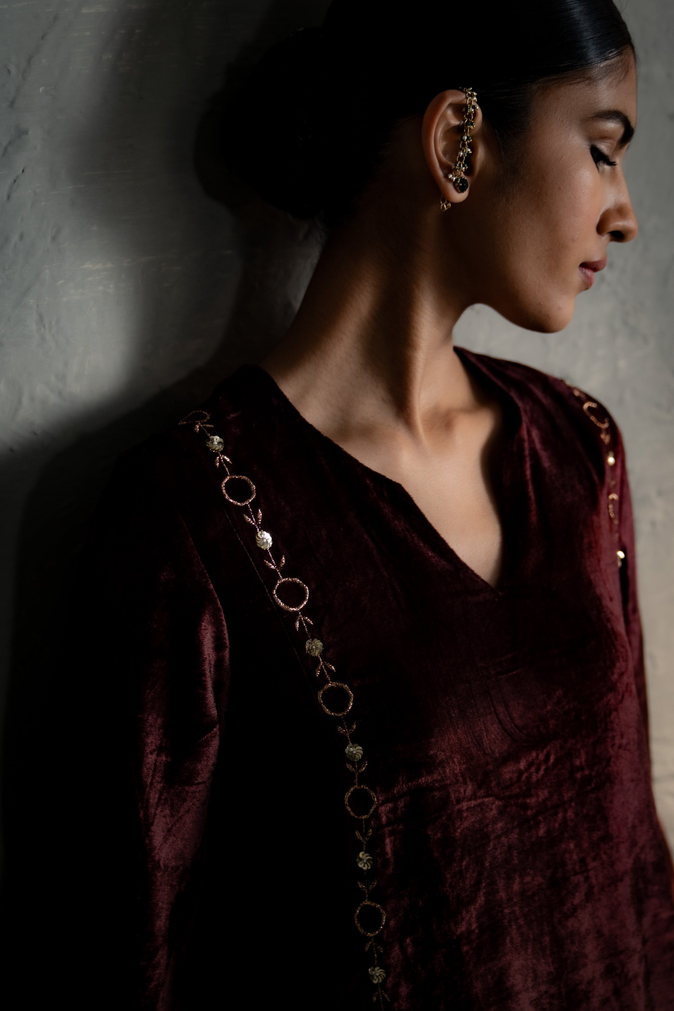 A straight-fit kurta adorned with circular embroidery arranged in a long rectangular line along the front and sleeves, paired with plain, loose pants for a clean, contemporary silhouette. Available in two rich colour options, one styled with an embroidered velvet stole, and the other with an organza dupatta edged in velvet for a soft, flowy drape.