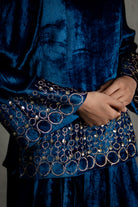 A contemporary two-piece cord set featuring a heavily embroidered top with detailed hem and sleeve cuffs, flared long sleeves, and paired with flared, ankle-length palazzos. Designed for modern formal occasions, this ensemble balances intricate craftsmanship with a sleek, contemporary silhouette.
