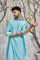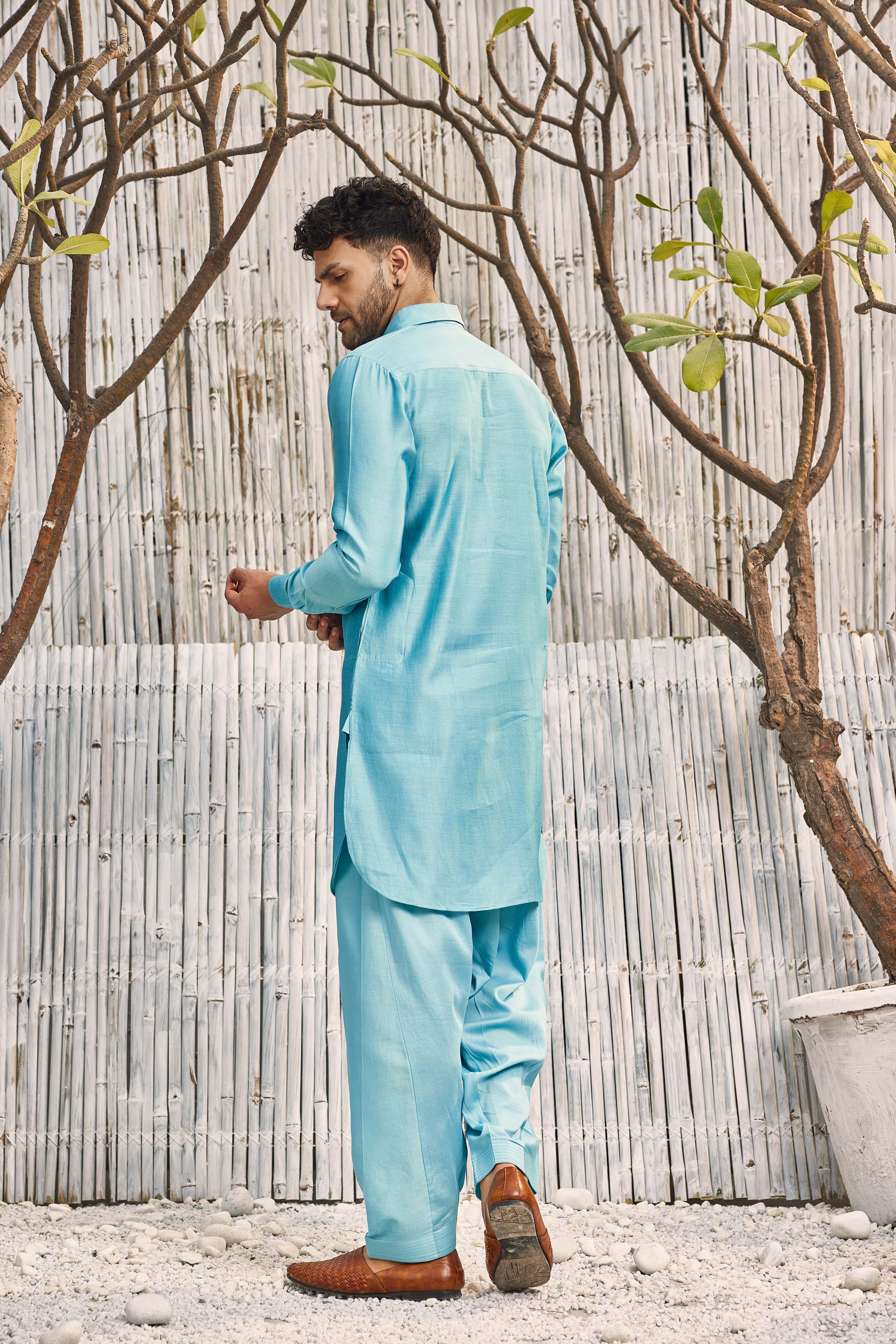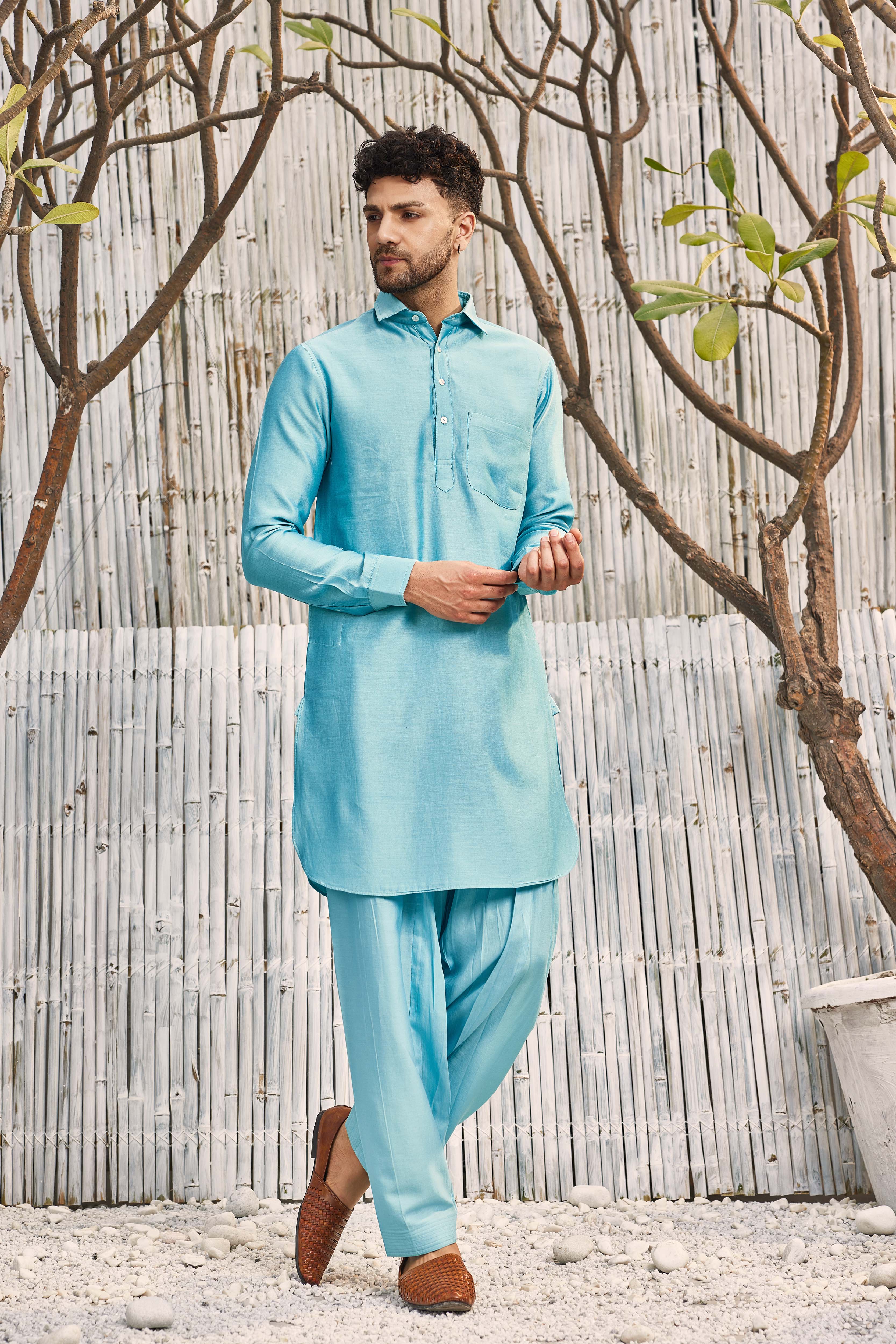 Our classic chanderi pathani in blue is the perfect occasion wear. It features, classic shirt collar, foldable sleeve, side pockets & a round shape bottom. Kurta is paired with same colour salwar.