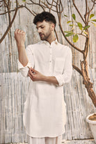 Our classic pathani in off-white textured cotton. It features, classic shirt collar, foldable sleeve, side pockets & a round shape bottom. Kurta is paired with salwar.