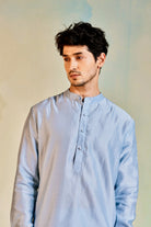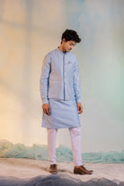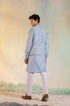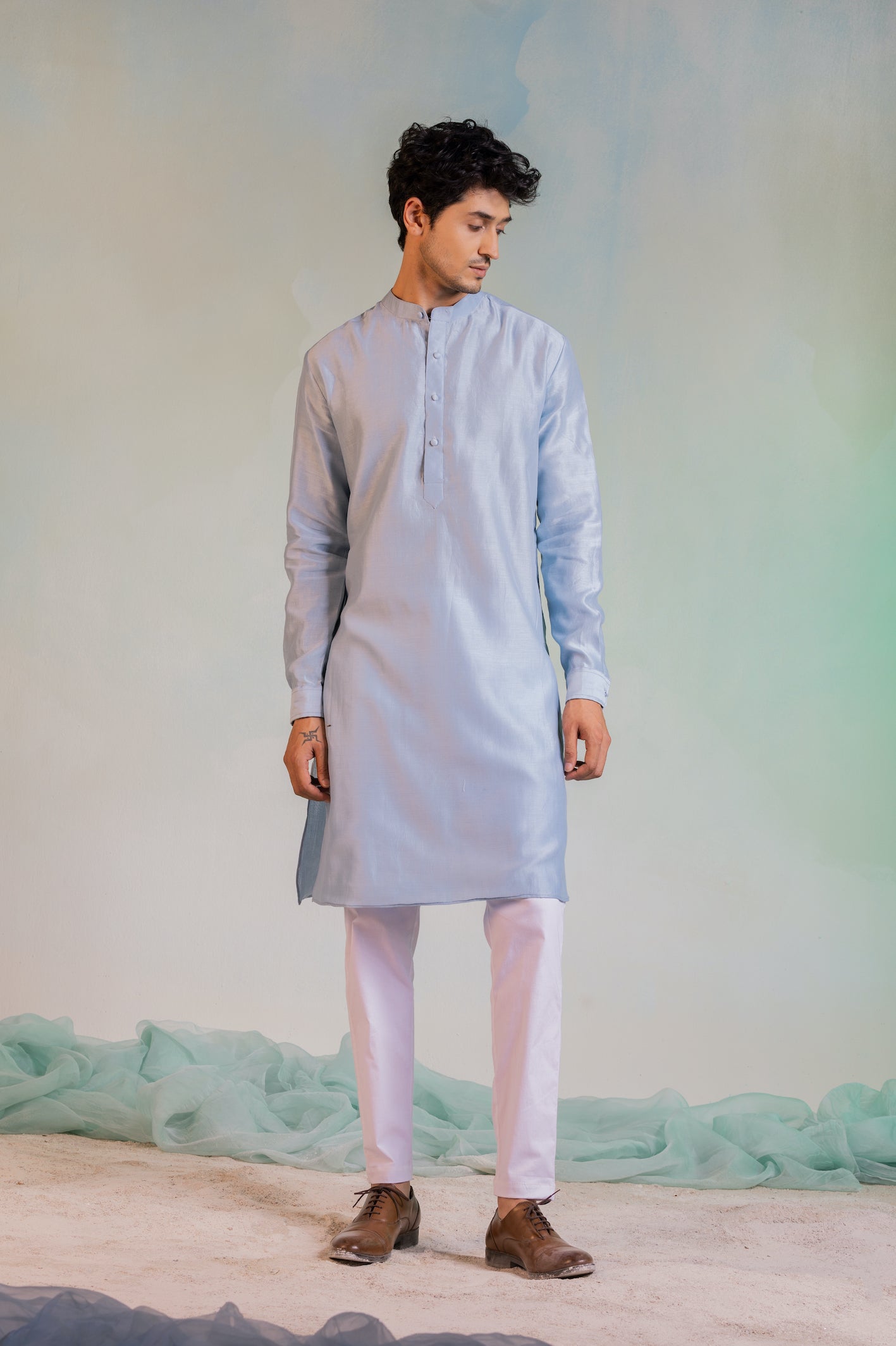 Comfort fit straight plain chanderi kurta, paired with straight white cotton lycra pants. This formal look can be completed with a chanderi sequin work Nehru jacket.