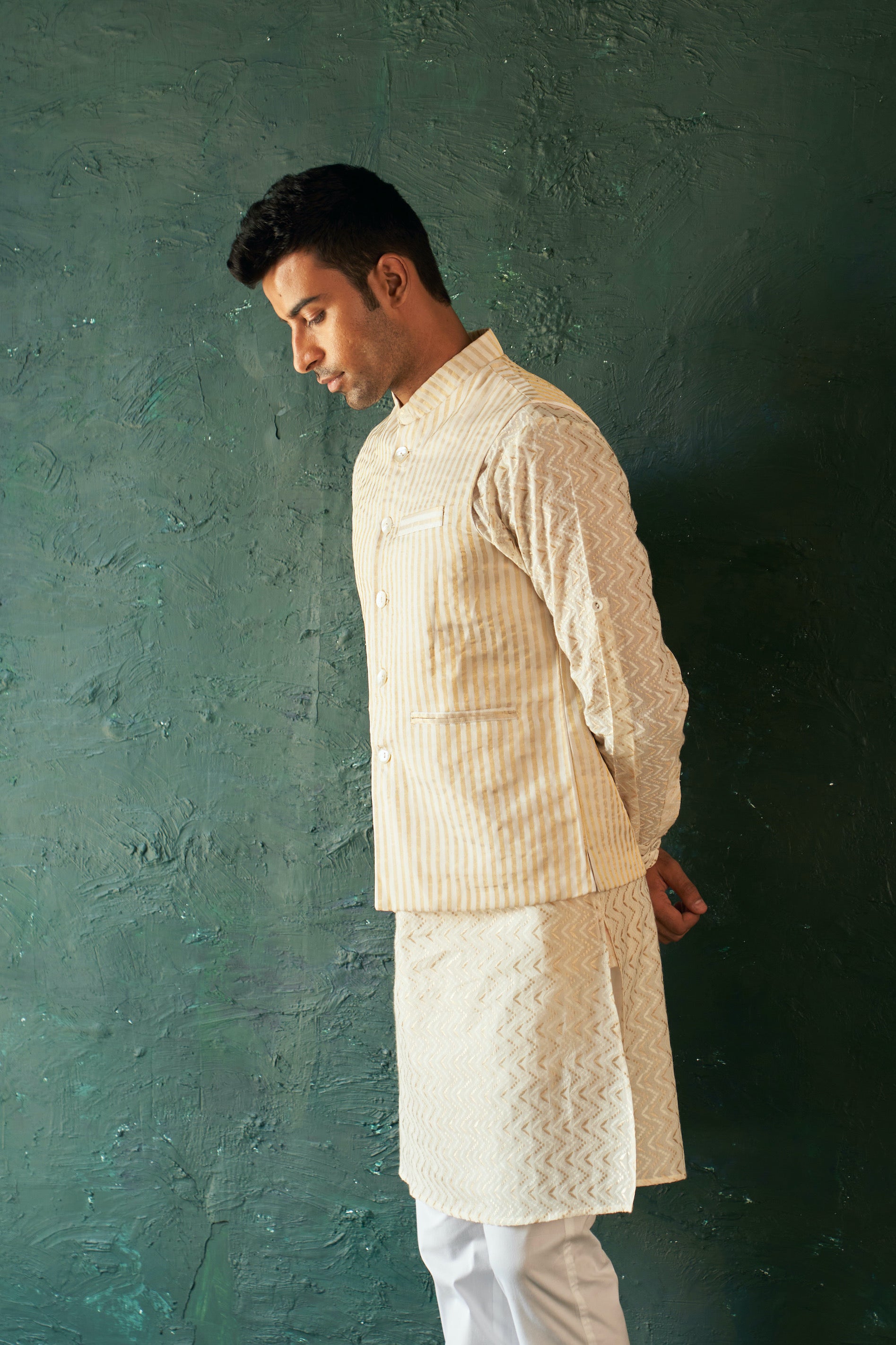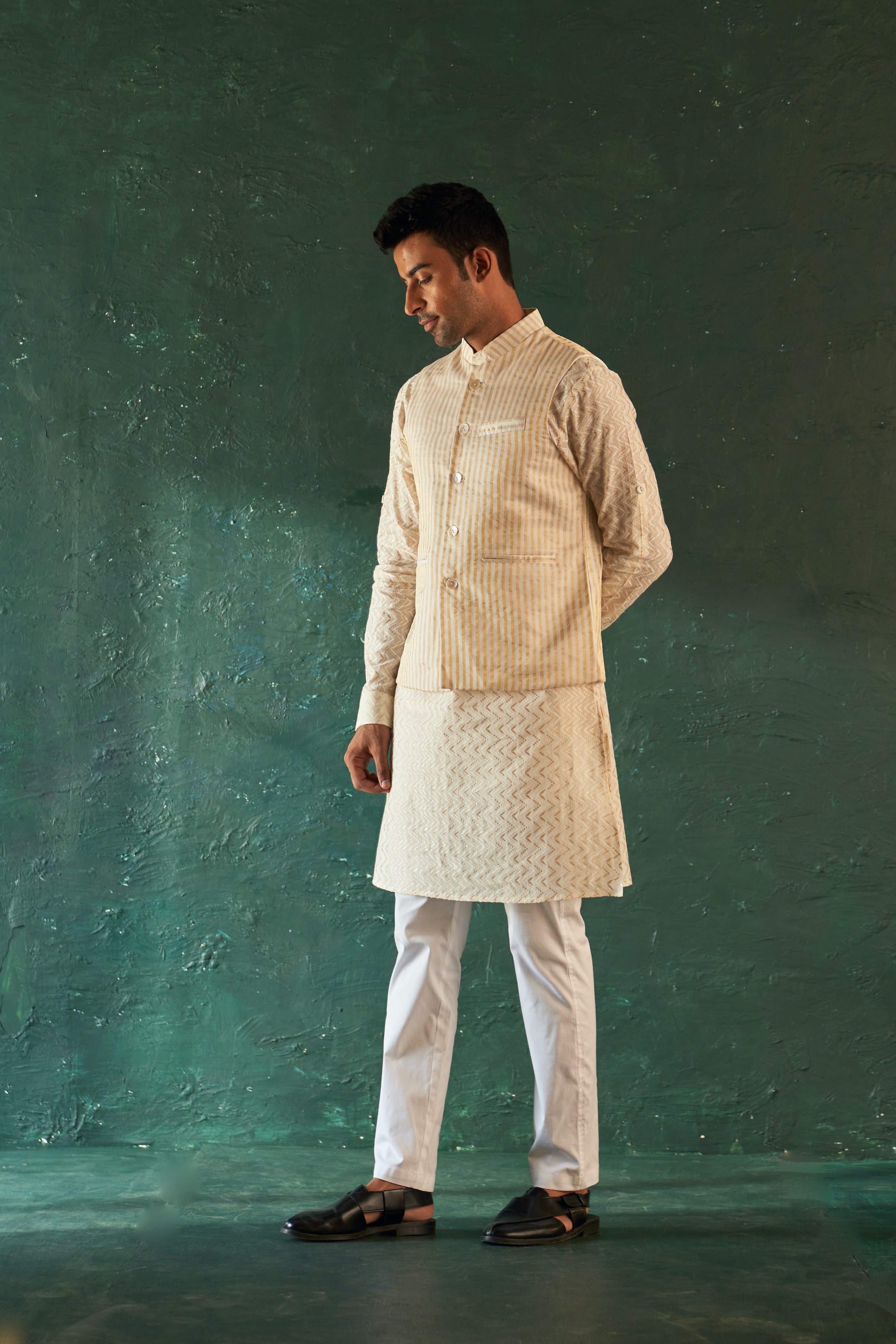 Our classic straight kurta in white chevron cotton is the perfect occasion wear. The kurta crafted in beautiful threadwork all over. It is paired with cotton pants and a white stripe tissue nehru jacket to make it look more edgy. The stylish and modern design ensures you look your best on your special events. Impress your guests with this set of three and let the timeless design become a conversation starter.