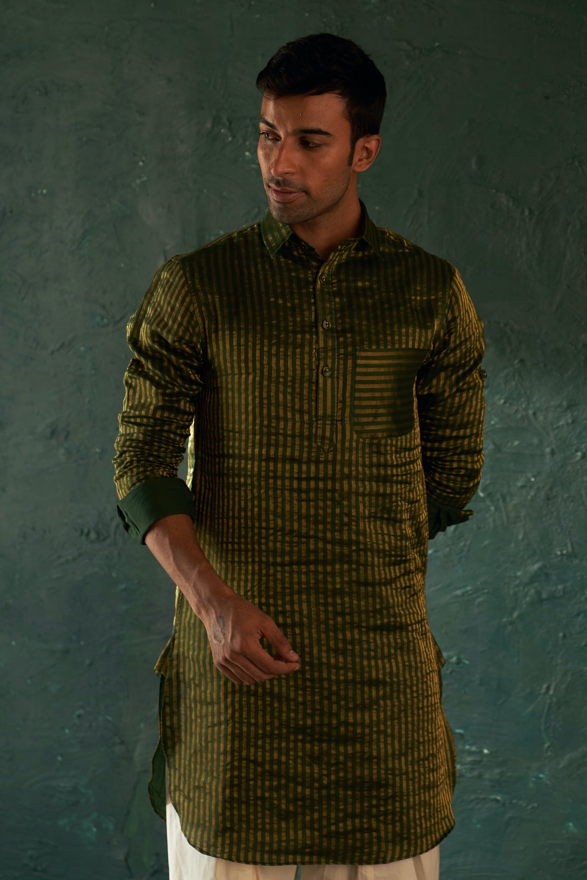 This set of two offers a timeless classic - a silk tissue Pathani in deep green, complete with a shirt collar, shoulder loops, and folded sleeves. It is subtly embellished with doriwork on the pocket and details in silk tissue stripes, as well as an off-white salwar. Wear it with our deep green striped Nehru jacket for a modern, sophisticated look.