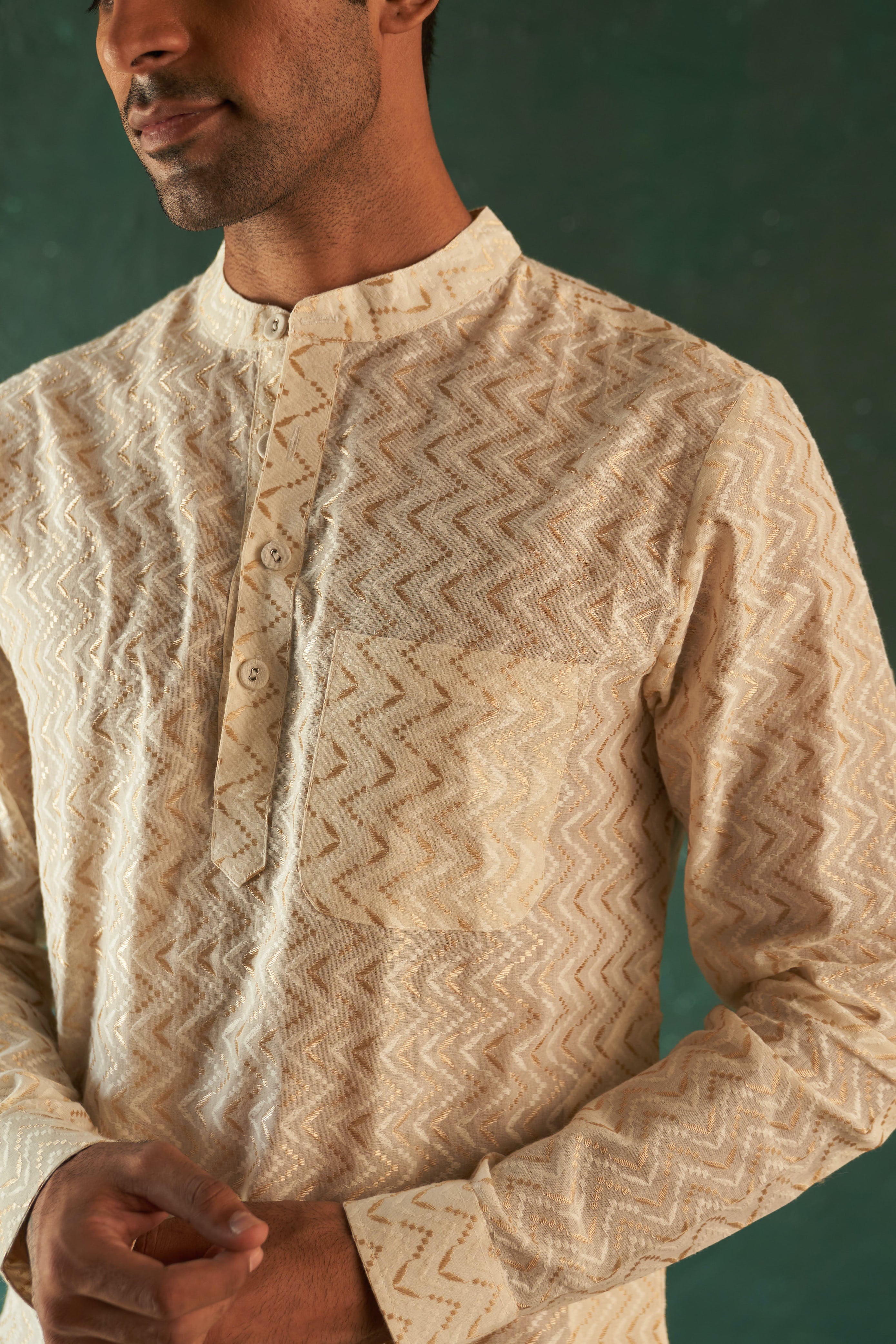 This classic, straight-cut white chevron cotton kurta is ideal for special occasions, featuring intricate embroidery and matching cotton trousers.