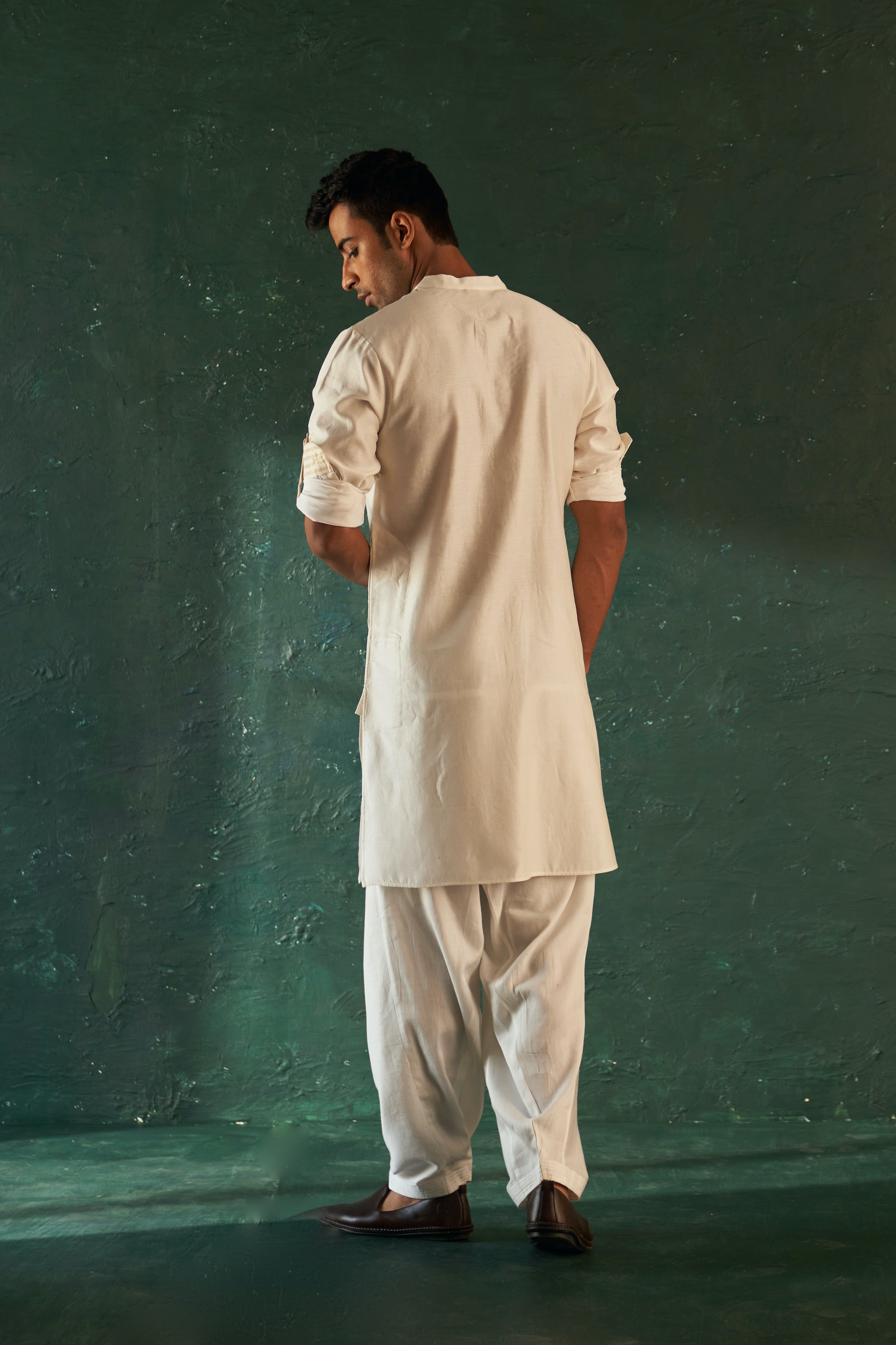Our classic straight kurta in white chanderi is the perfect occasion wear. It features with a contrast stripe tissue details at pocket & placket. It is paired with cotton salwar.