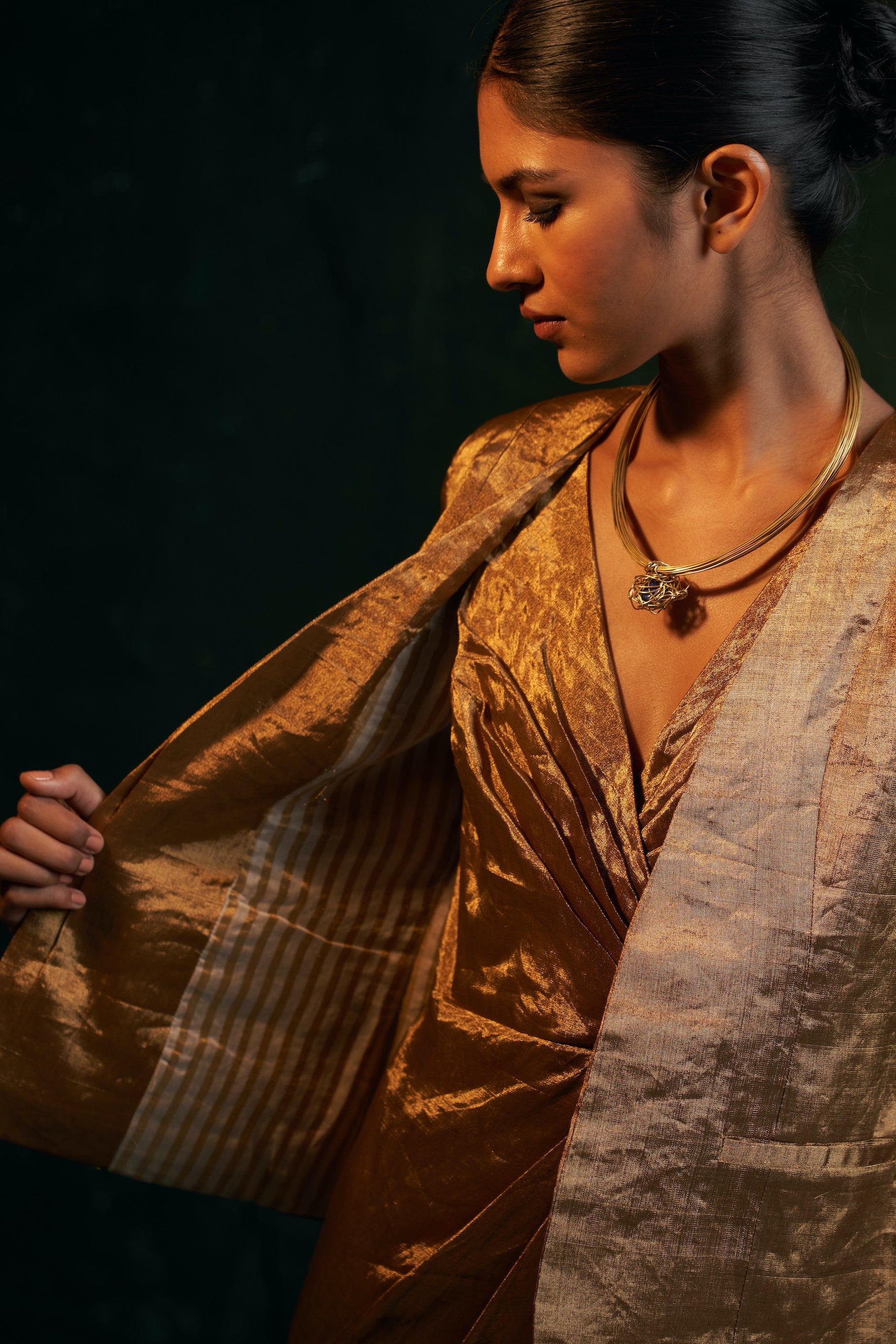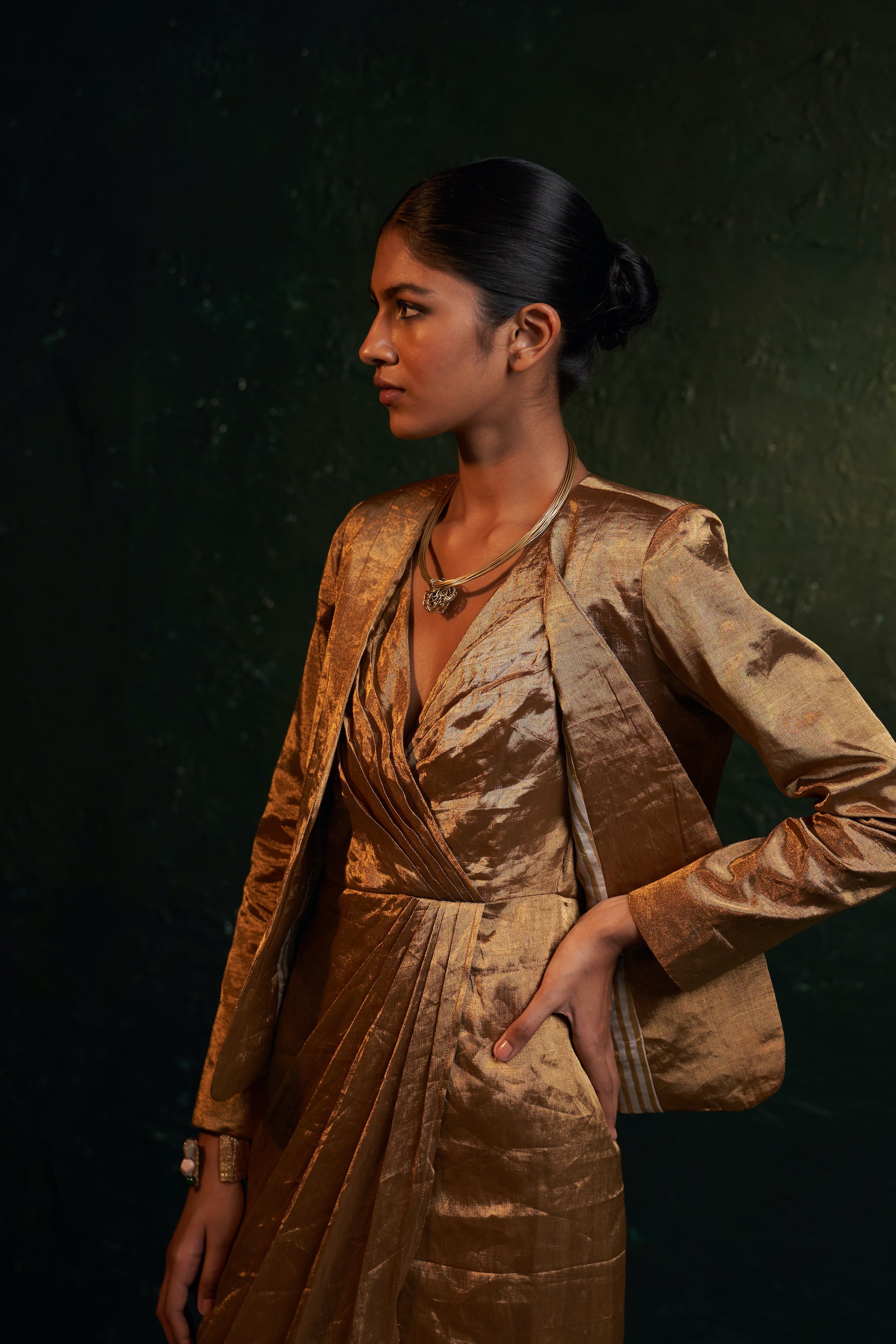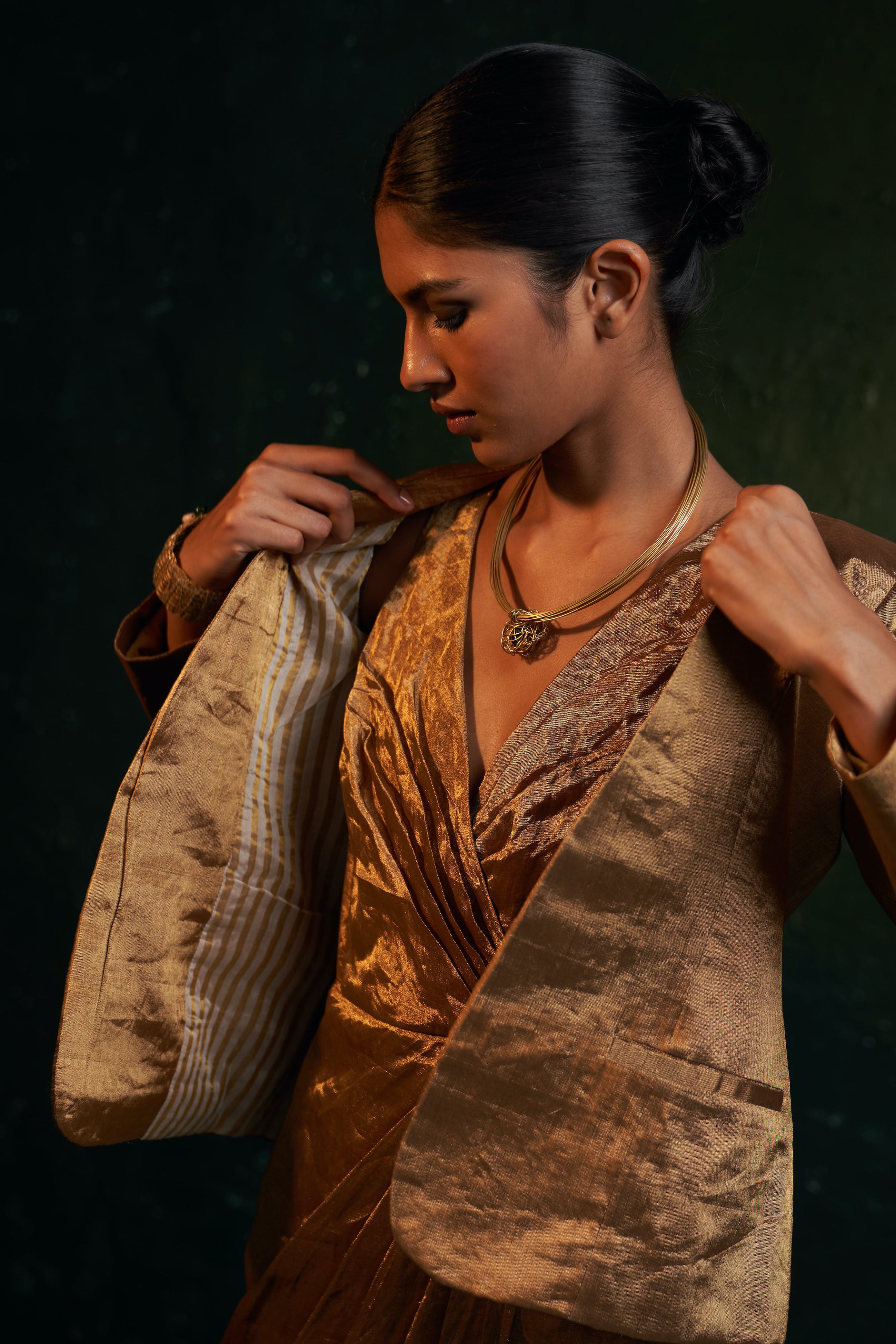 This contemporary Gold tissue blazer is an essential accessory for any formal event, festival, or wedding, adding a touch of glam and warmth to winter wedding nights. For a complete look, pair it with a dress or saree and accessorize with a twisted knot neckpiece.