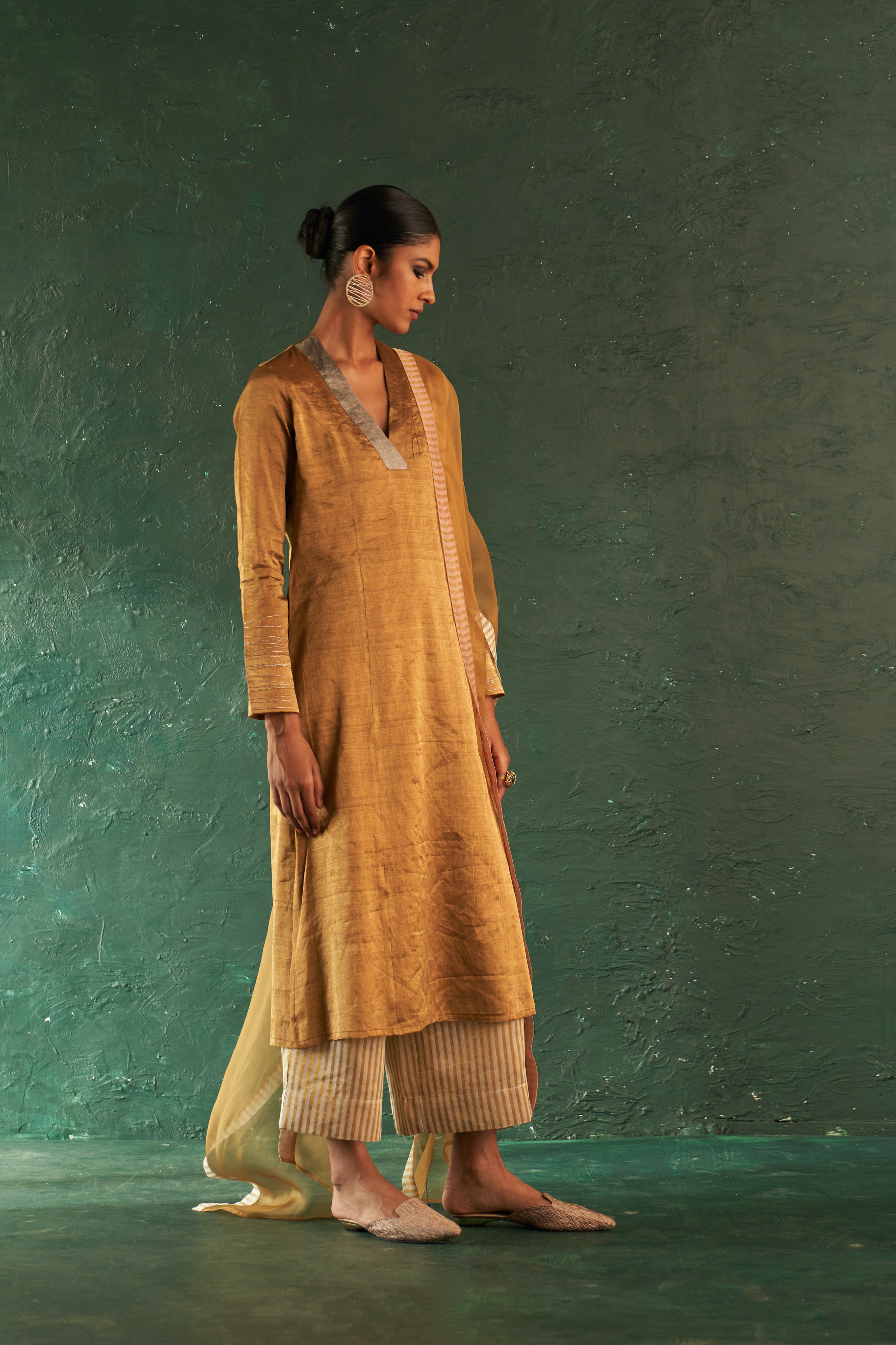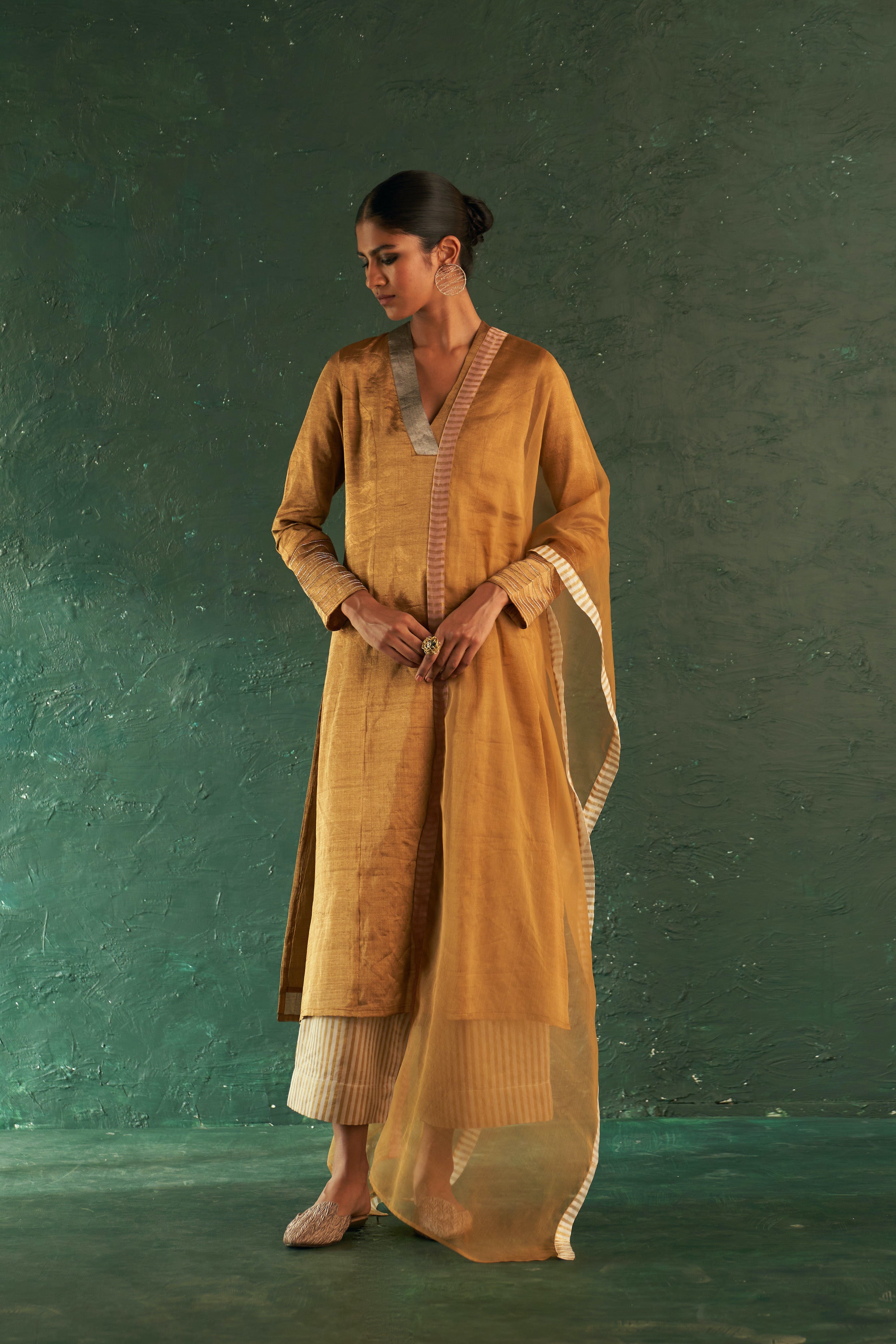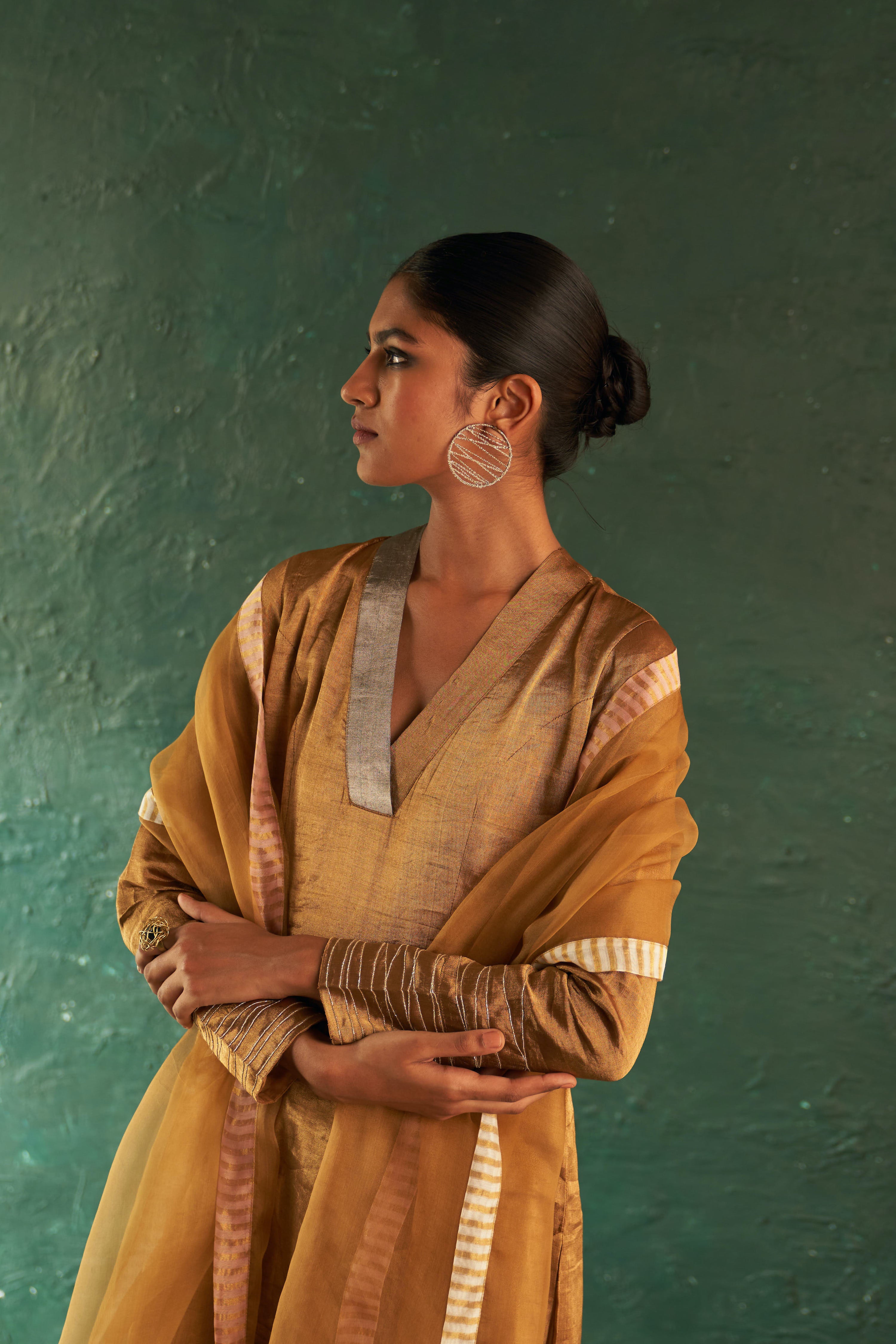 You can never go wrong with this classic gold tissue Straight Kurta with a contrasting collar band, long sleeves that highlights a dramatic intertwining dori work. Paired with striped tissue palazzos and a dreamy organza dupatta. Pick this for a classy look even for a formal event.