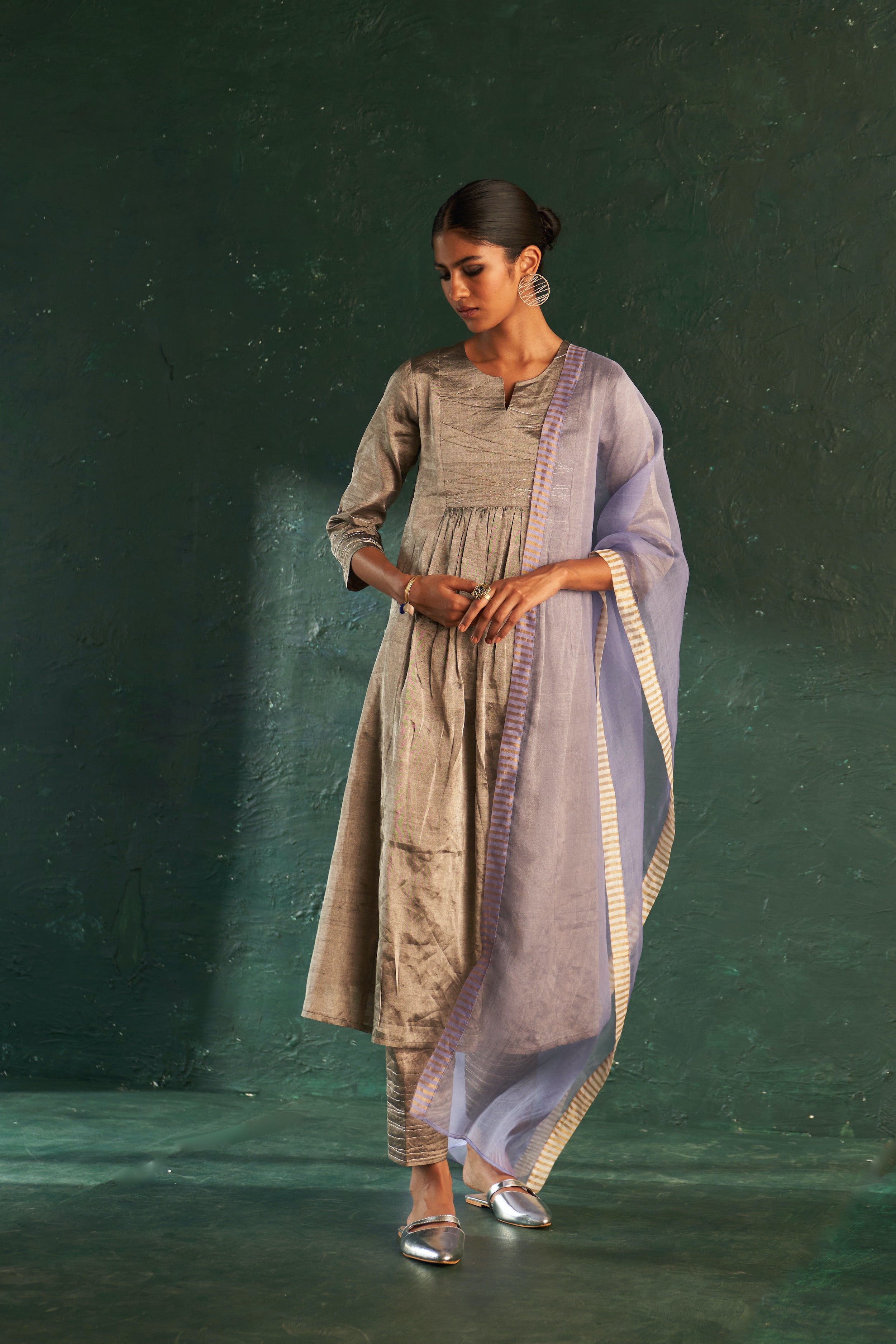 Designed in a regal silver hue, this gathered kurta set is crafted in classic tissue fabric. Subtle dori embroidery adds to its elegance. Paired with dori embroidered pants and organza dupatta , this contemporary suit set is the perfect start to festivities.