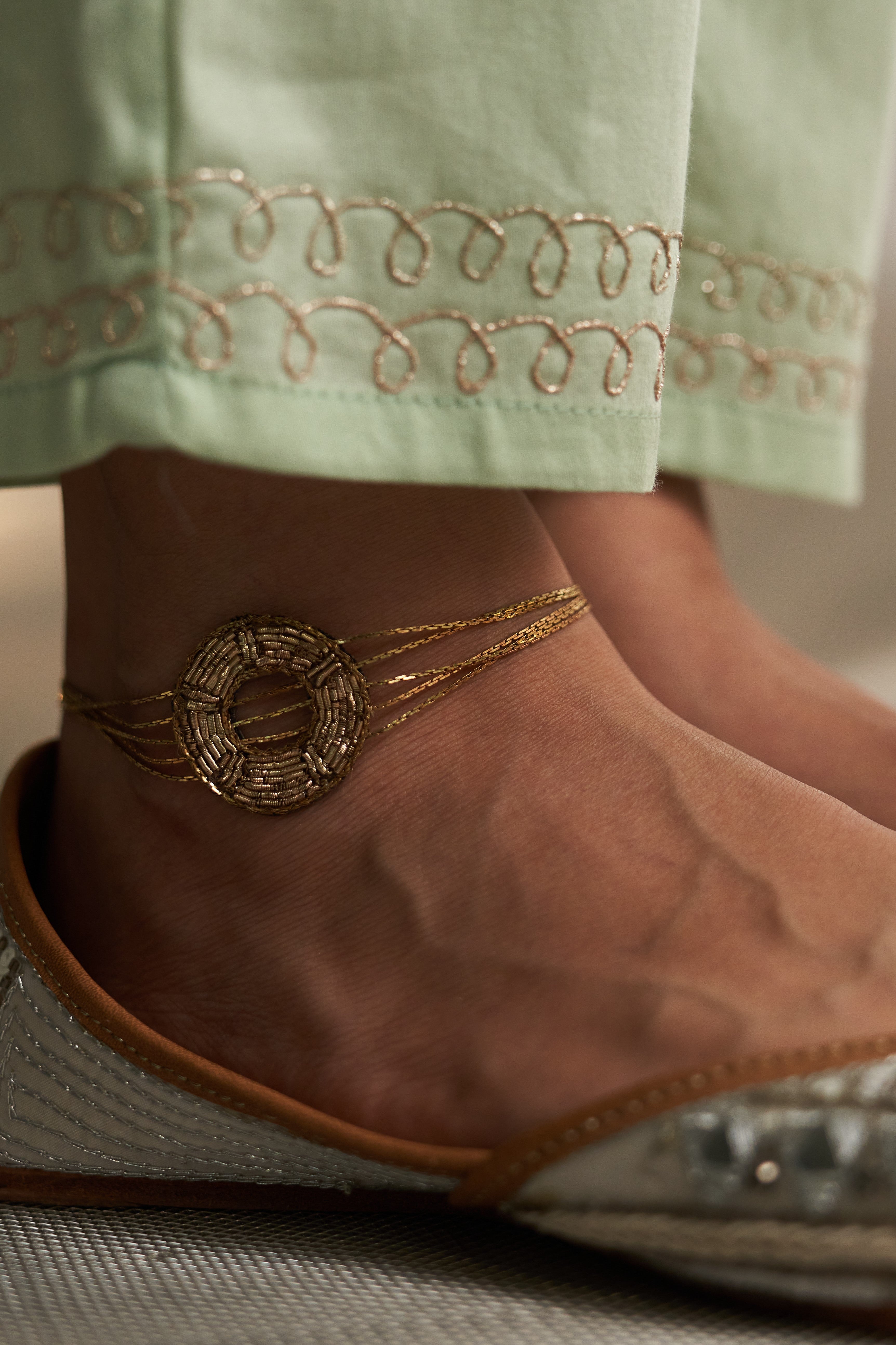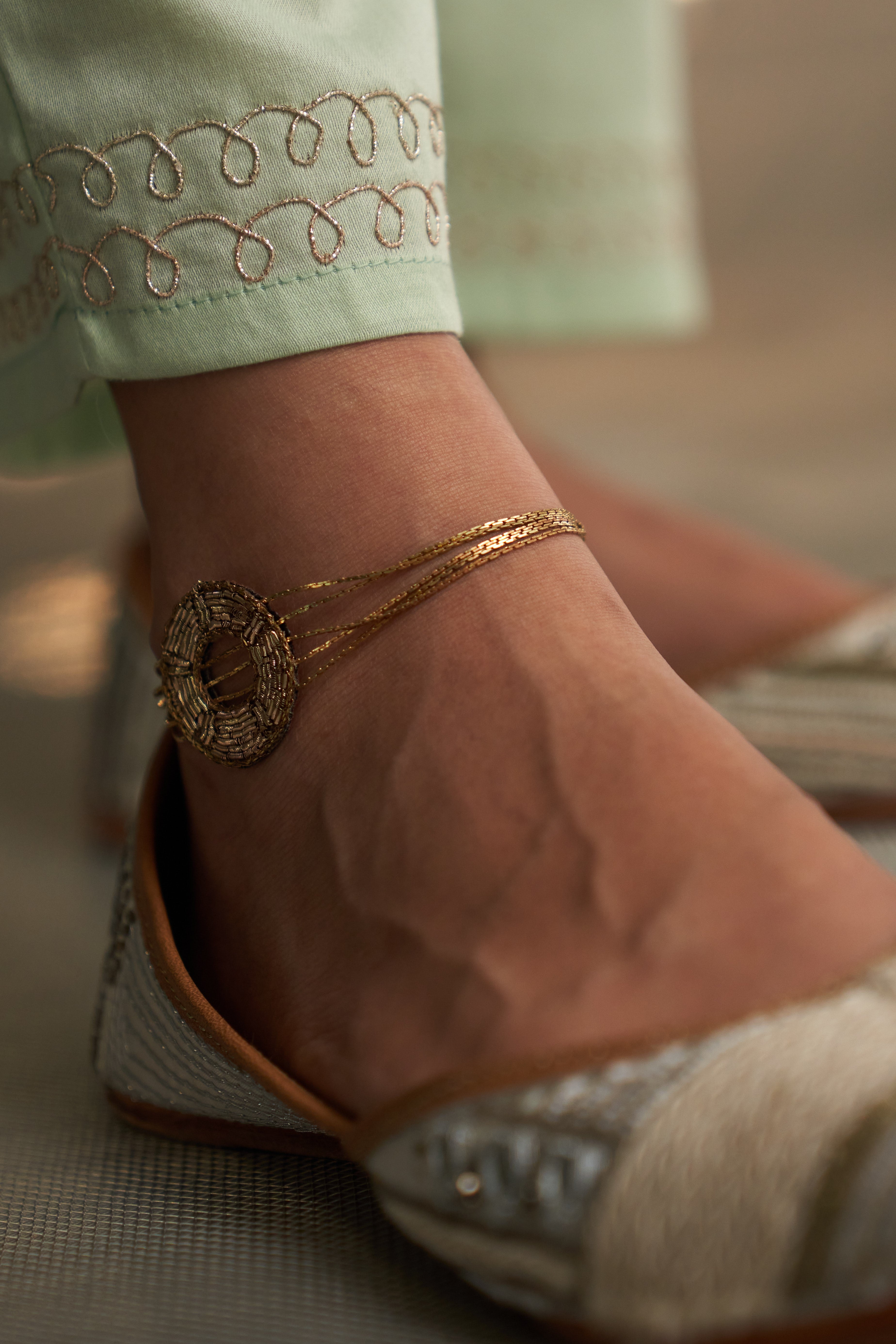 Blending modern design with traditional folk charm, this nakshi handwork piece in a gold finish is elegantly connected by a delicate metal chain. A true collector's item, it's an essential addition to any jewelry collection.