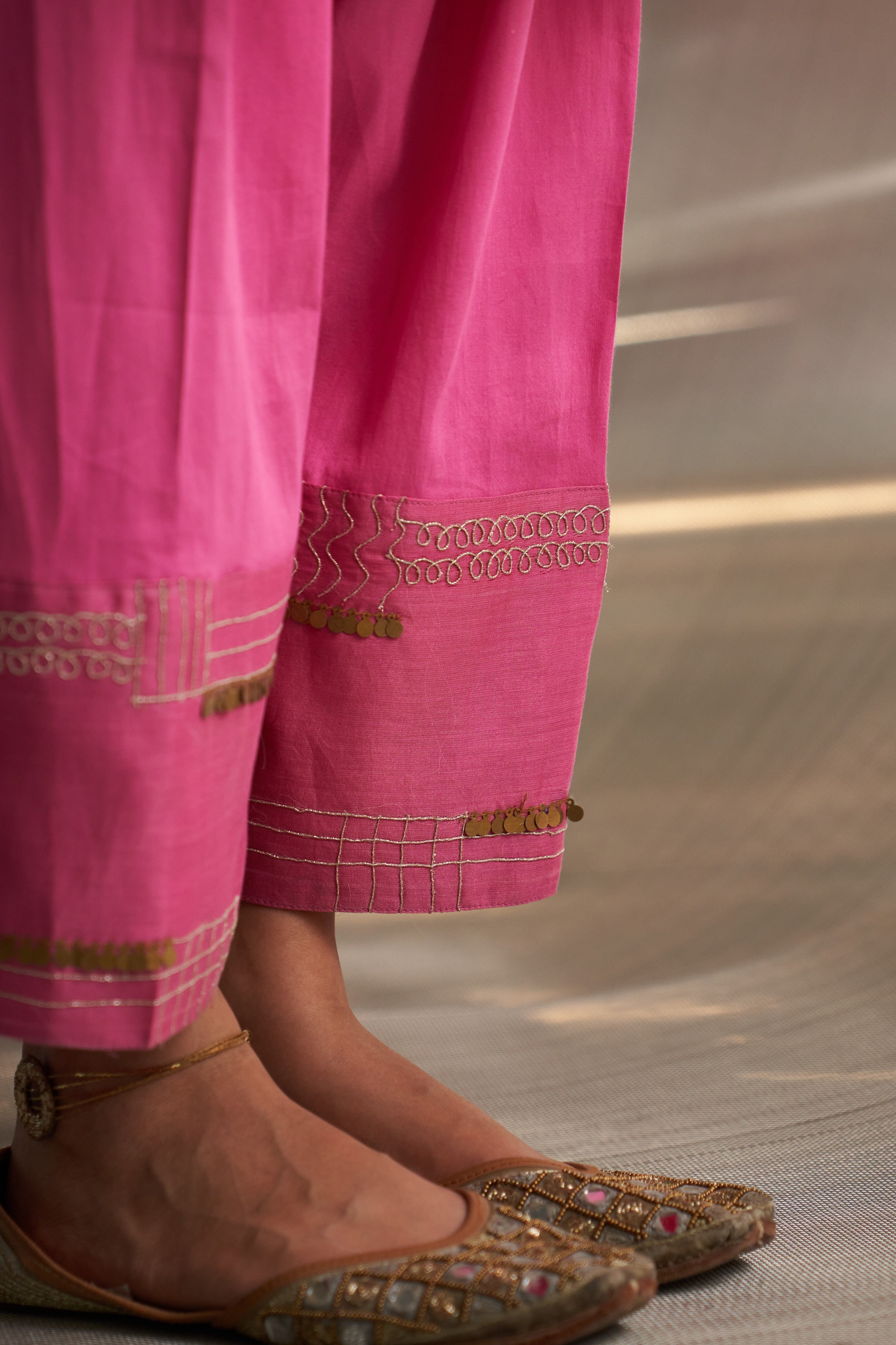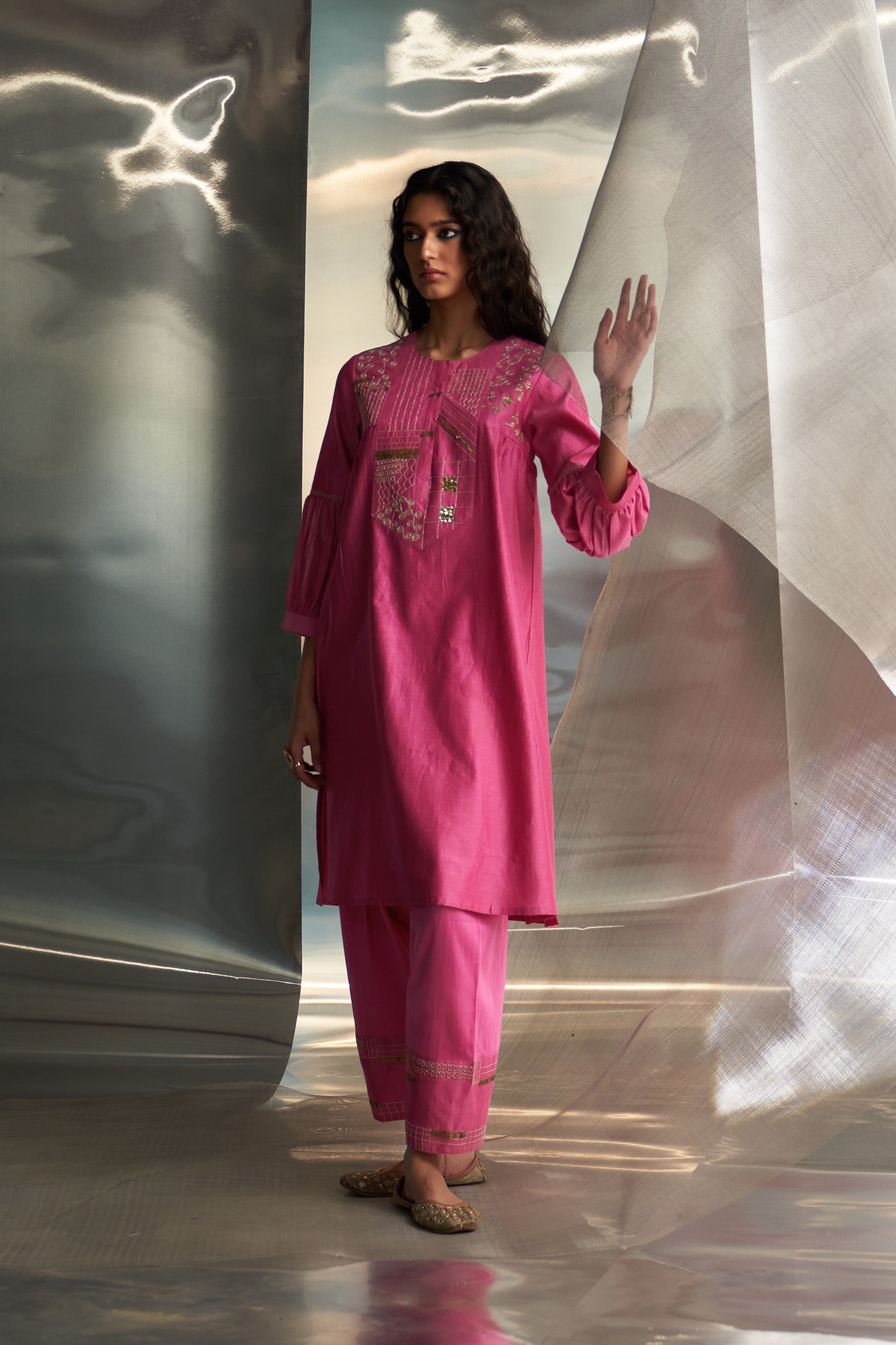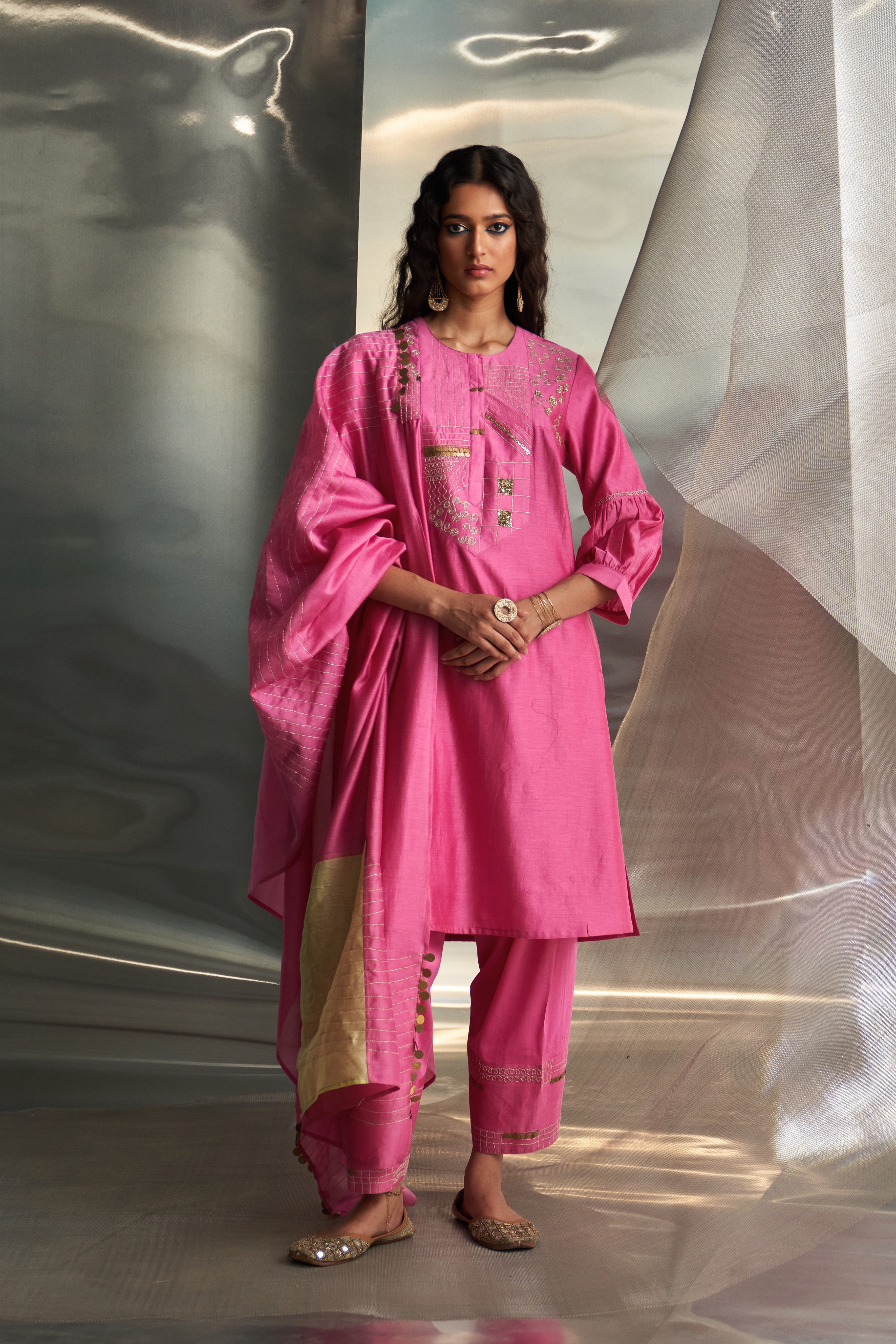 Indulge in regal opulence with this luxurious bloom pink kurta set, embellished with intricate booti work. The kurta boasts exquisite embroidery designs and patterns, lending a personal and distinctive touch to the ensemble.