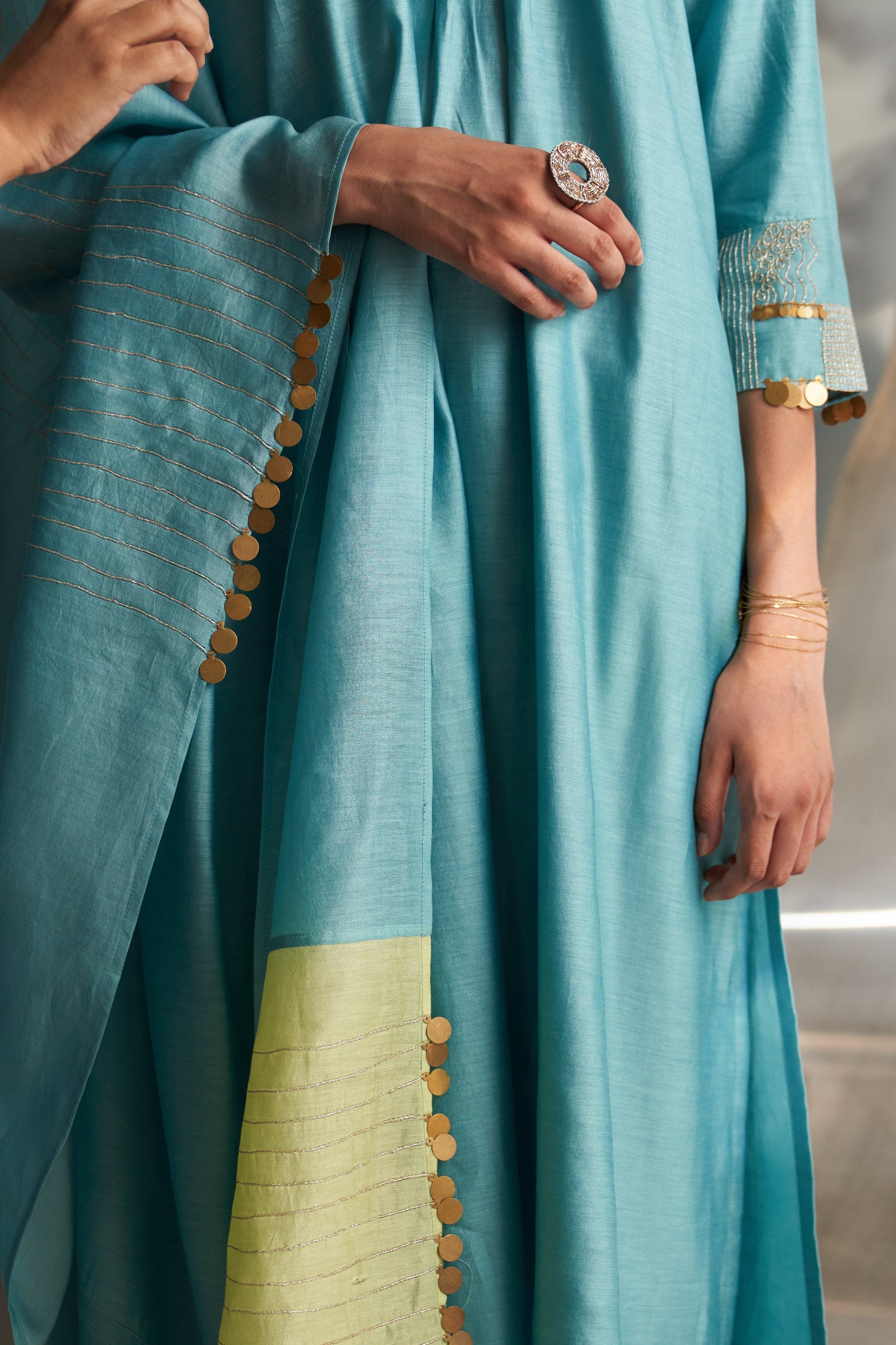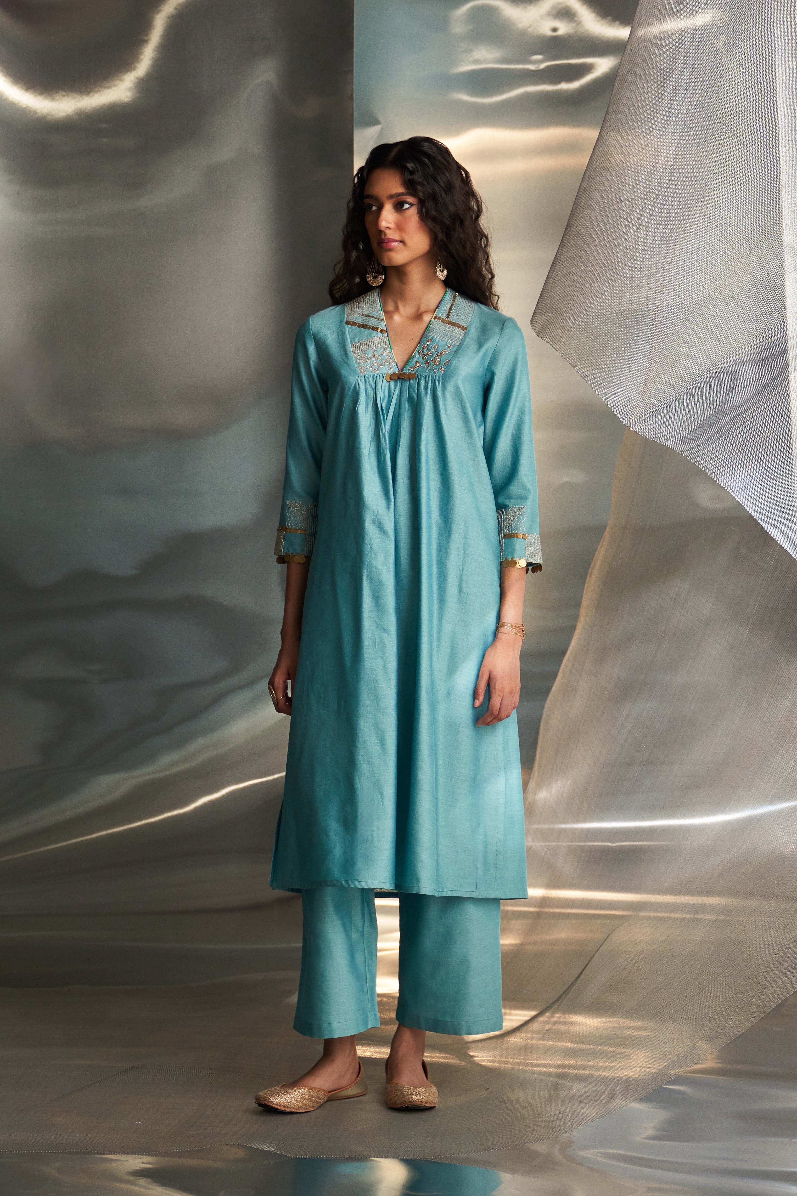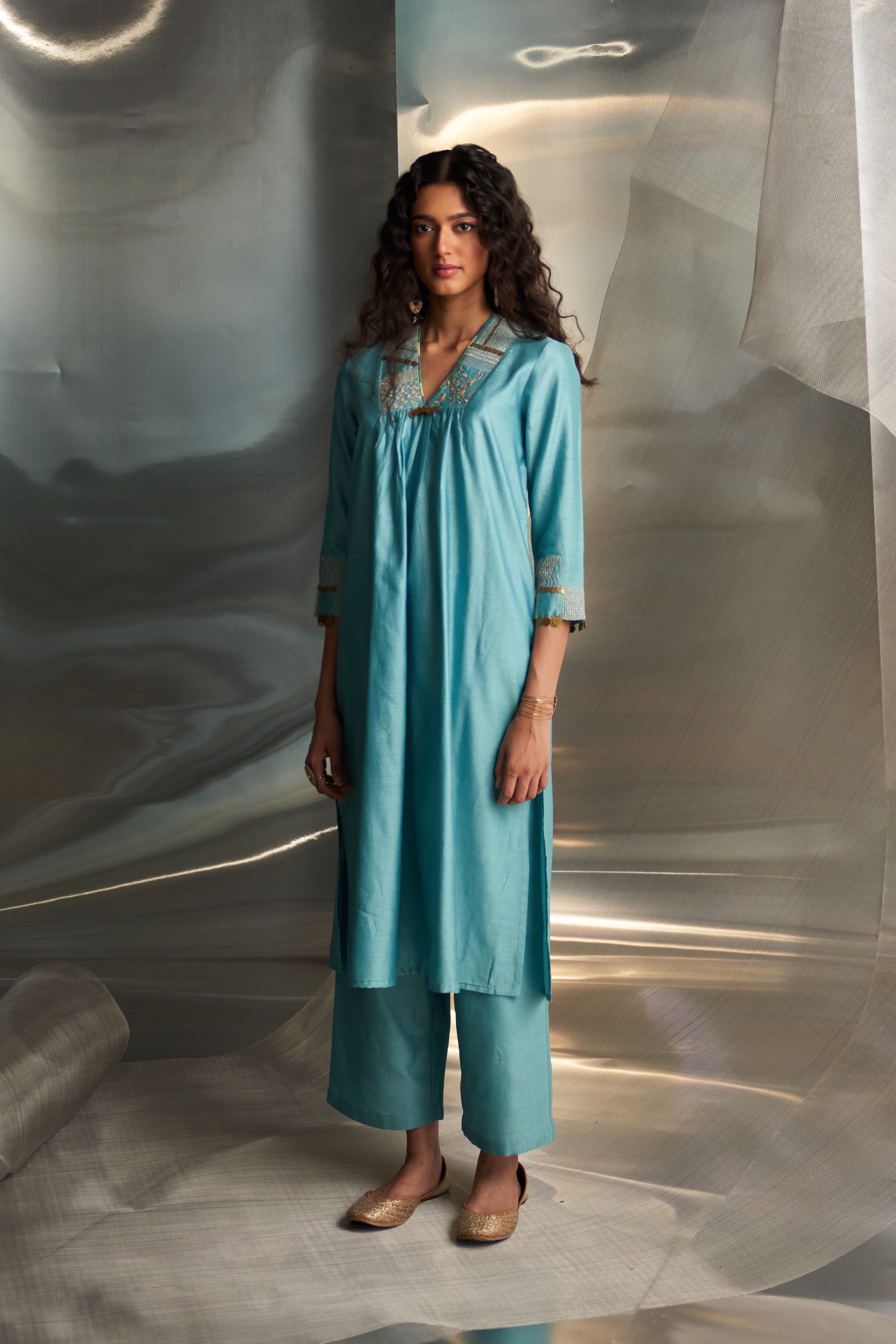 Immerse yourself in the grandeur of Cleopatra's era with this luxurious deep V-neck kurta set in powder blue. The kurta features intricate embroidery designs and patterns, adding a unique and personalized touch to the garment. The blend of various embroidery elements elevates the overall look.