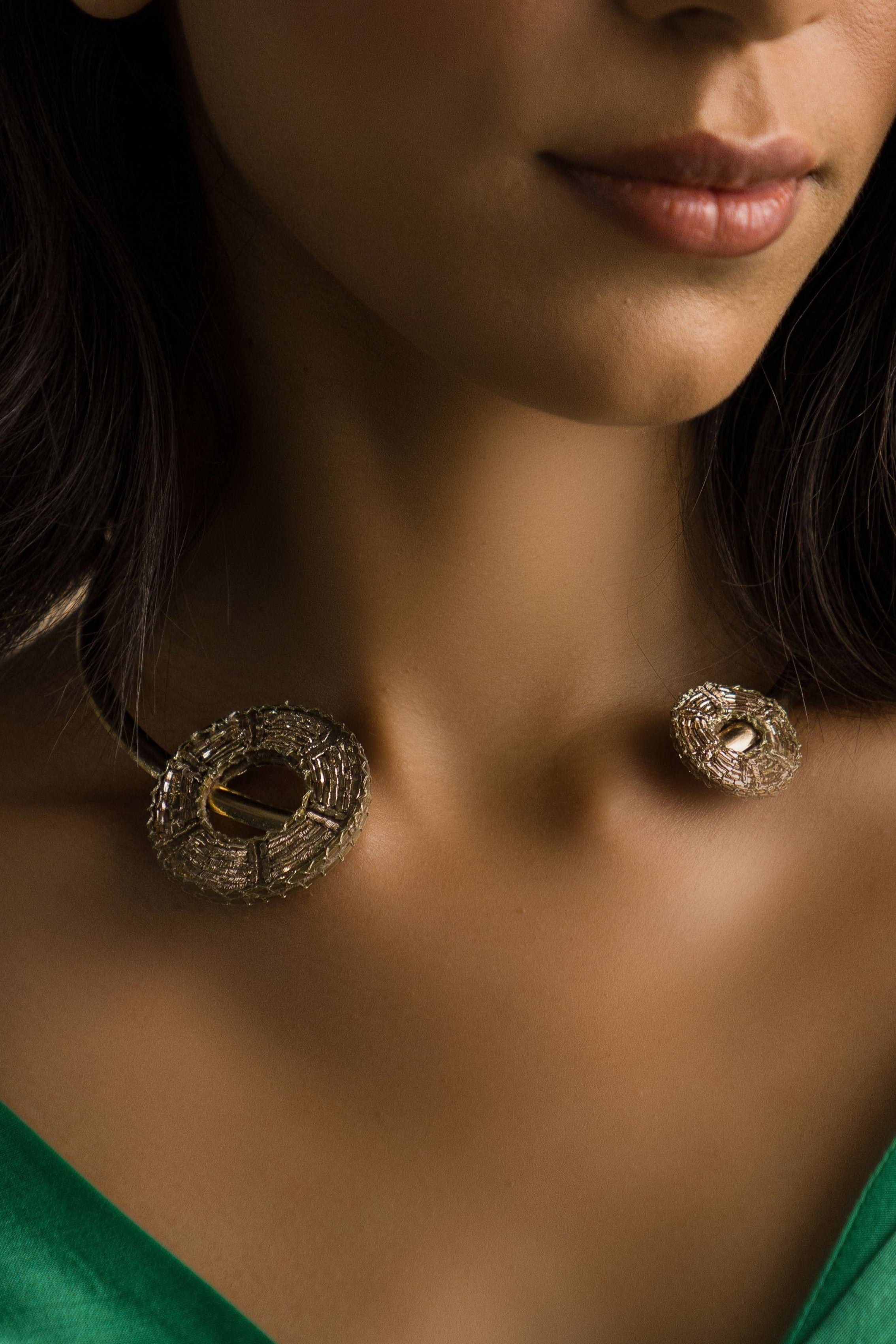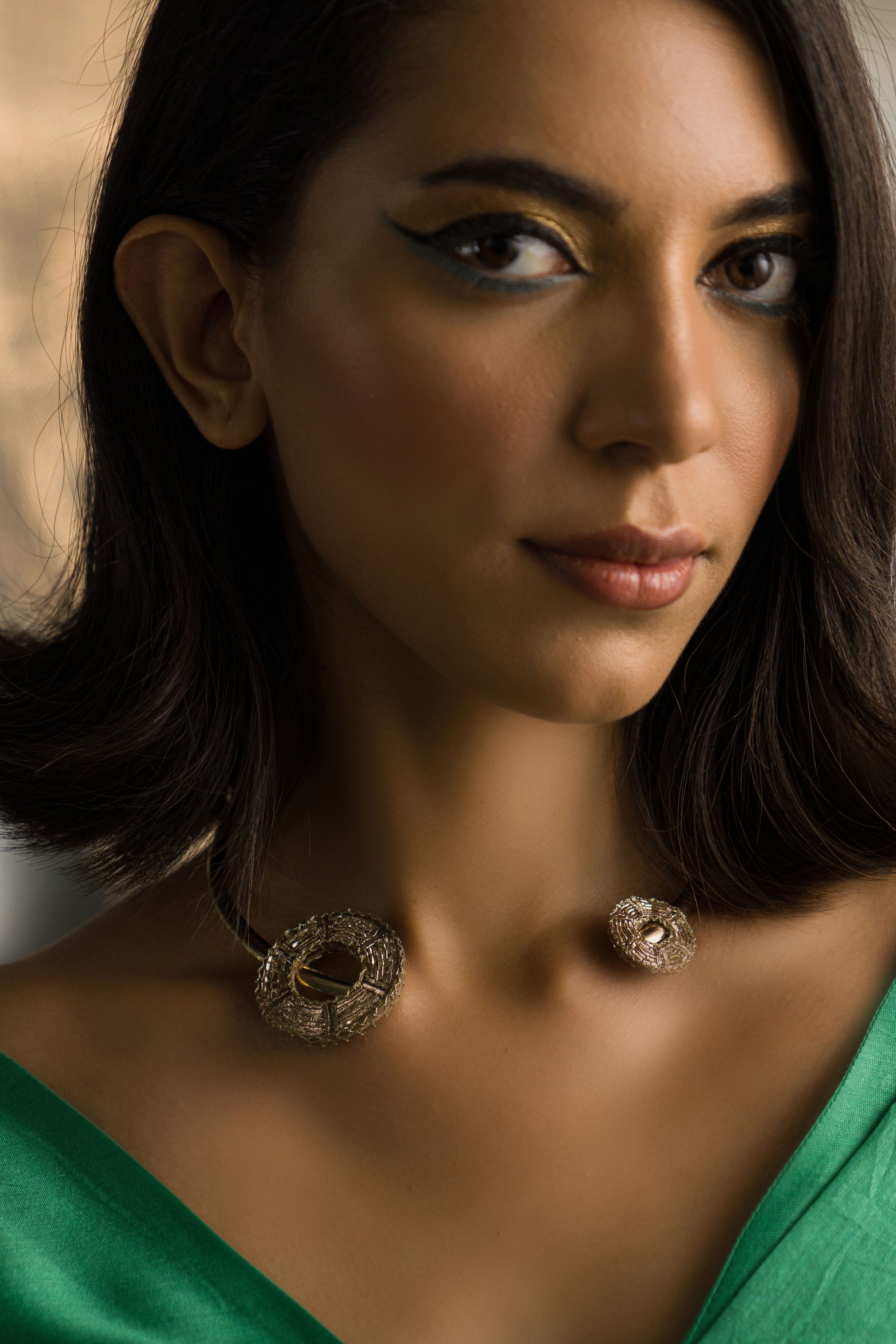 Combining contemporary elegance with traditional allure, this neckband features intricate nakshi handwork rings at both ends of the band, finished in luxurious gold. A must-have for collectors, it’s the perfect addition to elevate any jewelry collection.
