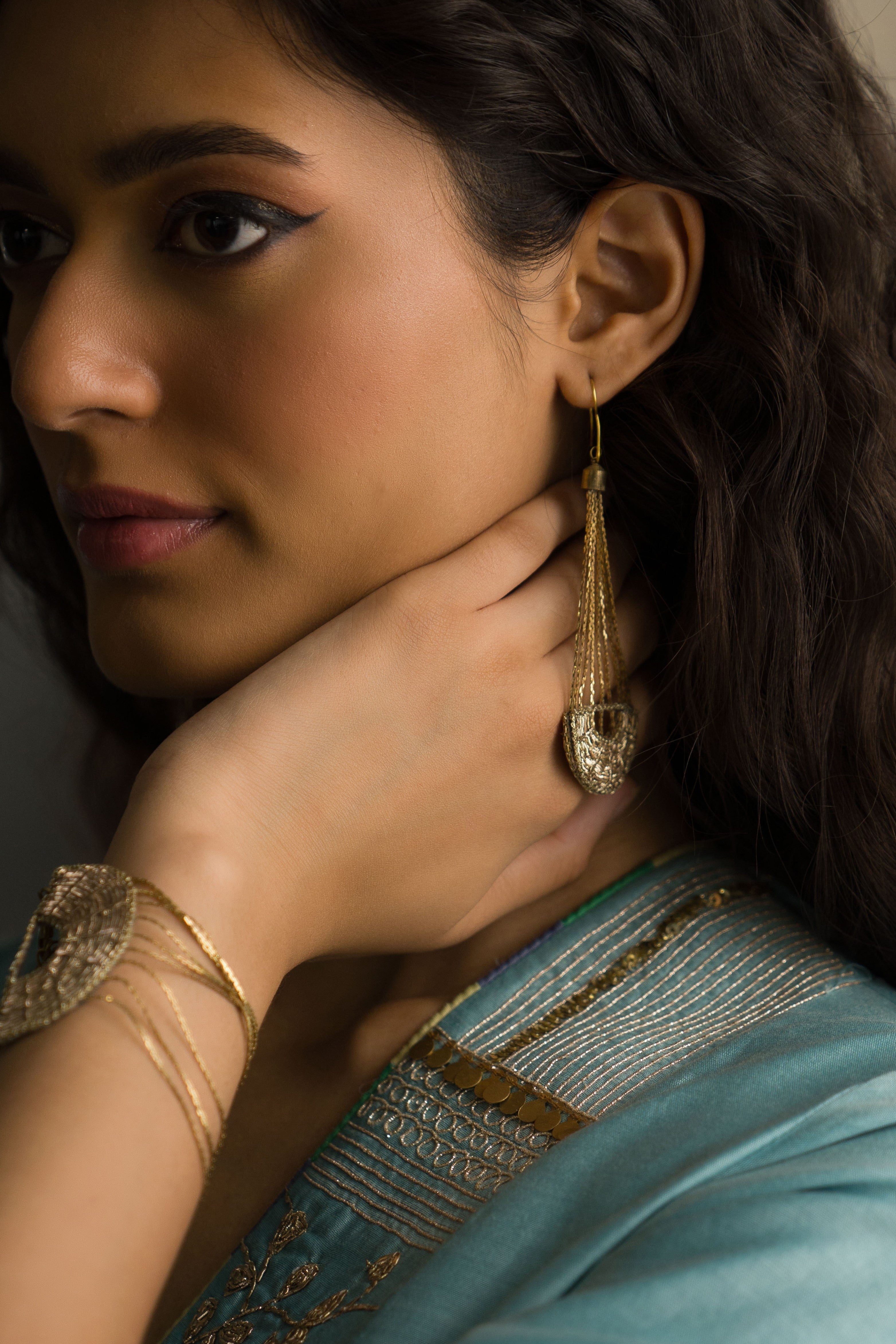 Short Dangler handmade with nakshi work which shines in a gold finish. Delicately combined with light wire placements.
