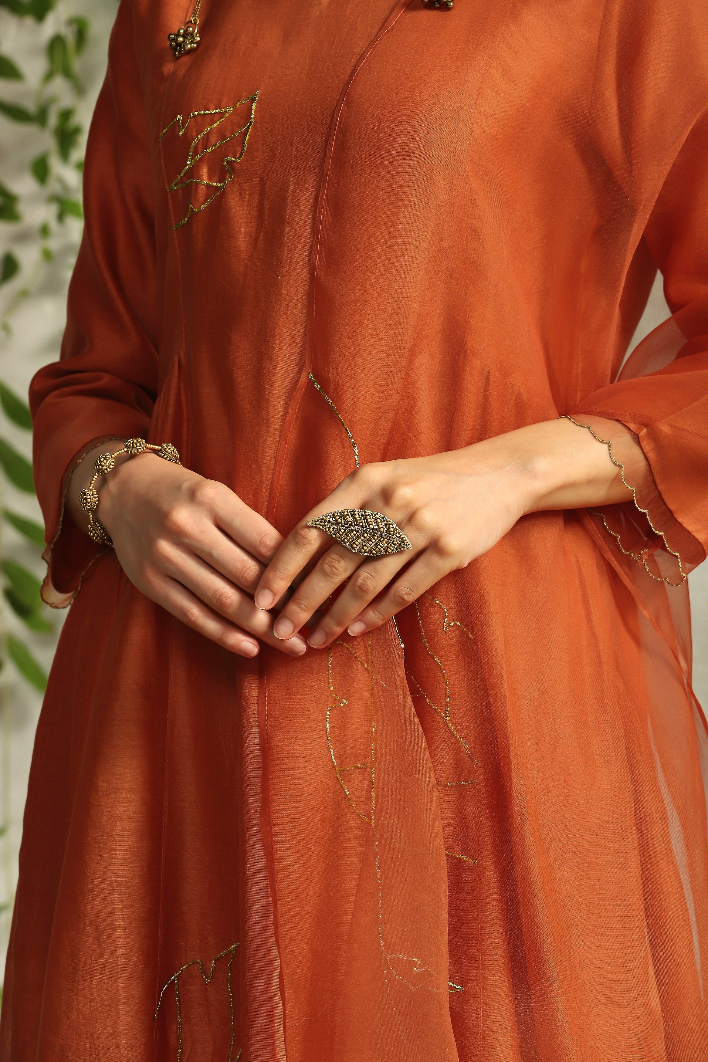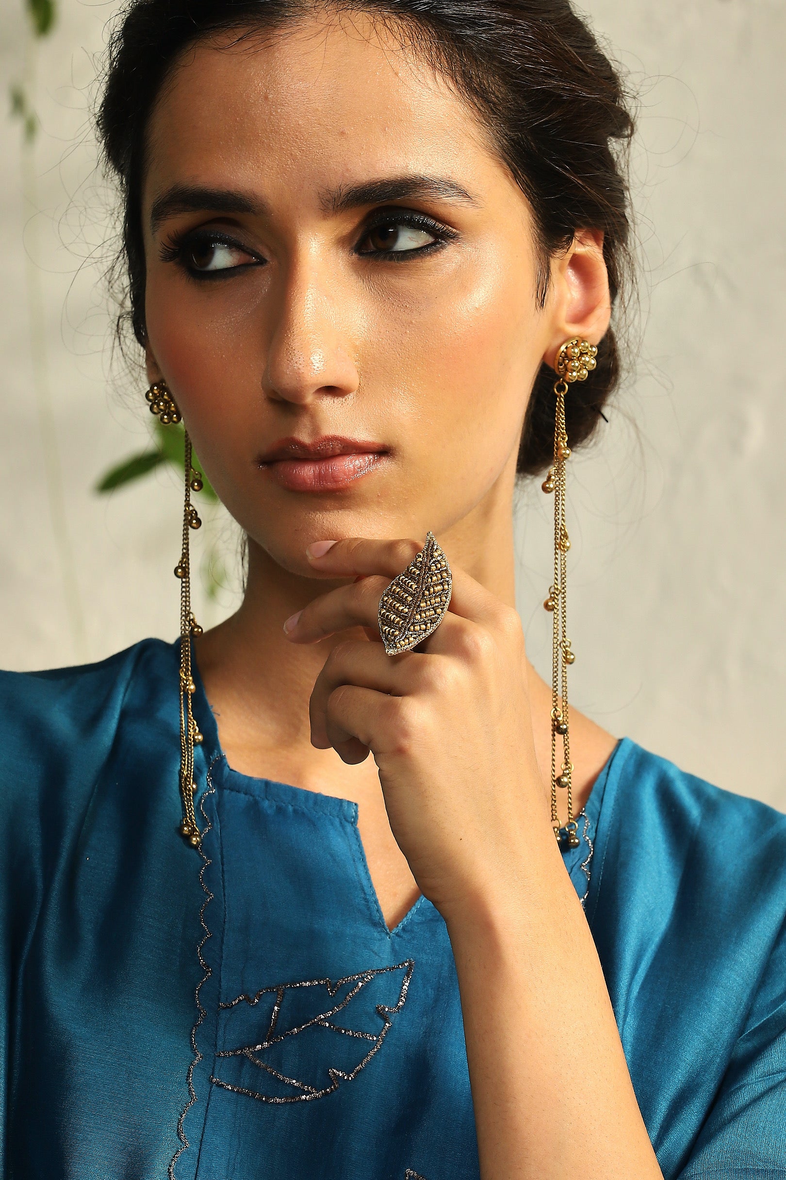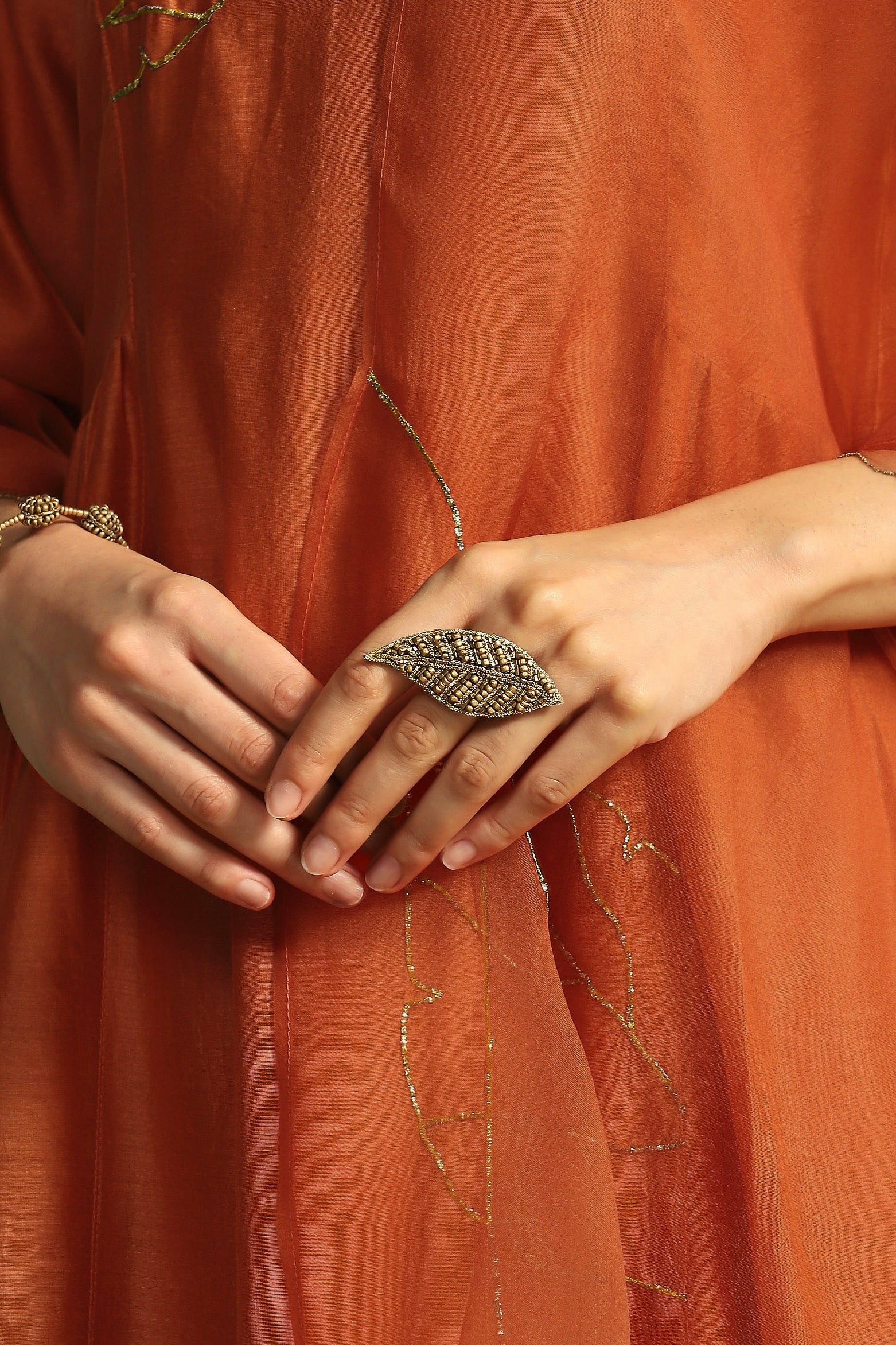 This hand-embroidered ring in a leaf shape, studded with beads, cutdana, and nakshi work, is a statement piece. Wear it to elevate any outfit.