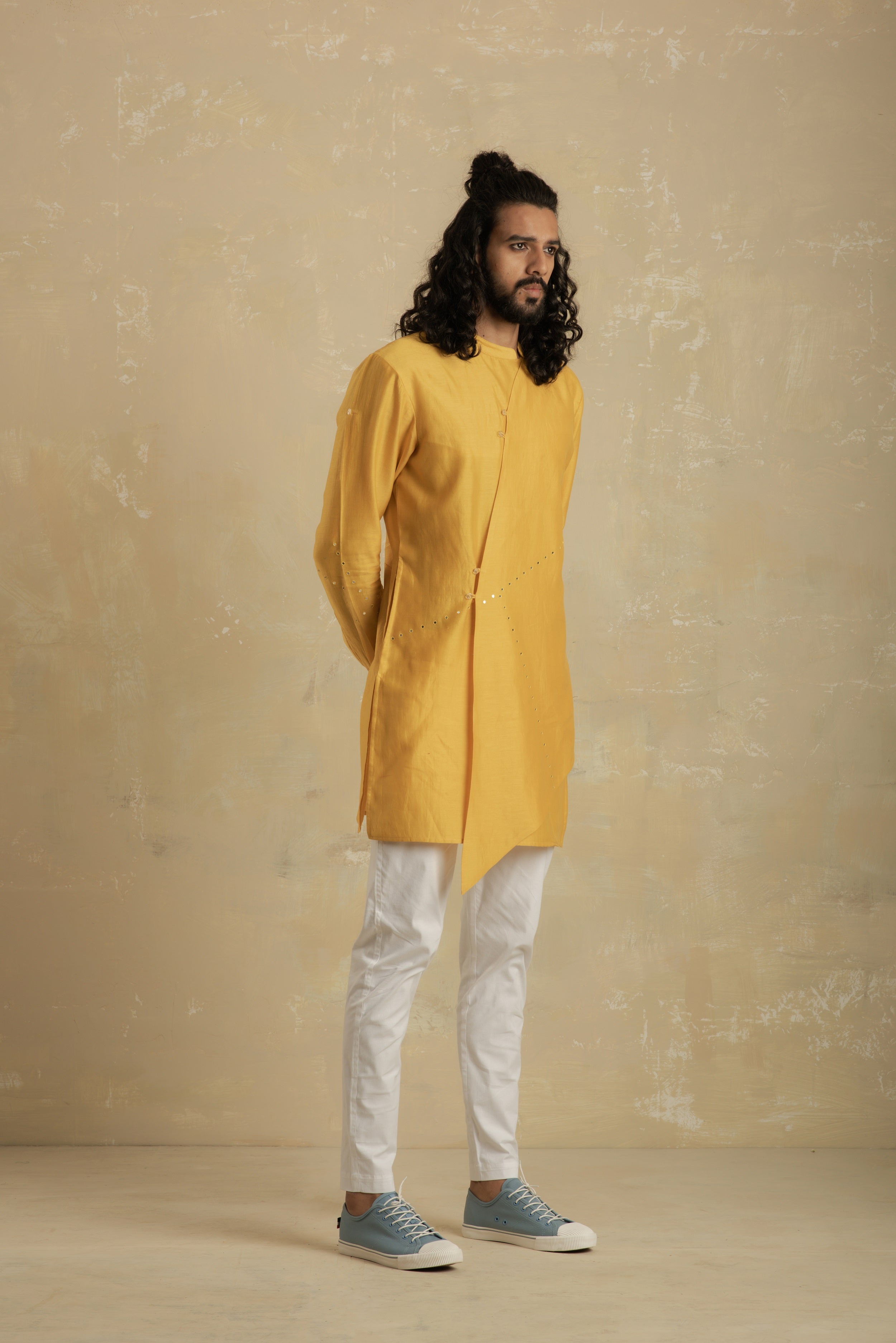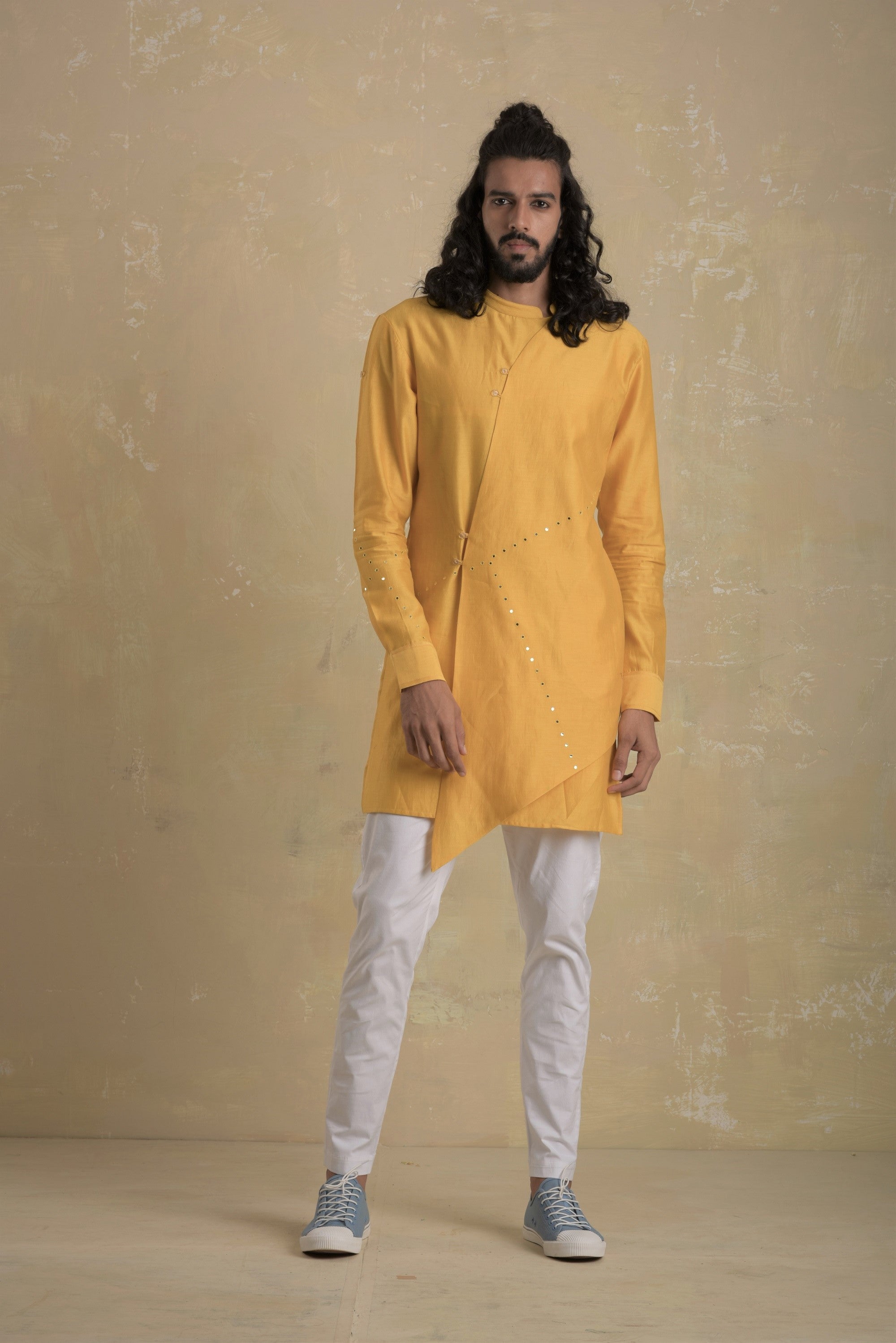 Chanderi diagonal short white kurta, overlapping front panels with mirror work embroidery on front and sleeve, paired with cotton pant. The look can be completed with chanderi mirror work Nehru jacket.