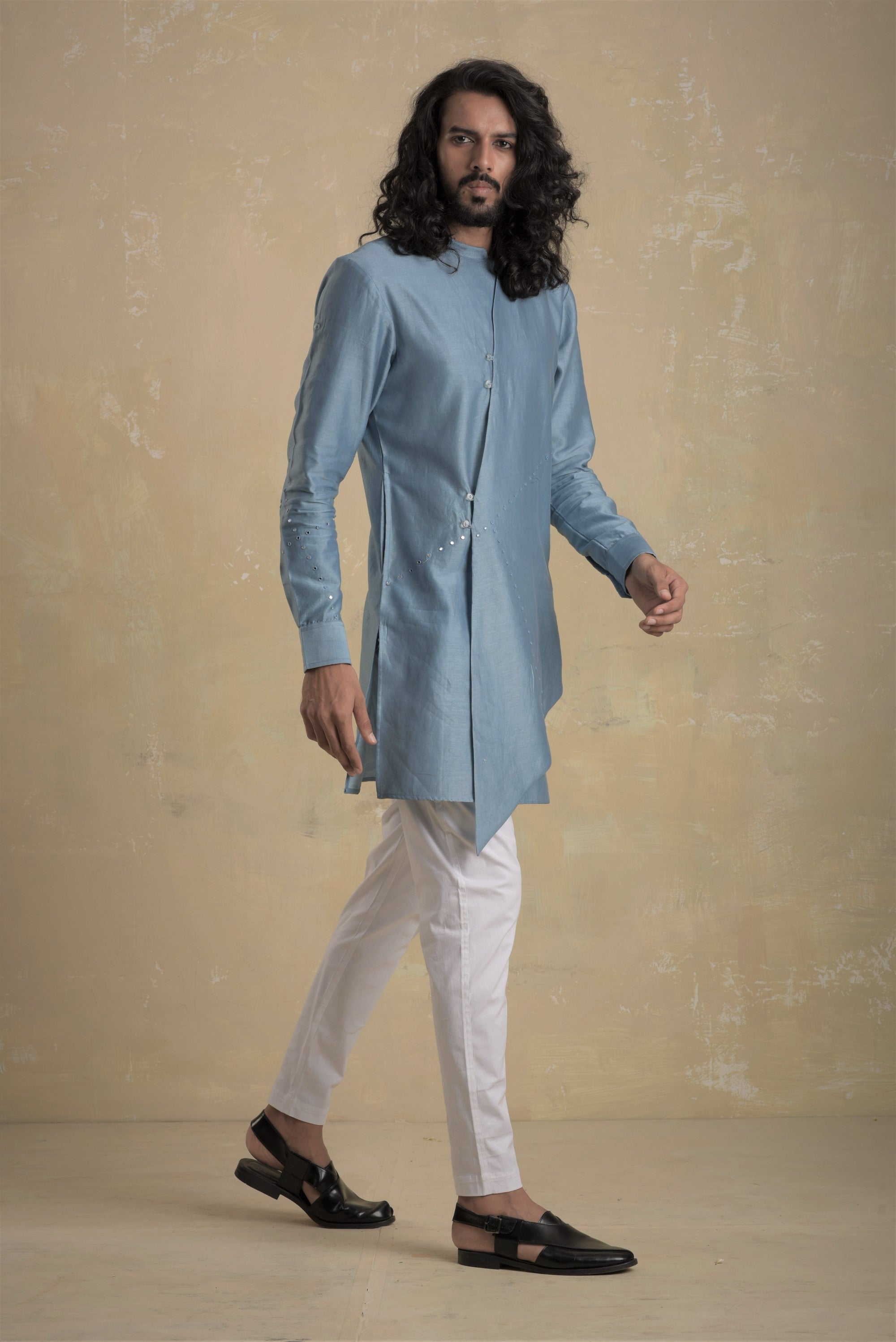 Chanderi diagonal short white kurta, overlapping front panels with mirror work embroidery on front and sleeve, paired with cotton pant. The look can be completed with chanderi mirror work Nehru jacket.