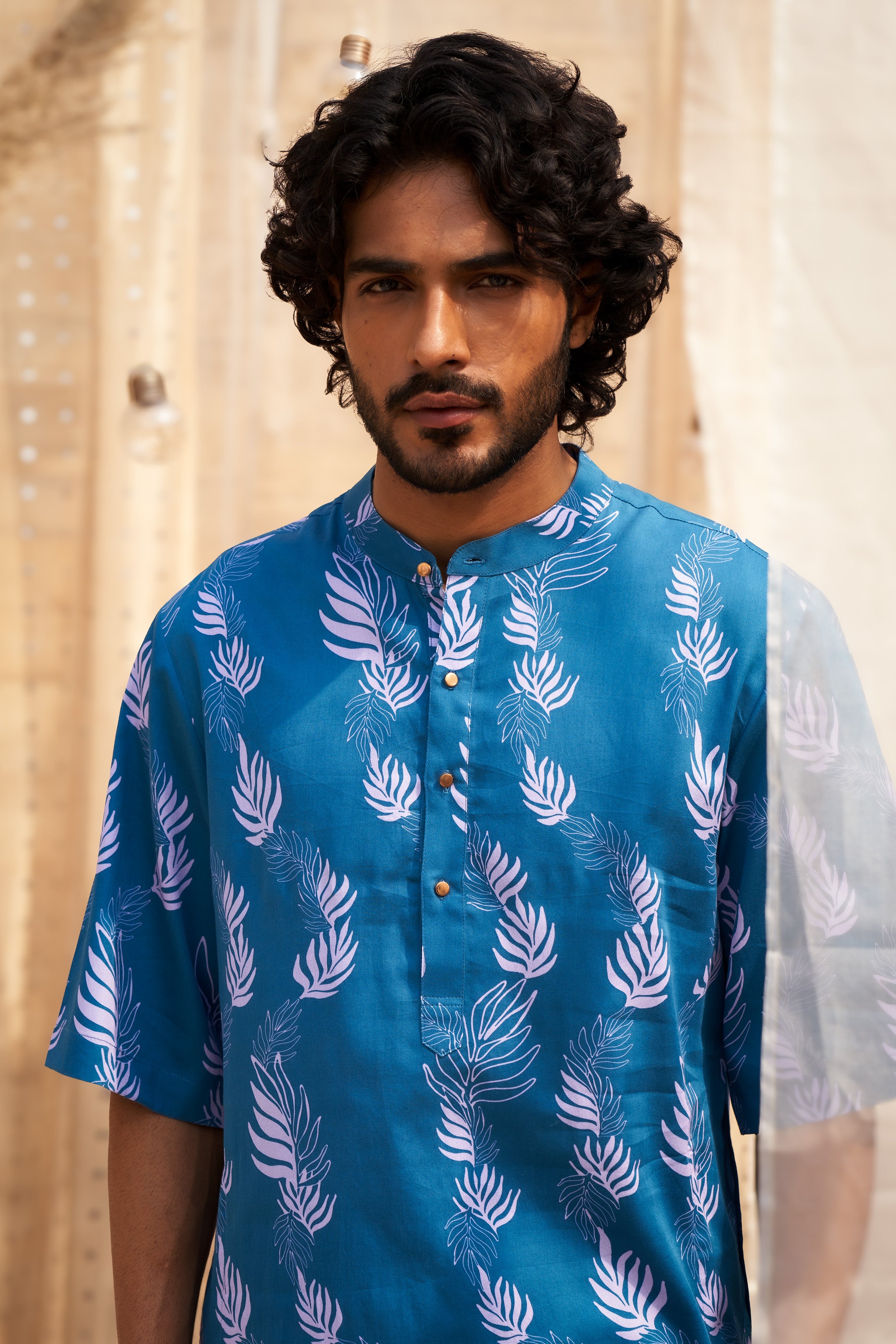 This ocean blue short-sleeve kurta features an eye-catching print, offering a refreshing and serene vibe. Paired with loose pyjamas in a complementing tone, this ensemble combines traditional charm with a modern, minimalistic design. Crafted from breathable fabric, it ensures all-day comfort.