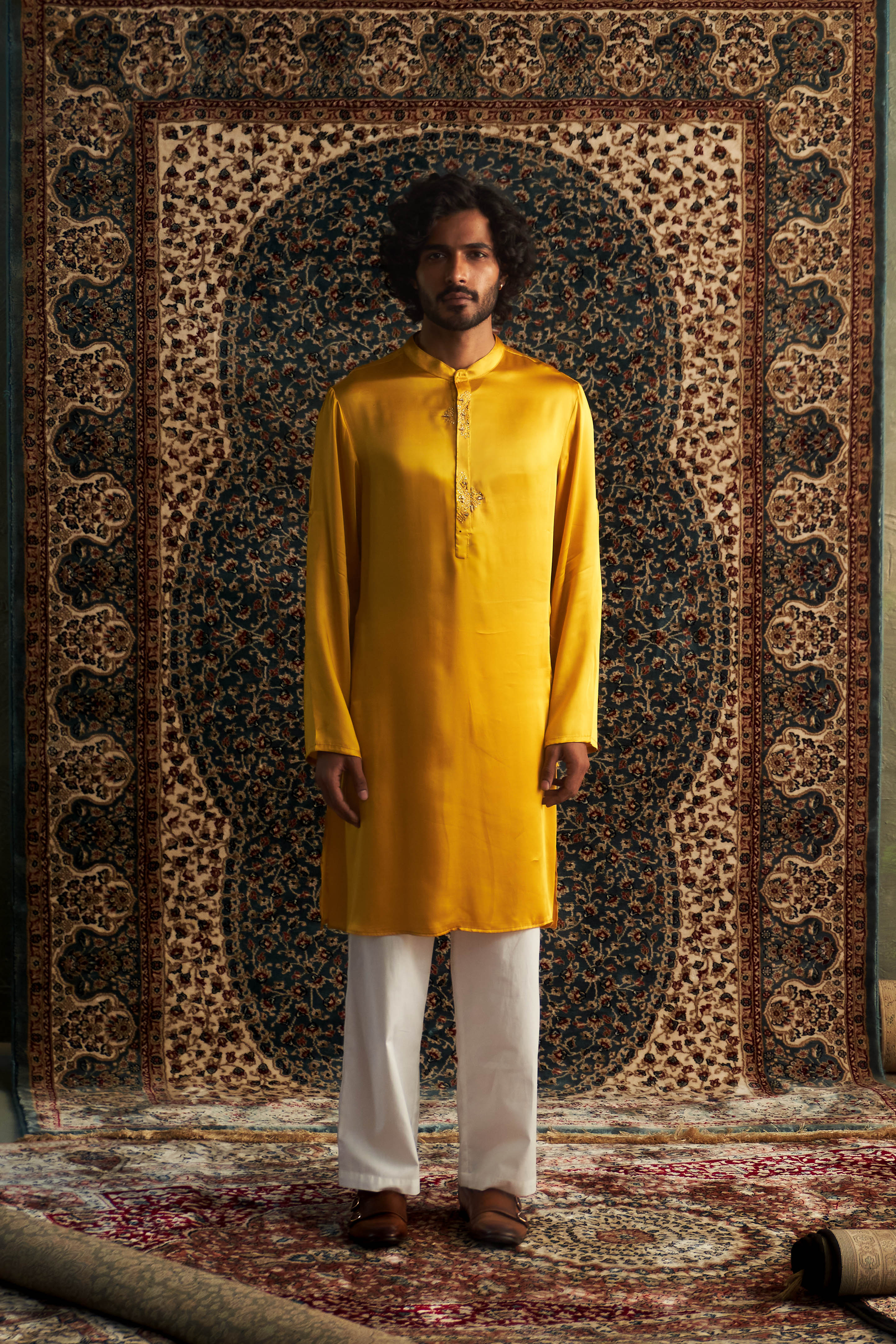 The Prarambh Embroidered Placket Kurta boasts a striking design with two half embroidery patterns on the placket, giving it a distinct appearance that is sure to turn heads. When paired with straight trousers, this outfit exudes a festive allure, making it ideal for those special occasions and celebrations. The combination of unique embroidery and timeless styling guarantees a memorable and effortlessly elegant look.