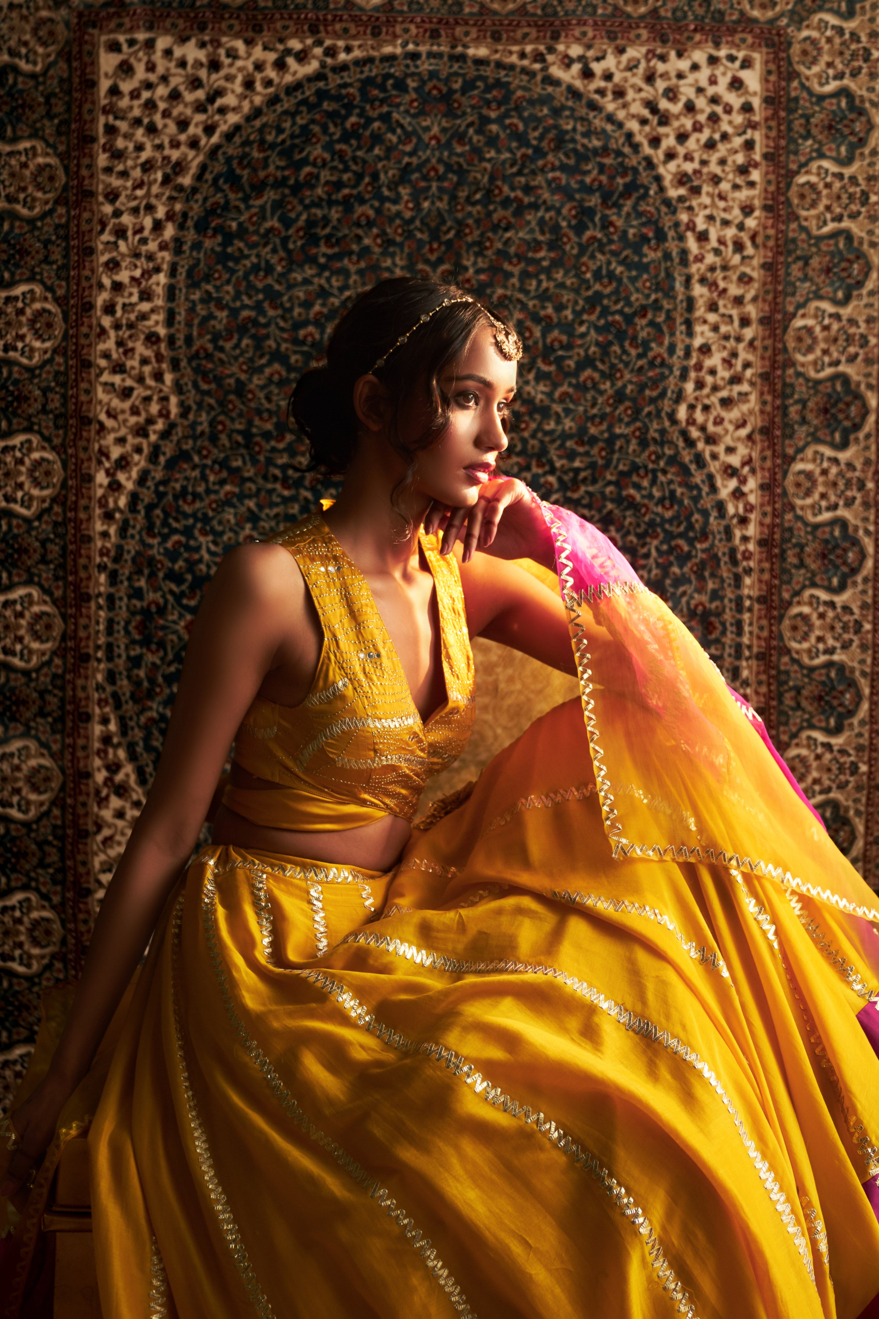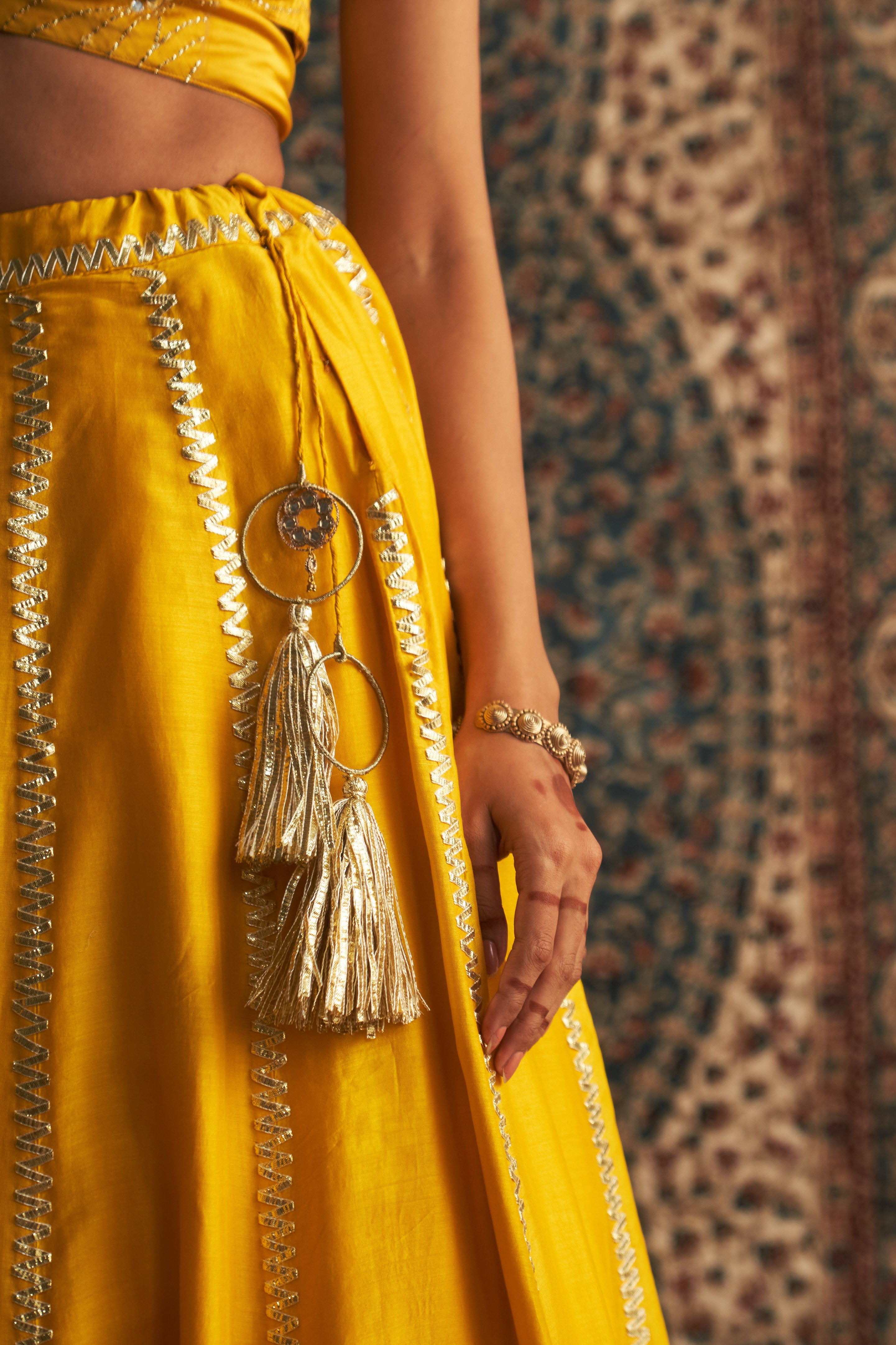 Perfect for any special occasion, this set exudes a regal presence, ensuring admiration wherever you go. The lehenga, adorned with exquisite tassels, sways gracefully, adding a sense of opulence and charm to the ensemble. Paired with a back tie up embroidered blouse, featuring intricate designs, the attire showcases rich artistry and timeless elegance. Completing the look is an organza dupatta, which adds an ethereal touch of beauty and sophistication, making this outfit a true statement of grace and luxury.