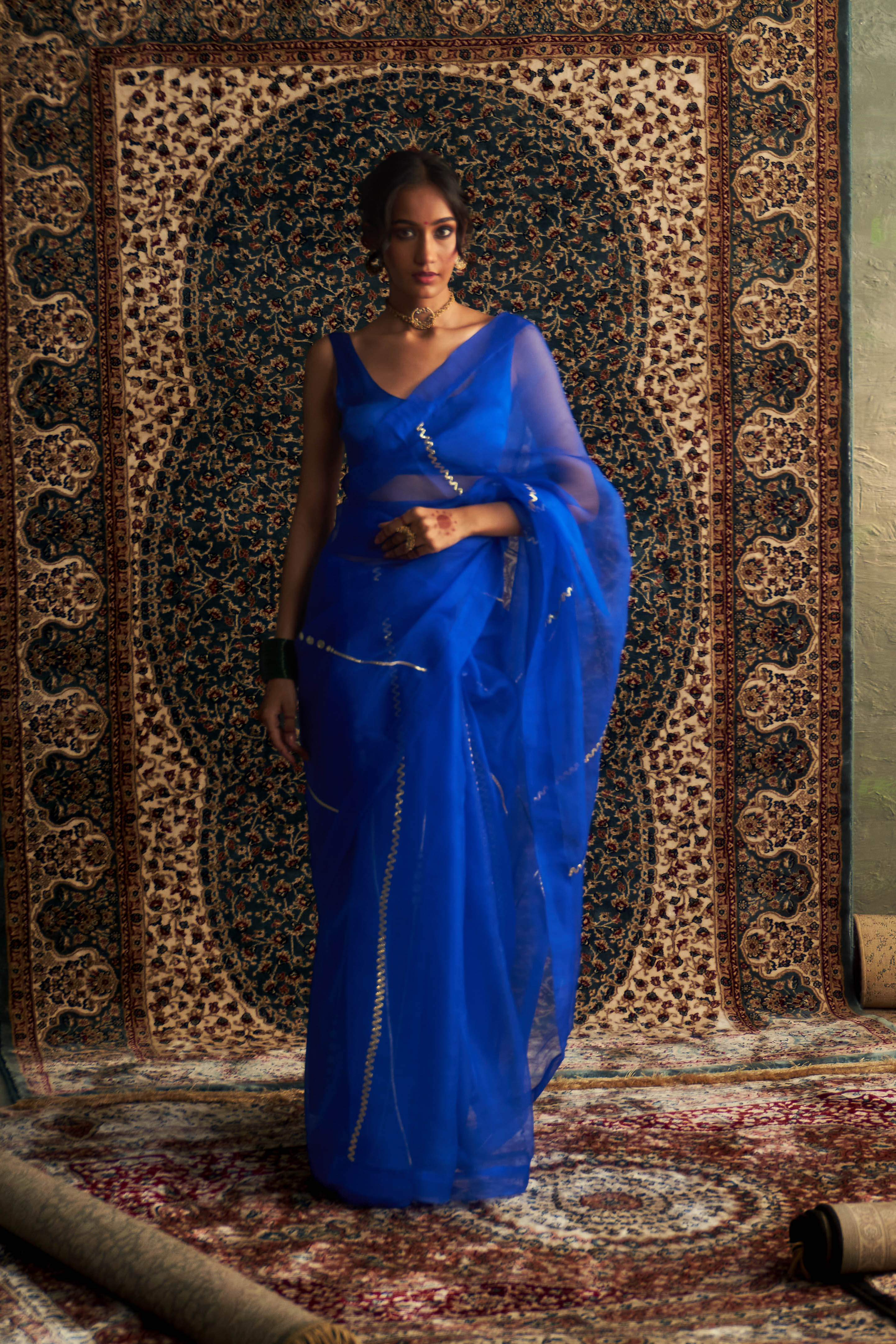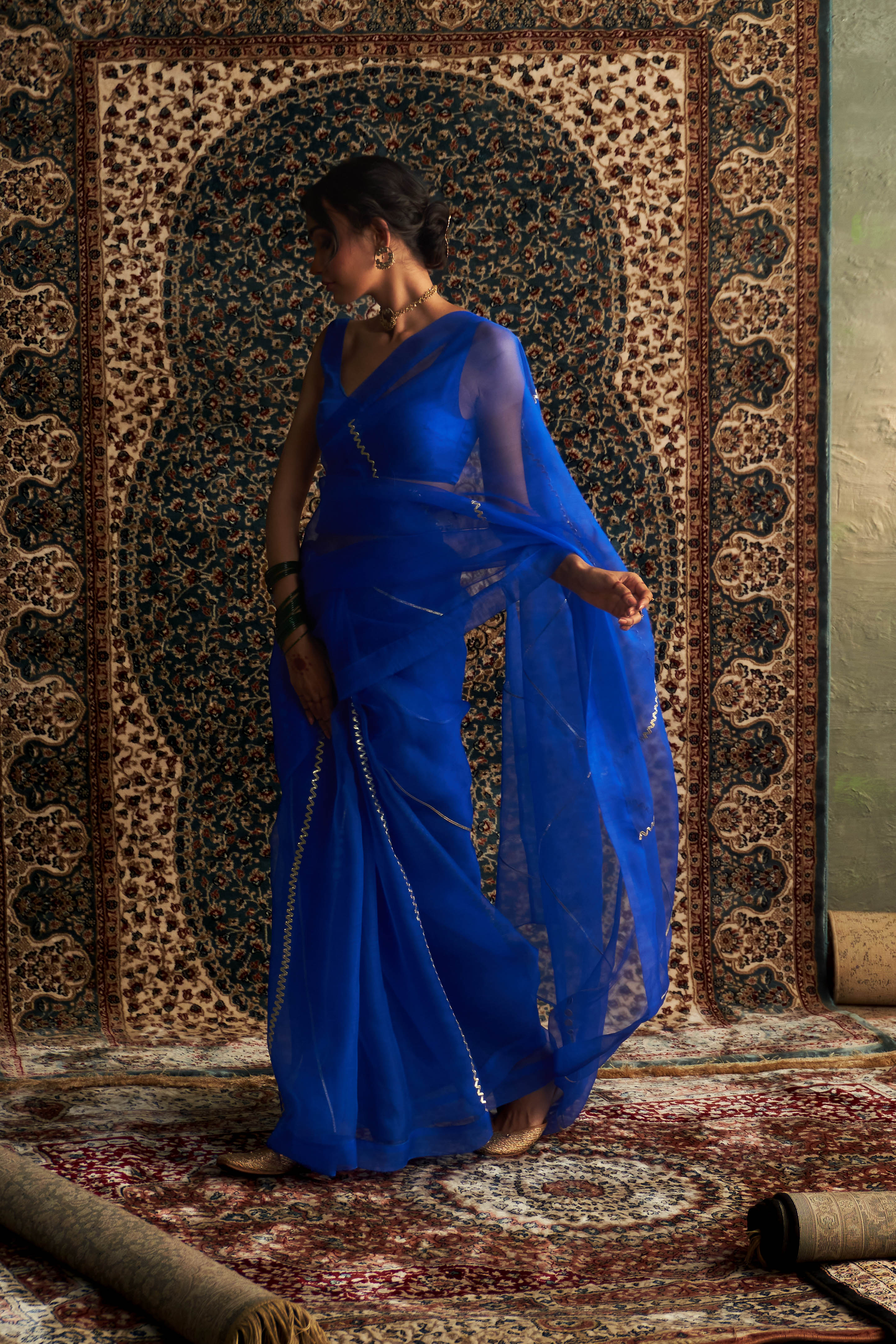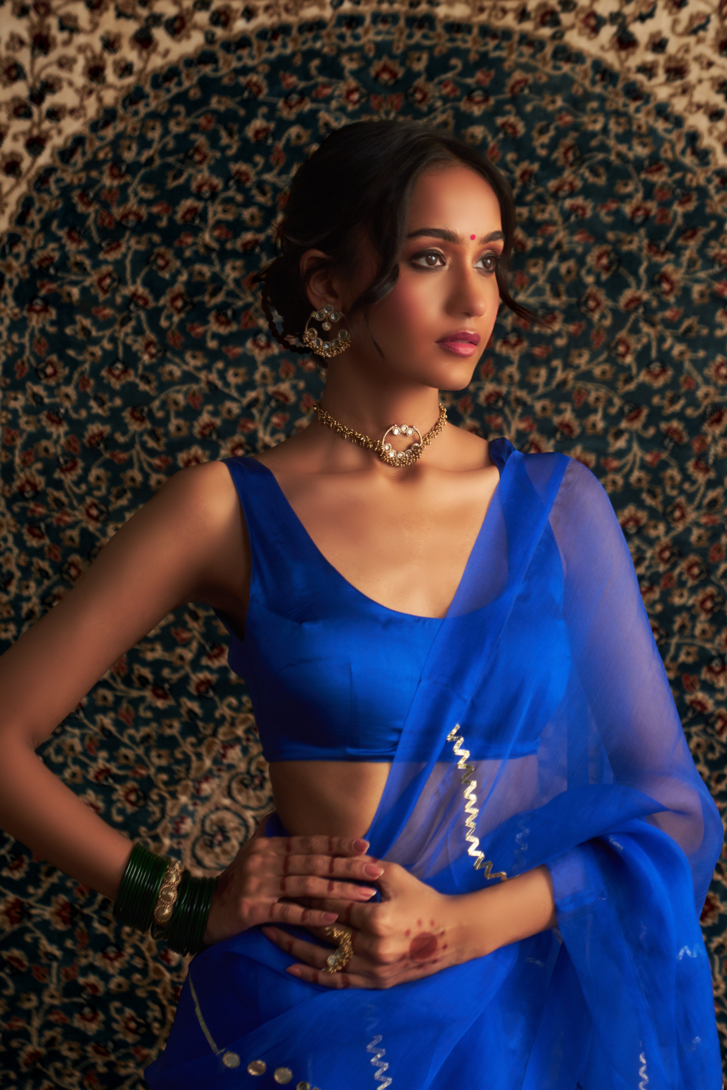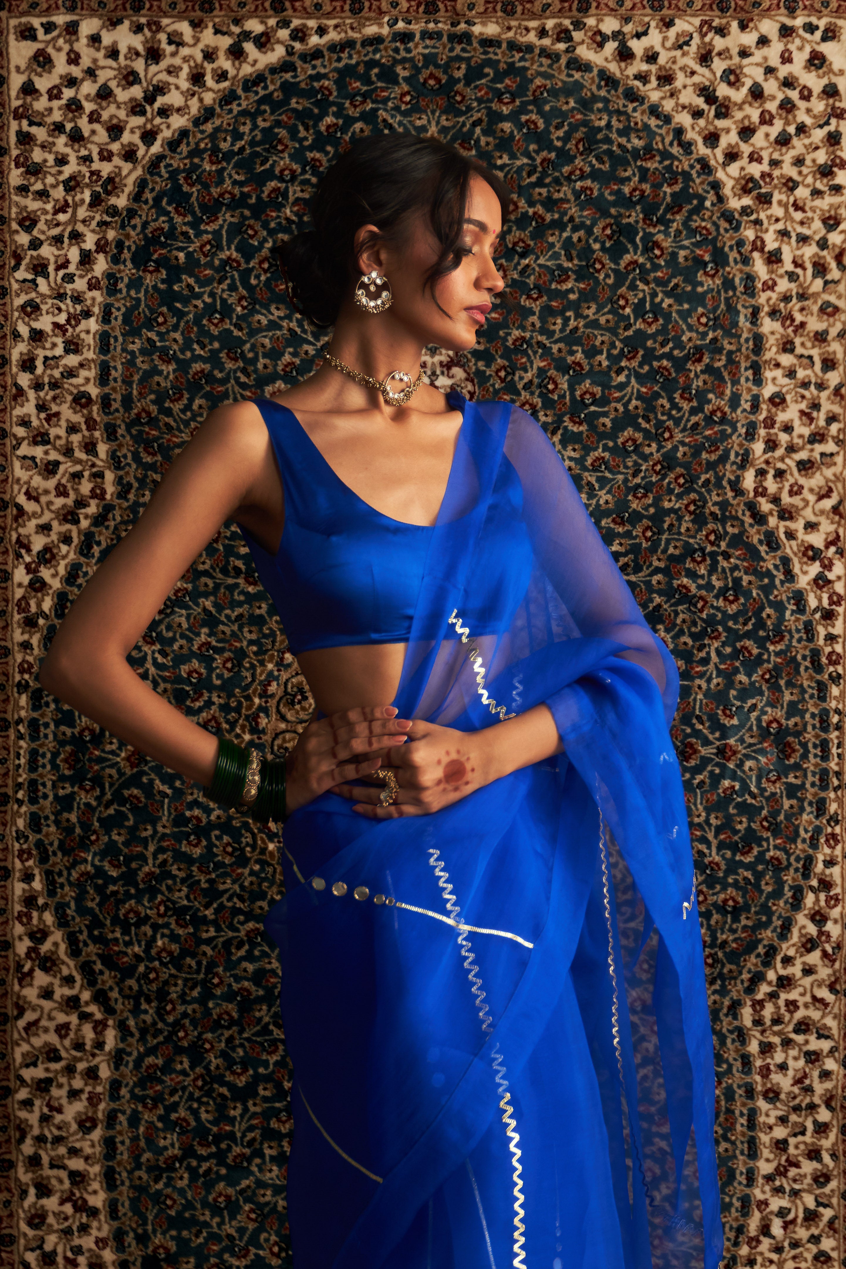 The blue organza saree is a perfect choice for Diwali, featuring intricate embroidery that adds both texture and elegance. Paired with a matching blouse, this ensemble creates a seamless and sophisticated look. The delicate organza fabric drapes beautifully, accentuating the detailed embroidery, while the coordinated blouse enhances the outfit's harmony. Ideal for festivities, this combination ensures you make a chic and stylish statement during the festivities.