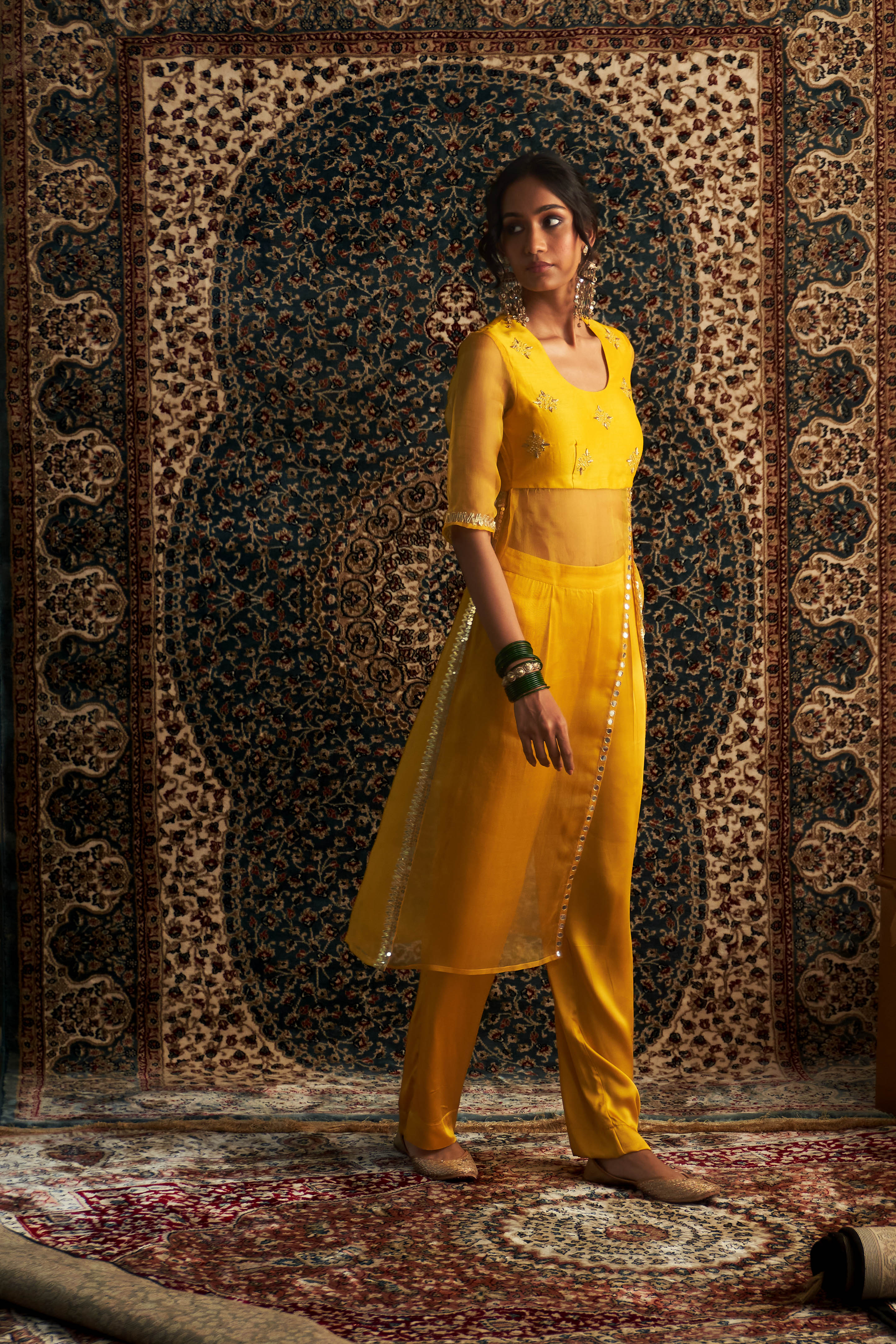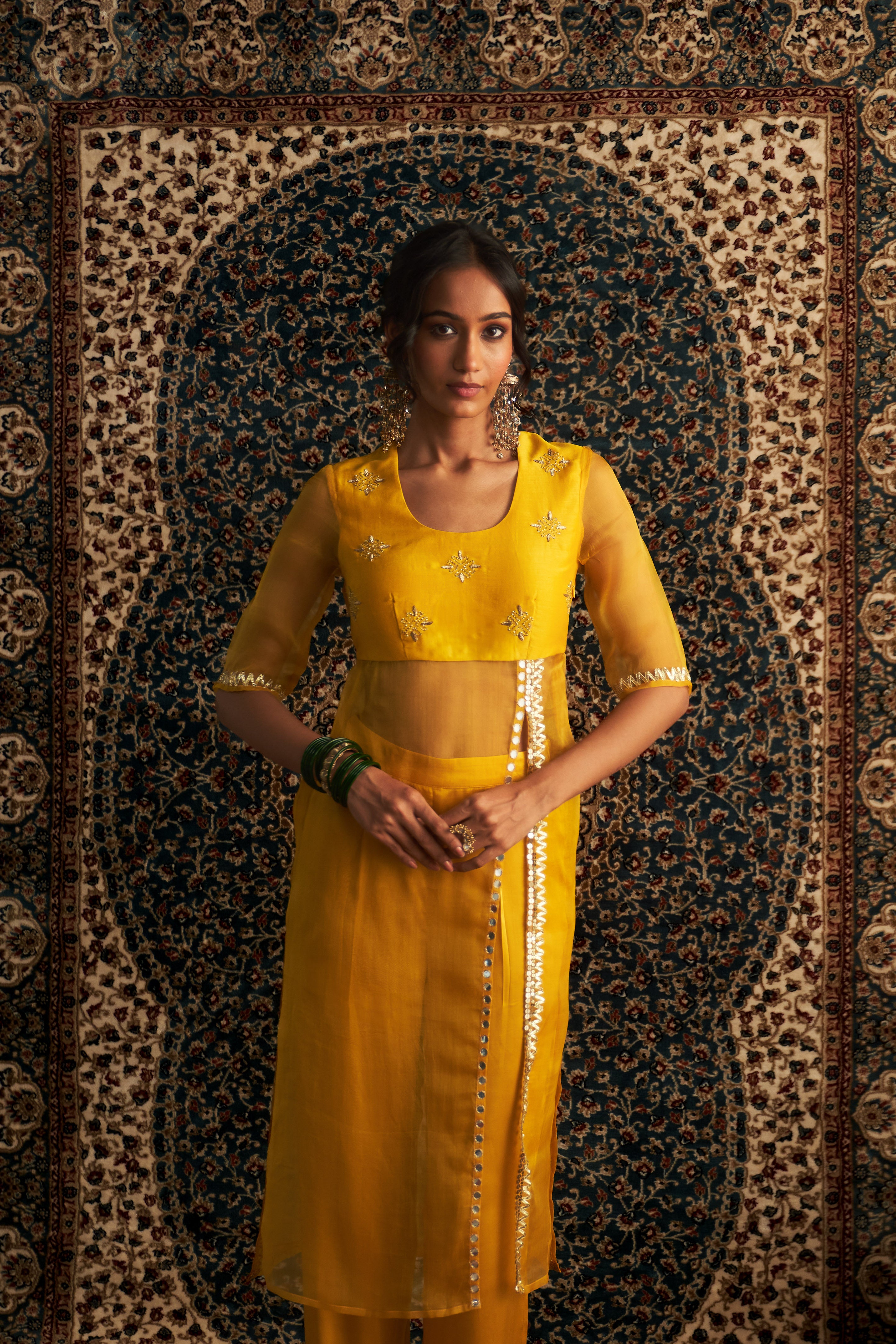 This Rani Pink Kurta blends timeless charm with modern sophistication. The bustier, crafted from luxurious chanderi fabric, is adorned with delicate dabka and zari embroidery, adding a regal touch. The flare of the kurta, made from ethereal organza and embellished with intricate mirror and gota work, is perfectly complemented by a stylish front slit, creating a graceful silhouette. Organza sleeves with dainty gota detailing elevate the look further, ensuring a seamless and polished appearance. Paired with sleek straight pants, this ensemble becomes a striking statement piece, exuding grace and style at any celebration. With its meticulous craftsmanship and contemporary design, this kurta promises effortless elegance and a lasting impression.