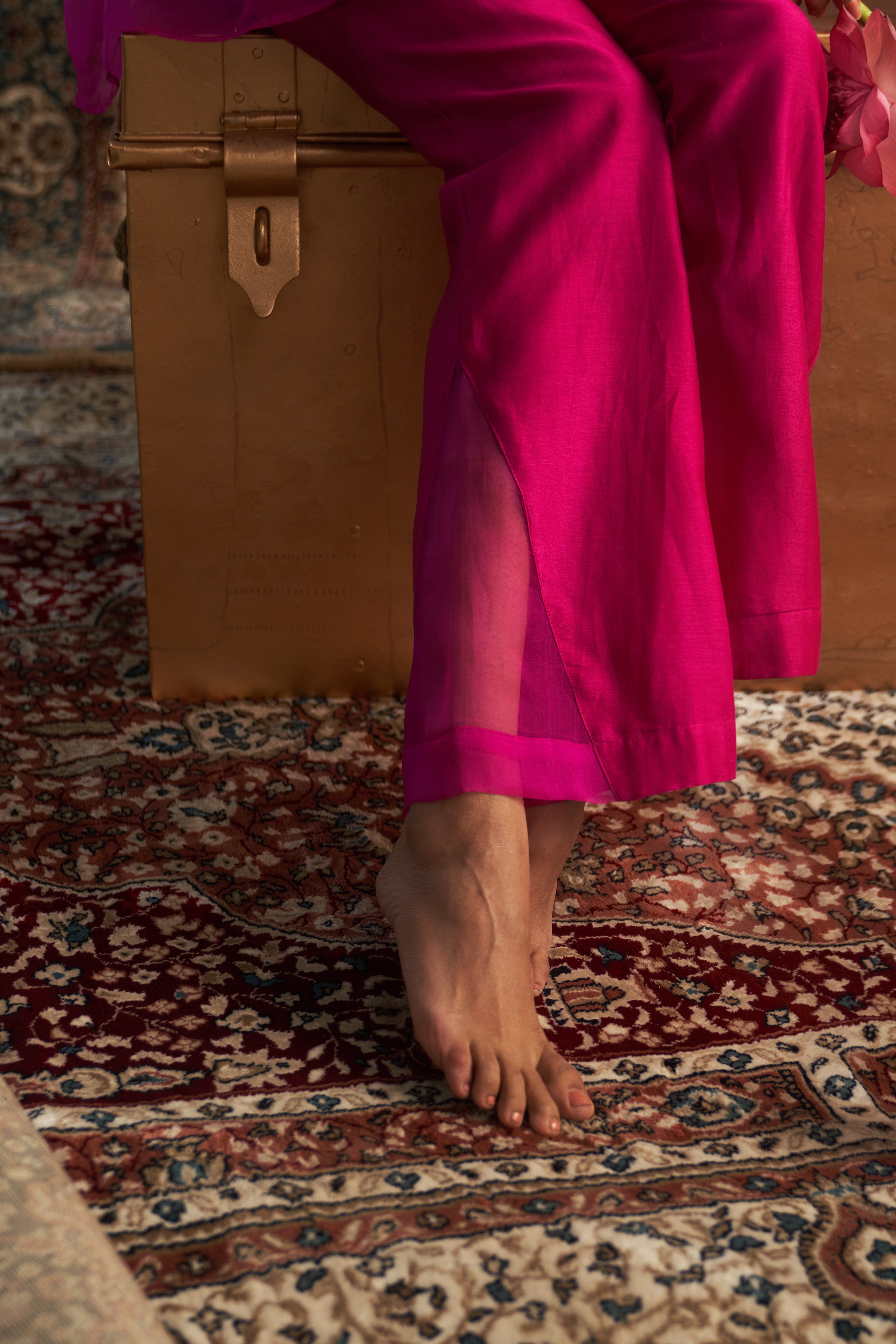 Experience a luxurious and regal touch to your festivities with the Rani Pink Embroidered Aline Co-Ord Set. Crafted from fine organza fabric, this ensemble features intricate dabka and zari embroidery, adding an opulent and modern flair. With sleek tube bustier and chic boot-cut trousers, this Kurta exudes timeless elegance while still being fashionable. Perfect for any festive occasion or sophisticated gathering, this set promises a stunning entrance with a blend of grace, allure, and contemporary fashion.