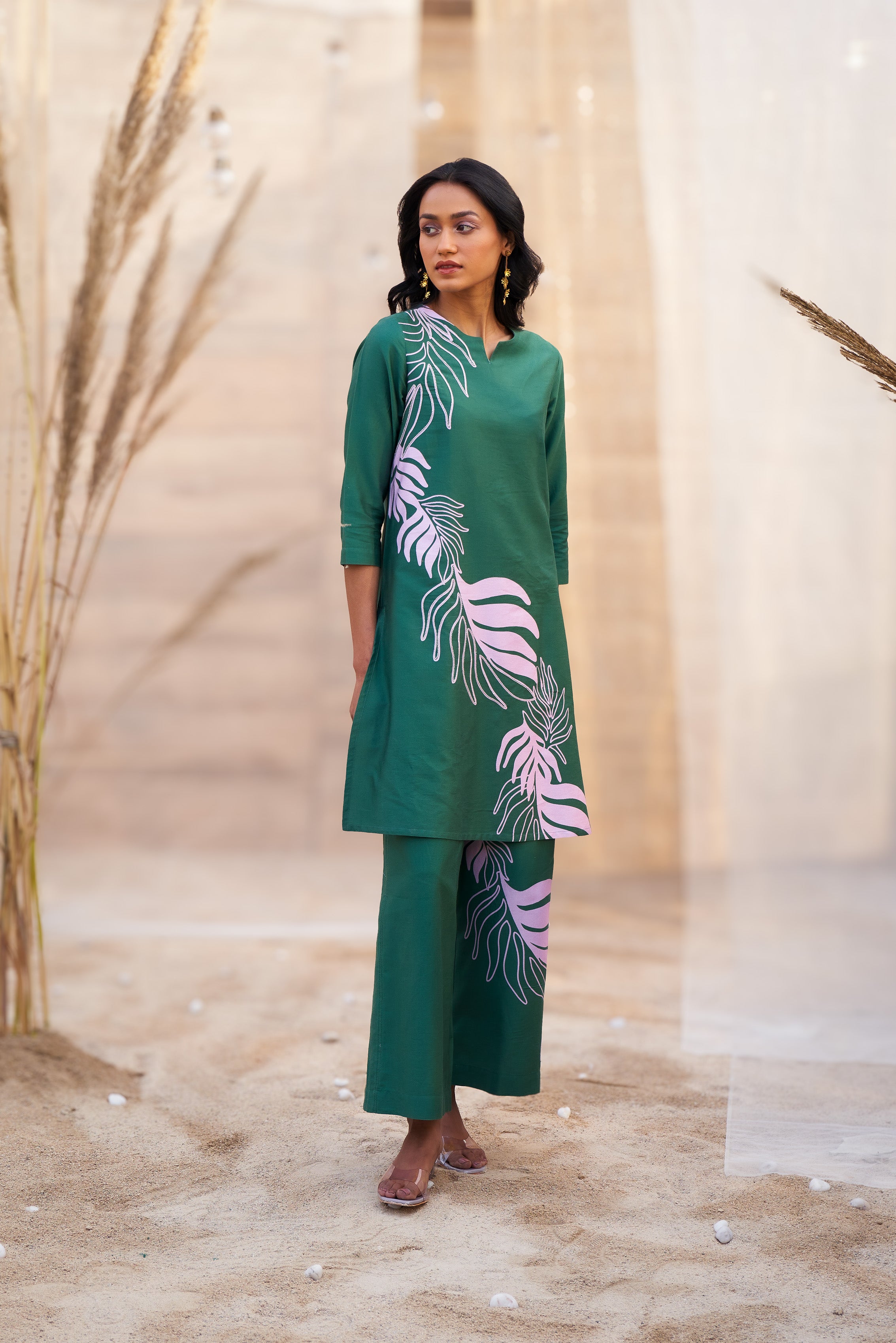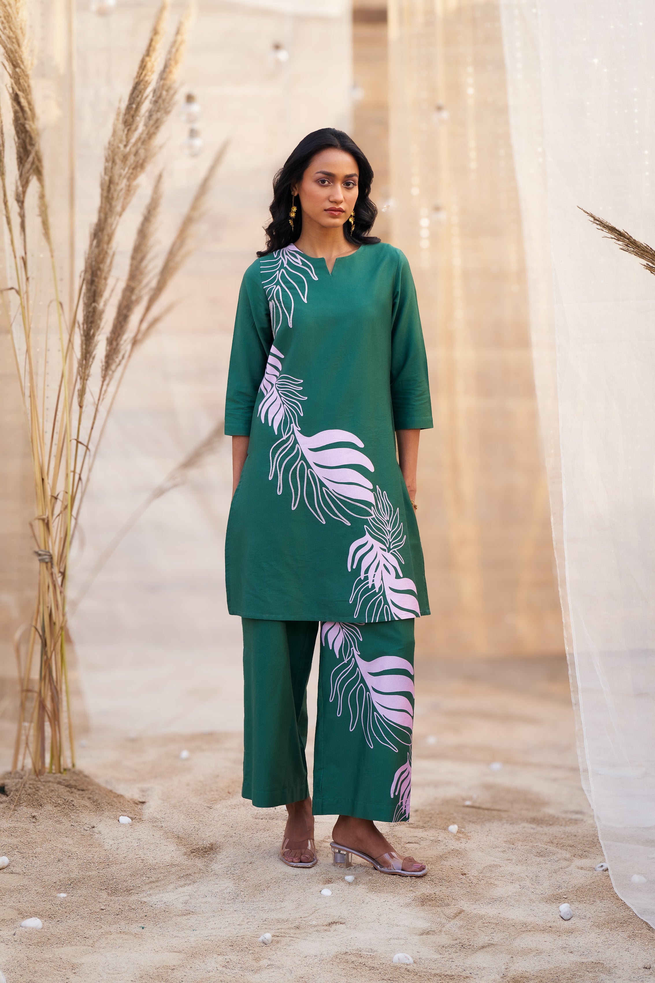 Step out in style with this Bold Leaf-Print Co-ord Set, designed for a striking and contemporary look. The kurta features a notch neckline and 3/4th sleeves, combining comfort with modern elegance. Paired with flared pants in the same bold leaf print, this set creates a statement-making silhouette that’s perfect for casual outings, festive events, or special occasions. Crafted from premium cotton satin fabric, it ensures all-day comfort while keeping you effortlessly stylish. Accessorize with minimal jewelry and heels to complete the chic ensemble.