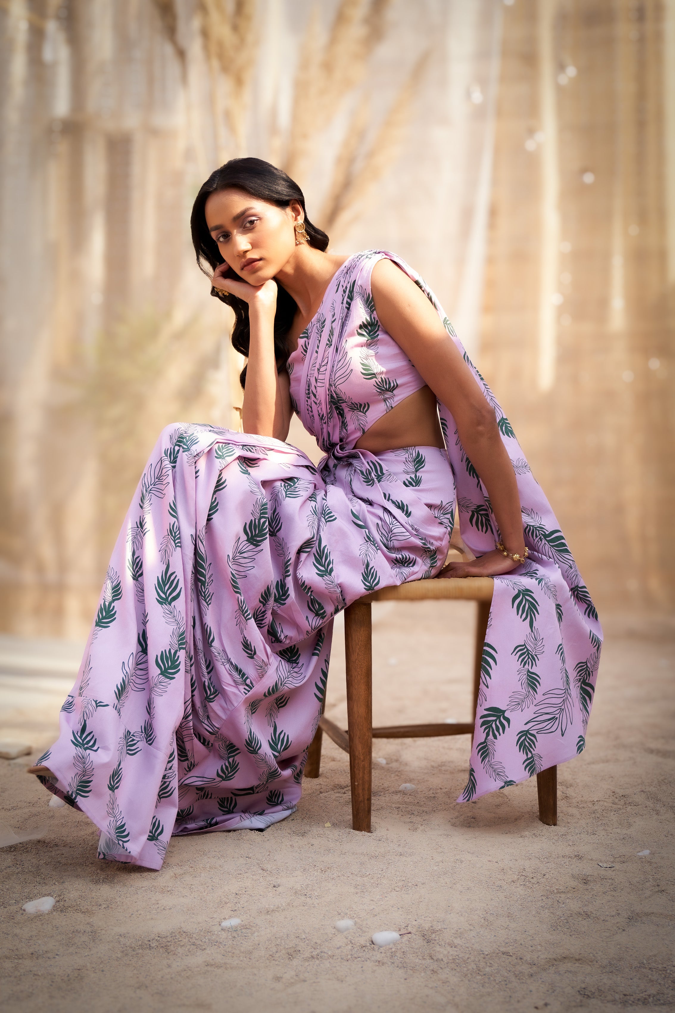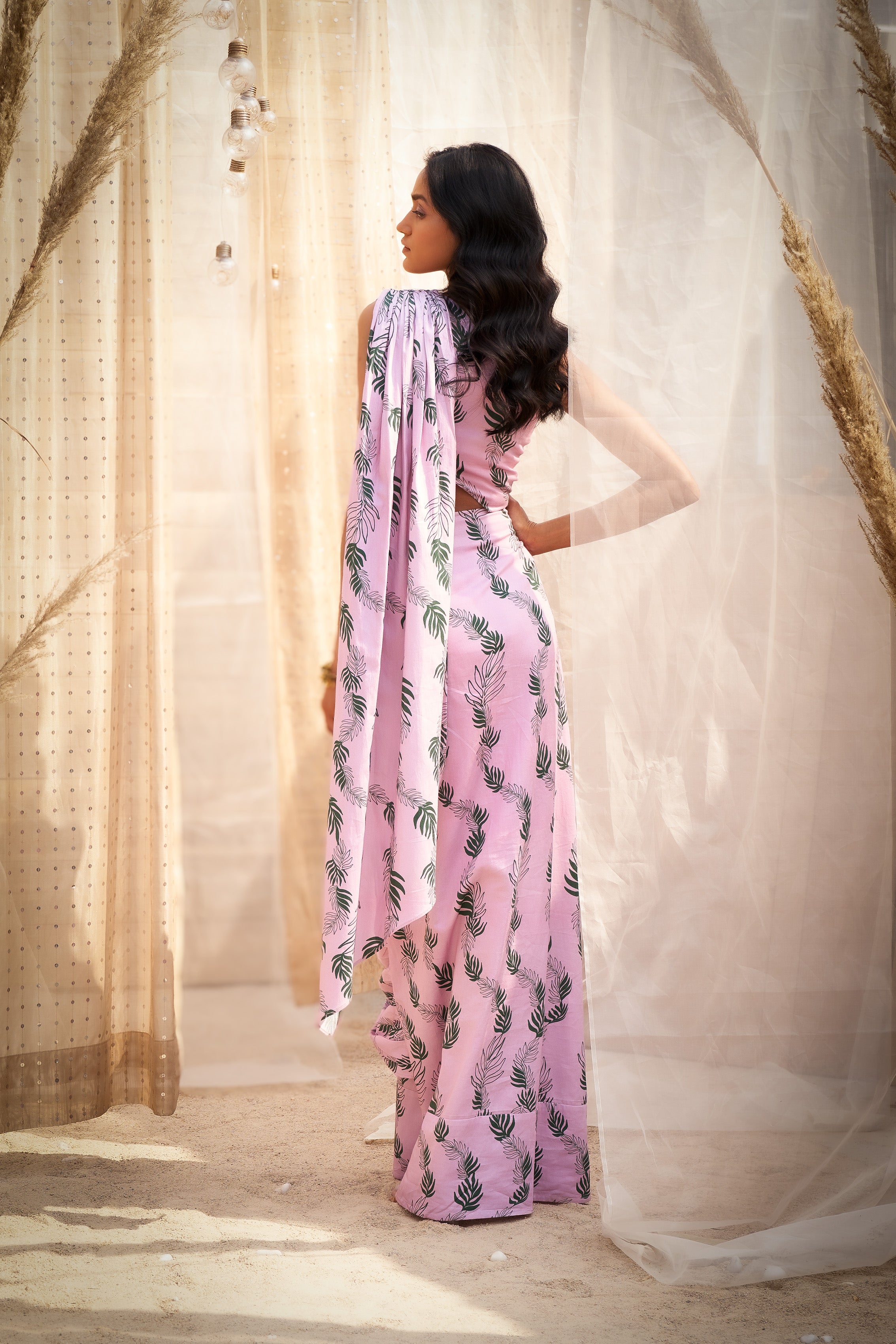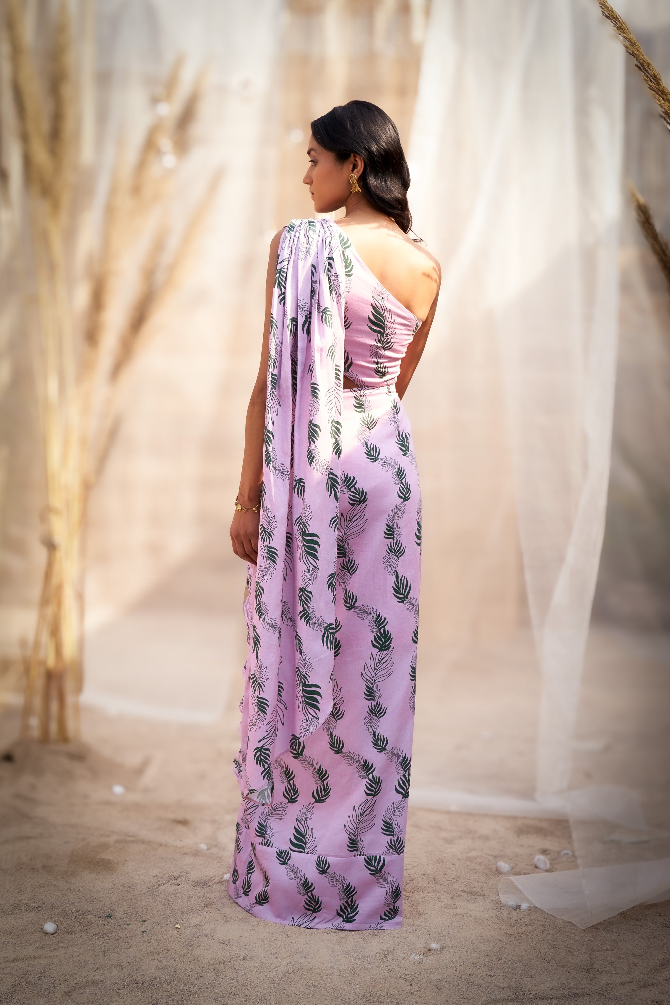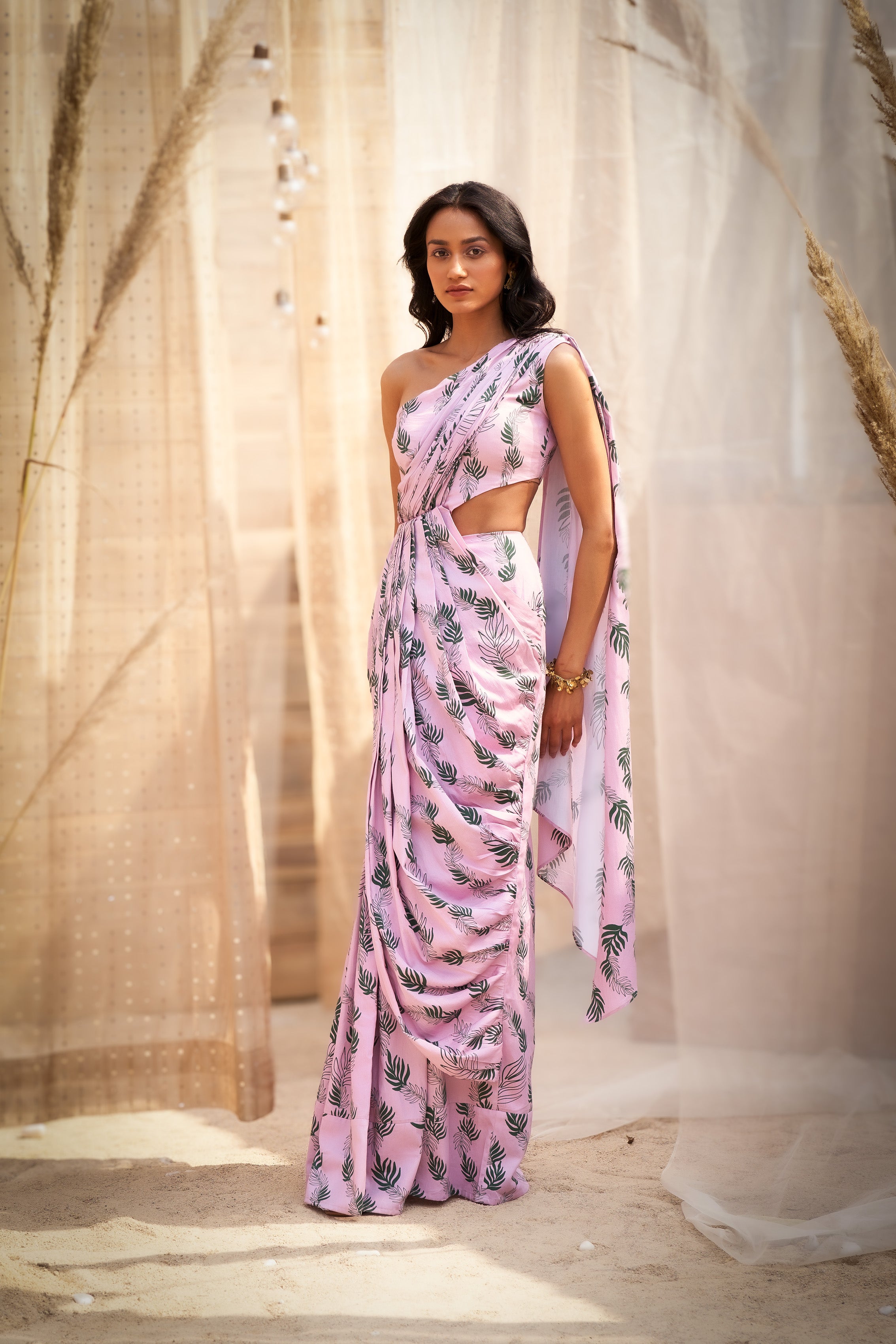 Make a style statement with this Leaf-Printed Drape Saree Dress, a perfect blend of tradition and contemporary fashion. Designed with a one-shoulder neckline, it exudes modern elegance while showcasing a charming leaf print that adds a touch of natural beauty. The drape-inspired silhouette creates a flattering and flowy look, making it an ideal choice for festive occasions, parties, or special events. Crafted for comfort and style, this saree dress ensures you stand out effortlessly. Pair it with statement earrings and heels for a polished and glamorous finish.