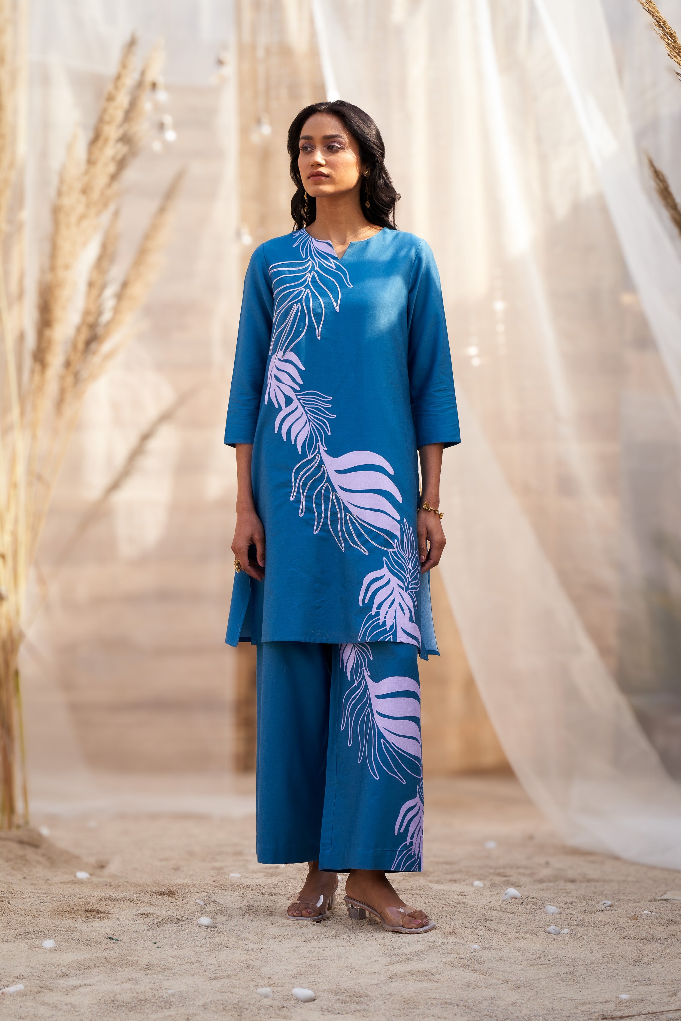 Step out in style with this Bold Leaf-Print Co-ord Set, designed for a striking and contemporary look. The kurta features a notch neckline and 3/4th sleeves, combining comfort with modern elegance. Paired with flared pants in the same bold leaf print, this set creates a statement-making silhouette that’s perfect for casual outings, festive events, or special occasions. Crafted from premium cotton satin fabric, it ensures all-day comfort while keeping you effortlessly stylish. Accessorize with minimal jewelry and heels to complete the chic ensemble.