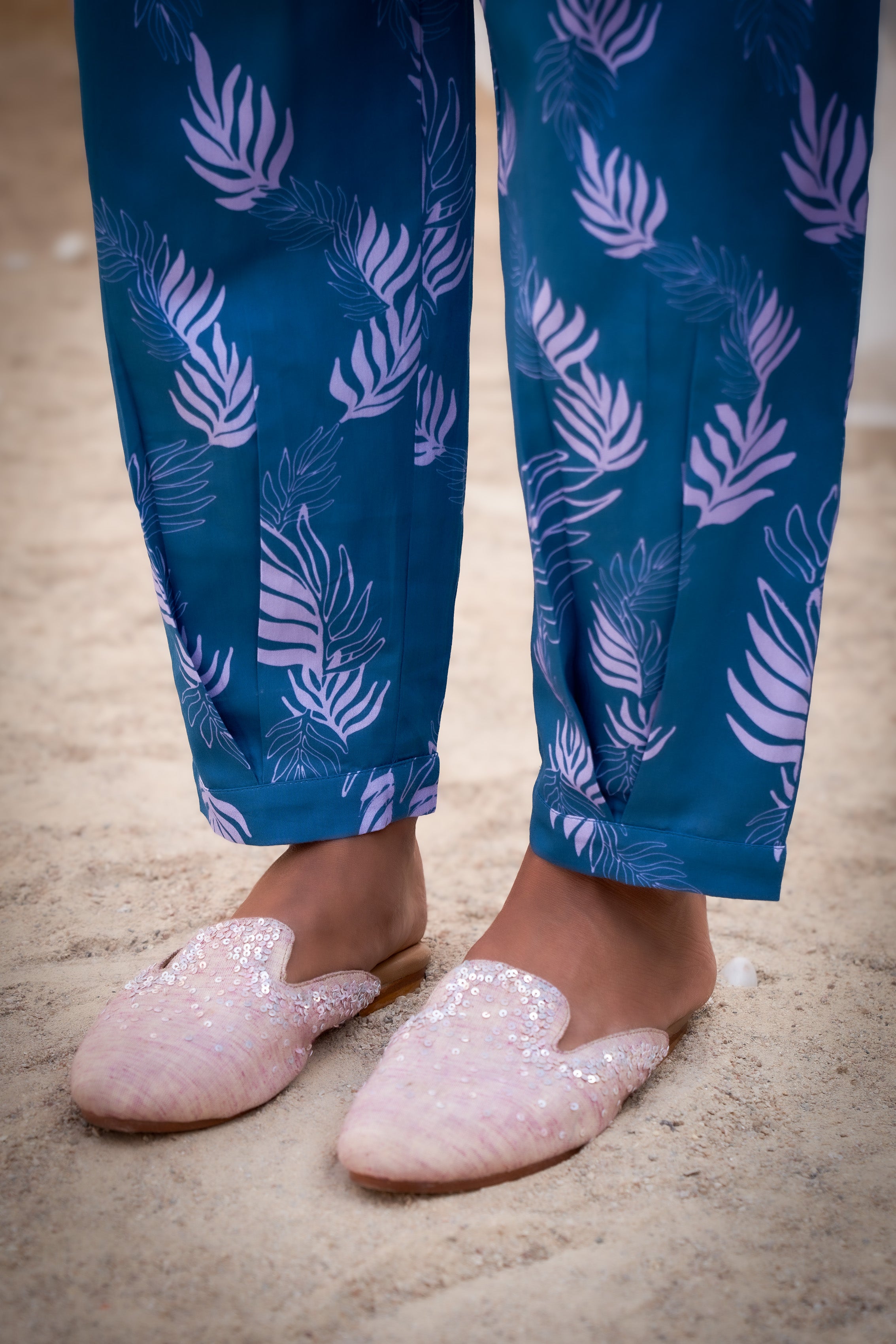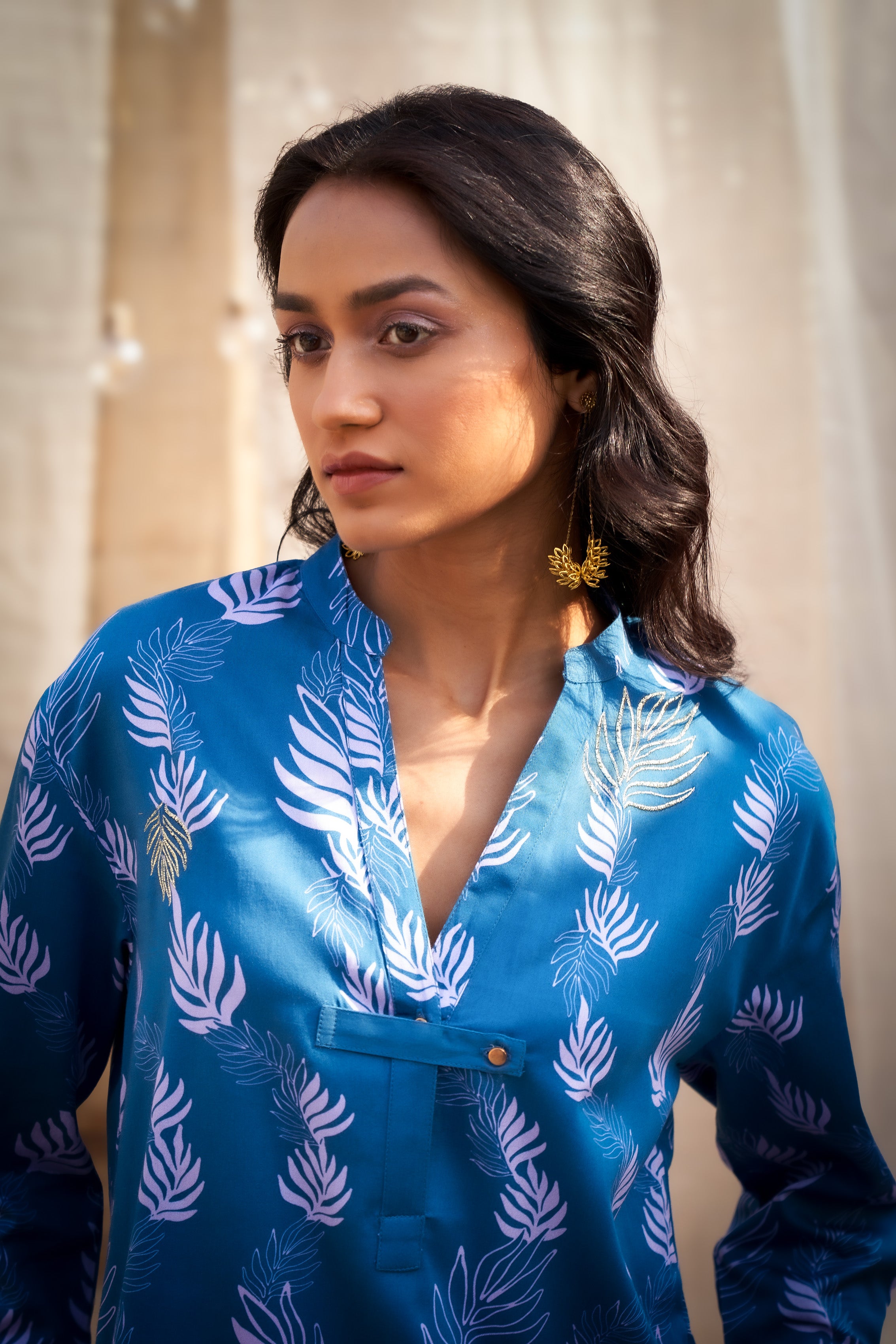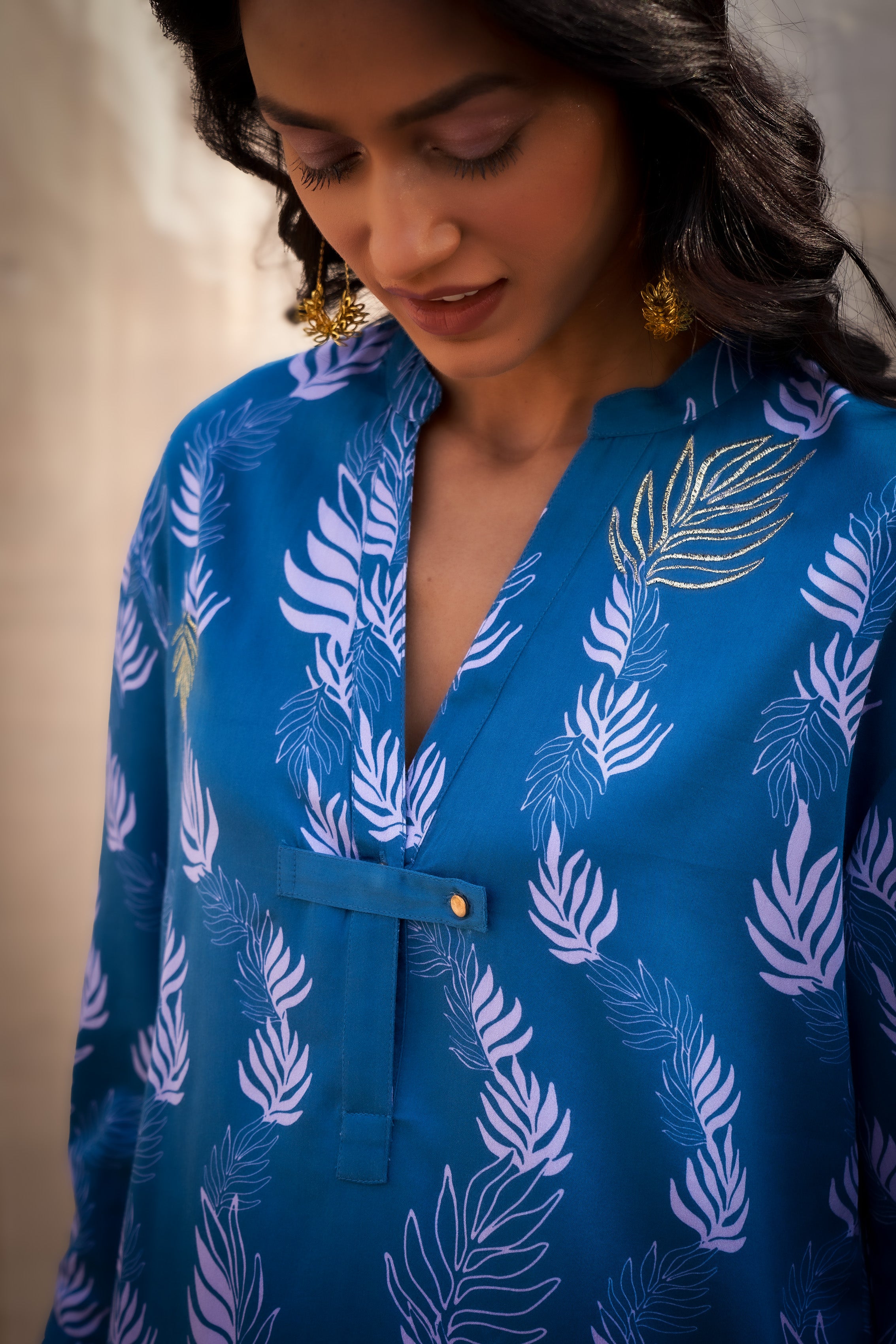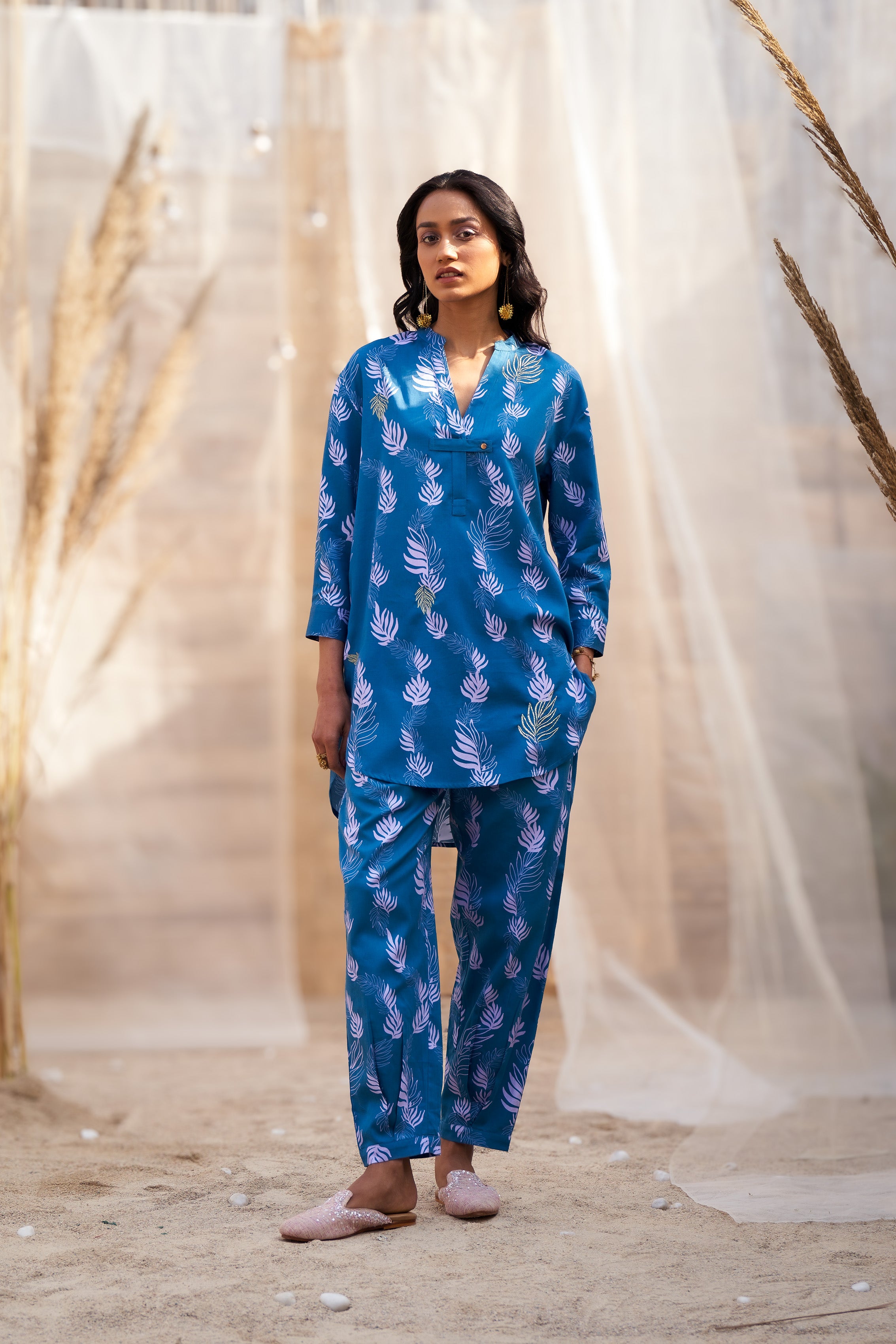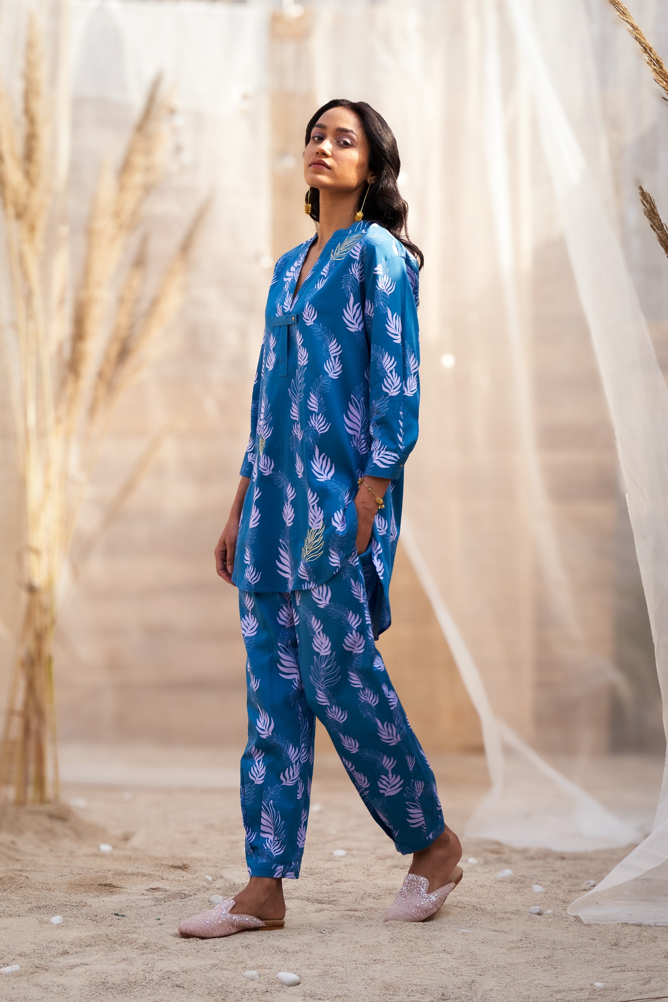 Enhance your wardrobe with this leaf printed coord set, featuring a short kurta with 3/4th sleeves for a versatile and elegant look. Crafted from soft and premium cotton satin fabric, the kurta boasts a charming leaf print accented by Zari-highlighted motifs, adding a subtle touch of shimmer. Paired with a pleated narrow salwar, this ensemble offers a perfect blend of comfort and style. Ideal for casual outings, workwear, or small gatherings, it’s an effortless choice for a polished yet relaxed appearance. Accessorize with minimal jewelry and flats for a chic finish.