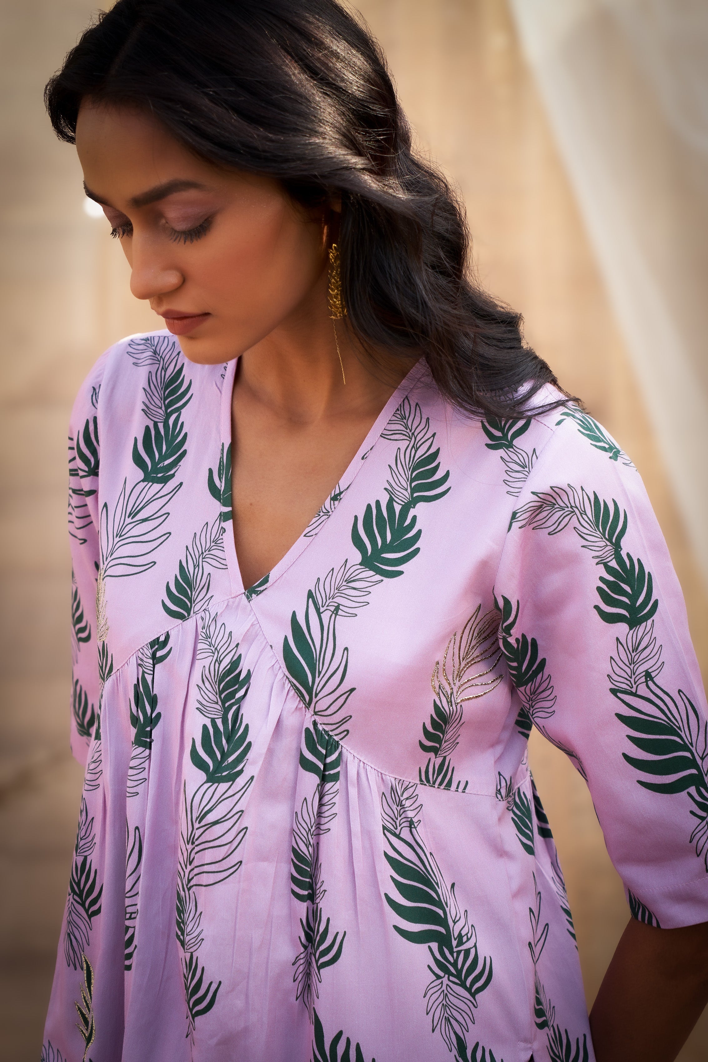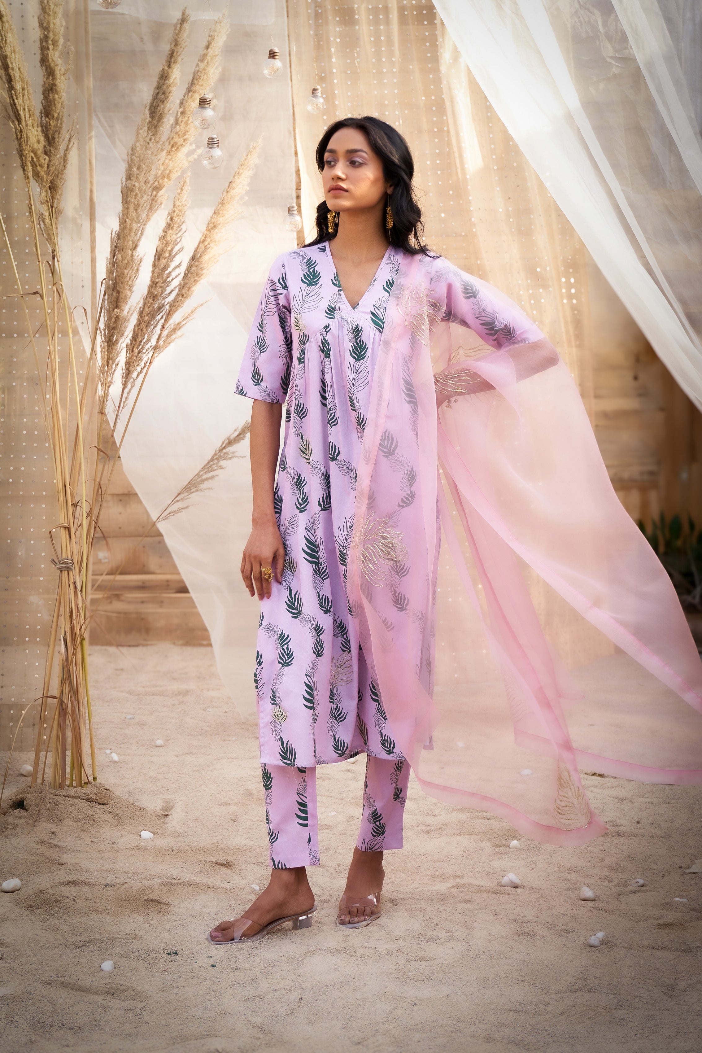 Exude elegance with this Leaf-Printed V-Neck Kurta Set, crafted for a refined and stylish look. The kurta features a front-gathered design with a high slit, paired with same-print pants for a cohesive and contemporary appeal. The flattering V-neckline enhances its modern charm. The set features a delicate leaf print enhanced with select zari-highlighted motifs, adding a touch of shimmer and sophistication. Adding a touch of luxury, the set includes a sheer organza dupatta adorned with delicate Zari work, making it perfect for festive occasions or special gatherings. The lightweight fabric ensures comfort, while the intricate details add sophistication. Pair it with statement jewelry and embellished heels to complete the look.