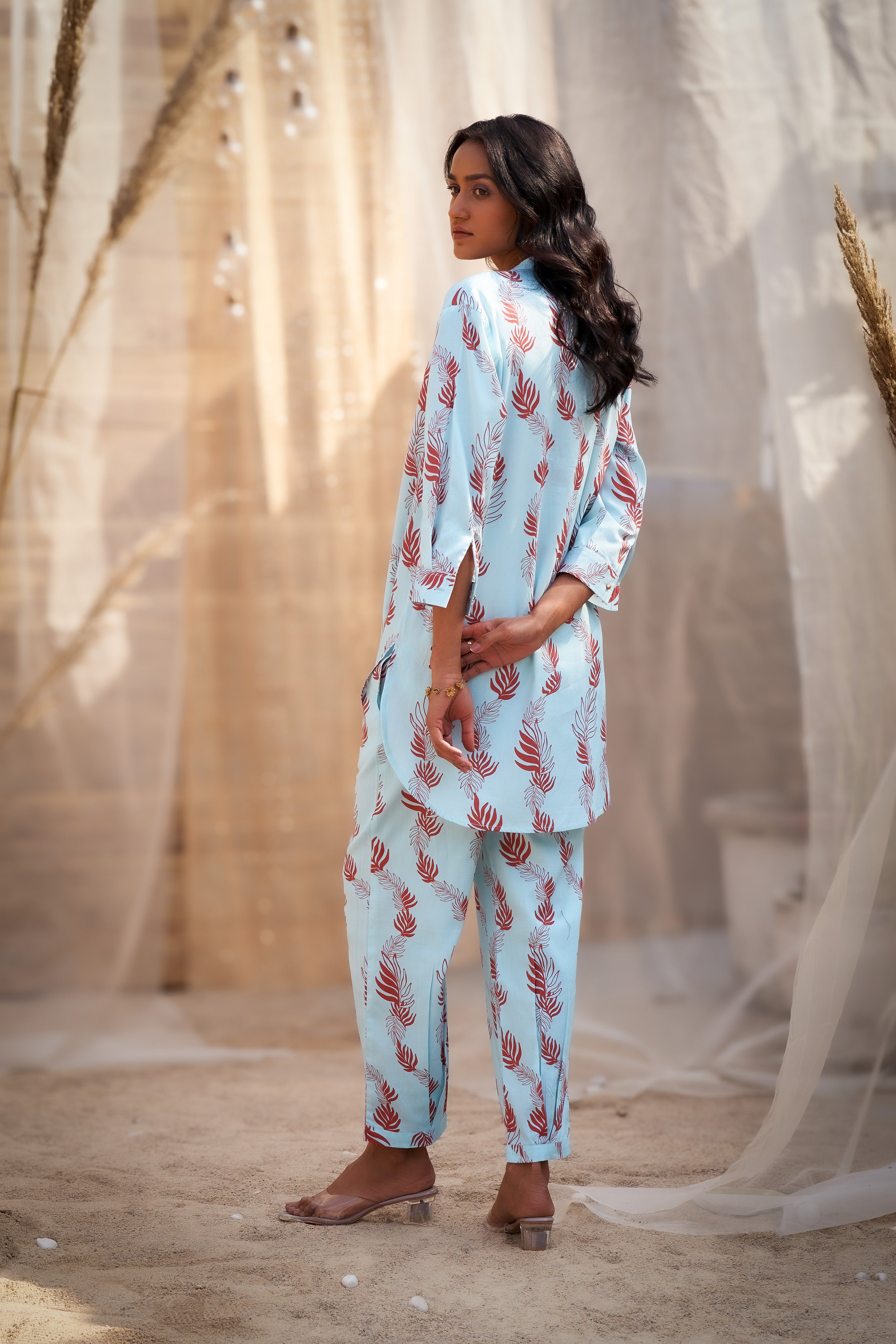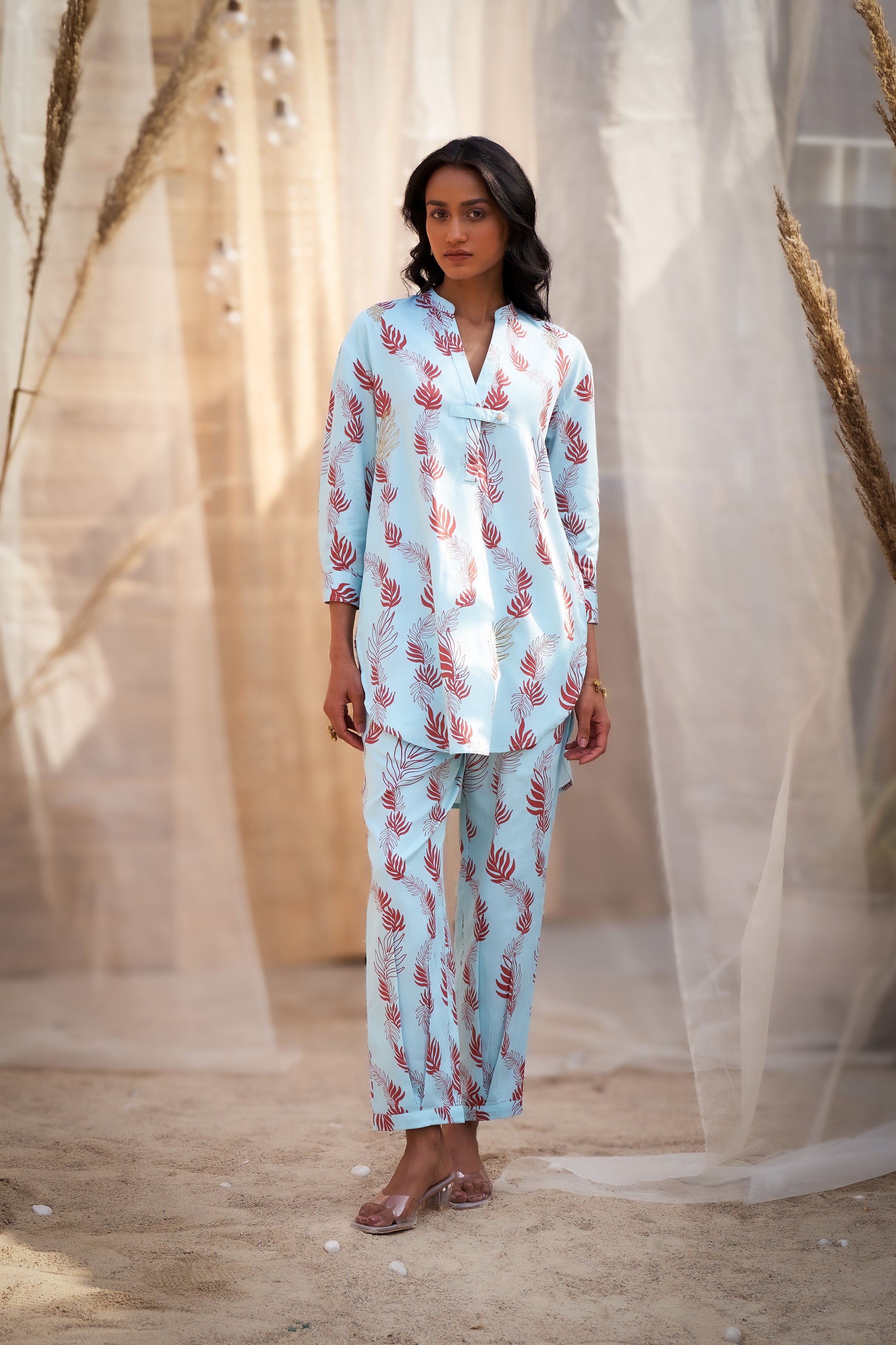 Enhance your wardrobe with this leaf printed coord set, featuring a short kurta with 3/4th sleeves for a versatile and elegant look. Crafted from soft and premium cotton satin fabric, the kurta boasts a charming leaf print accented by Zari-highlighted motifs, adding a subtle touch of shimmer. Paired with a pleated narrow salwar, this ensemble offers a perfect blend of comfort and style. Ideal for casual outings, workwear, or small gatherings, it’s an effortless choice for a polished yet relaxed appearance. Accessorize with minimal jewelry and flats for a chic finish.