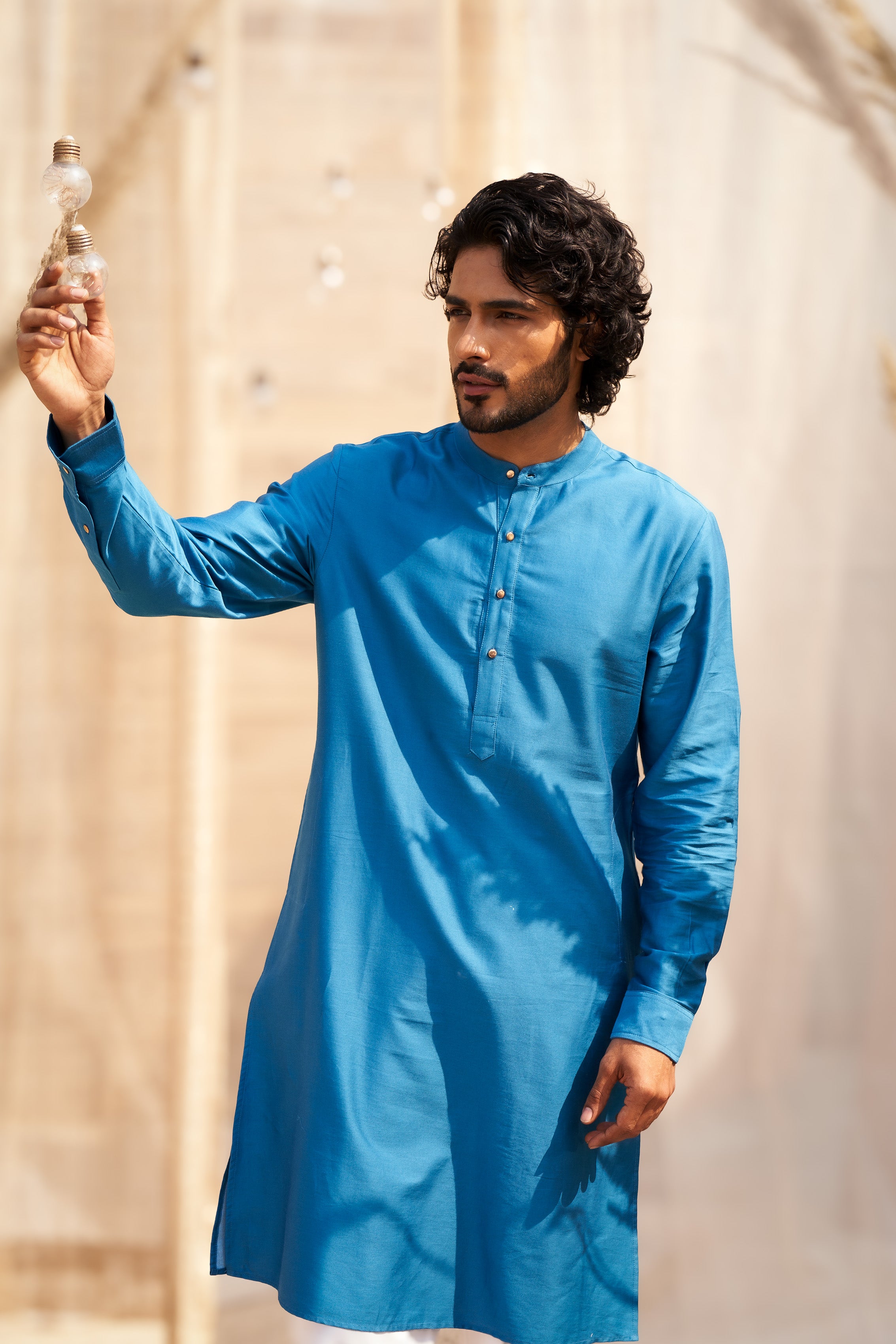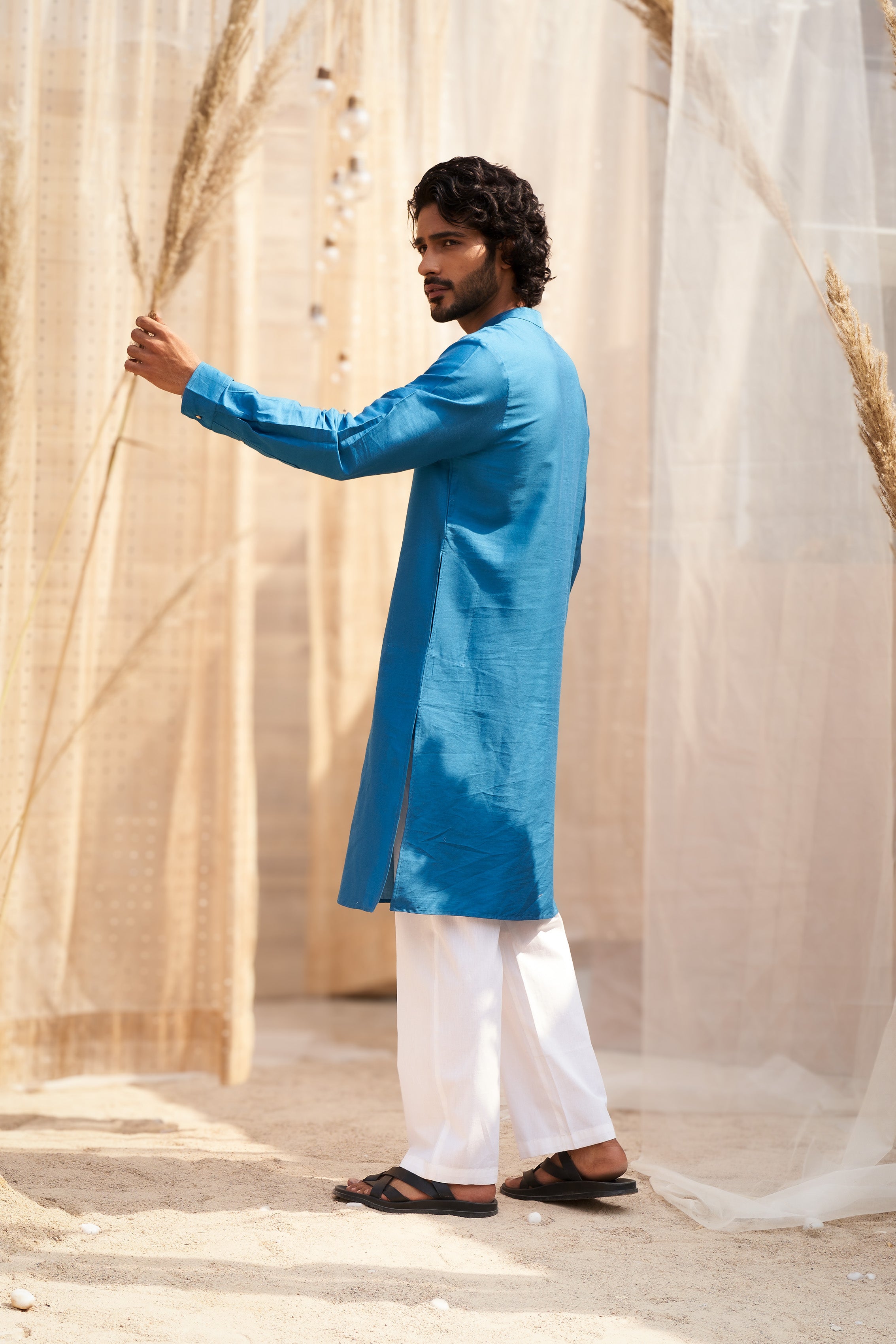 Elevate your wardrobe with this solid ocean blue kurta set, designed for a timeless and elegant look. The kurta features a minimalist design that exudes sophistication, paired with straight pants for unmatched comfort and ease.