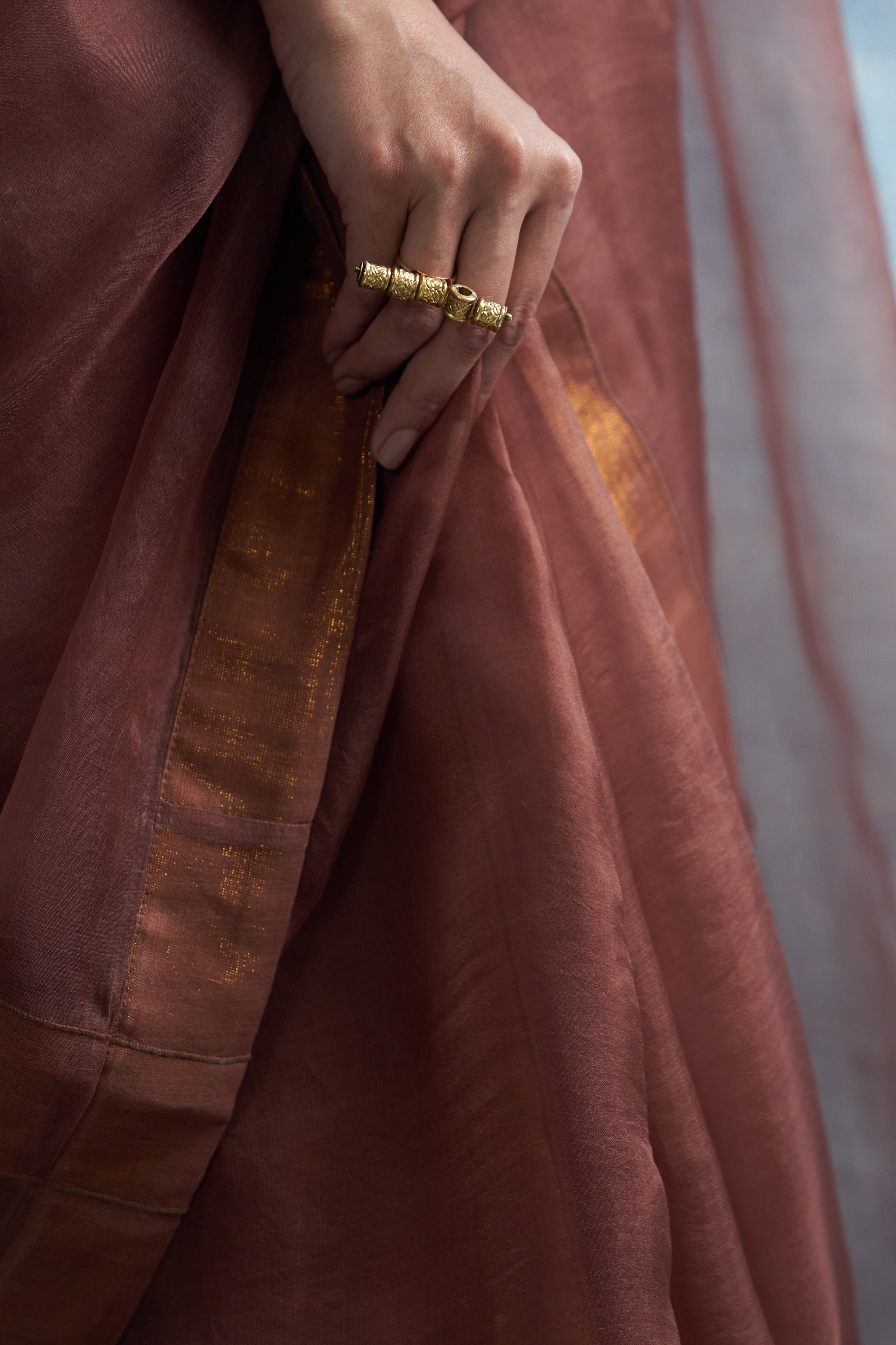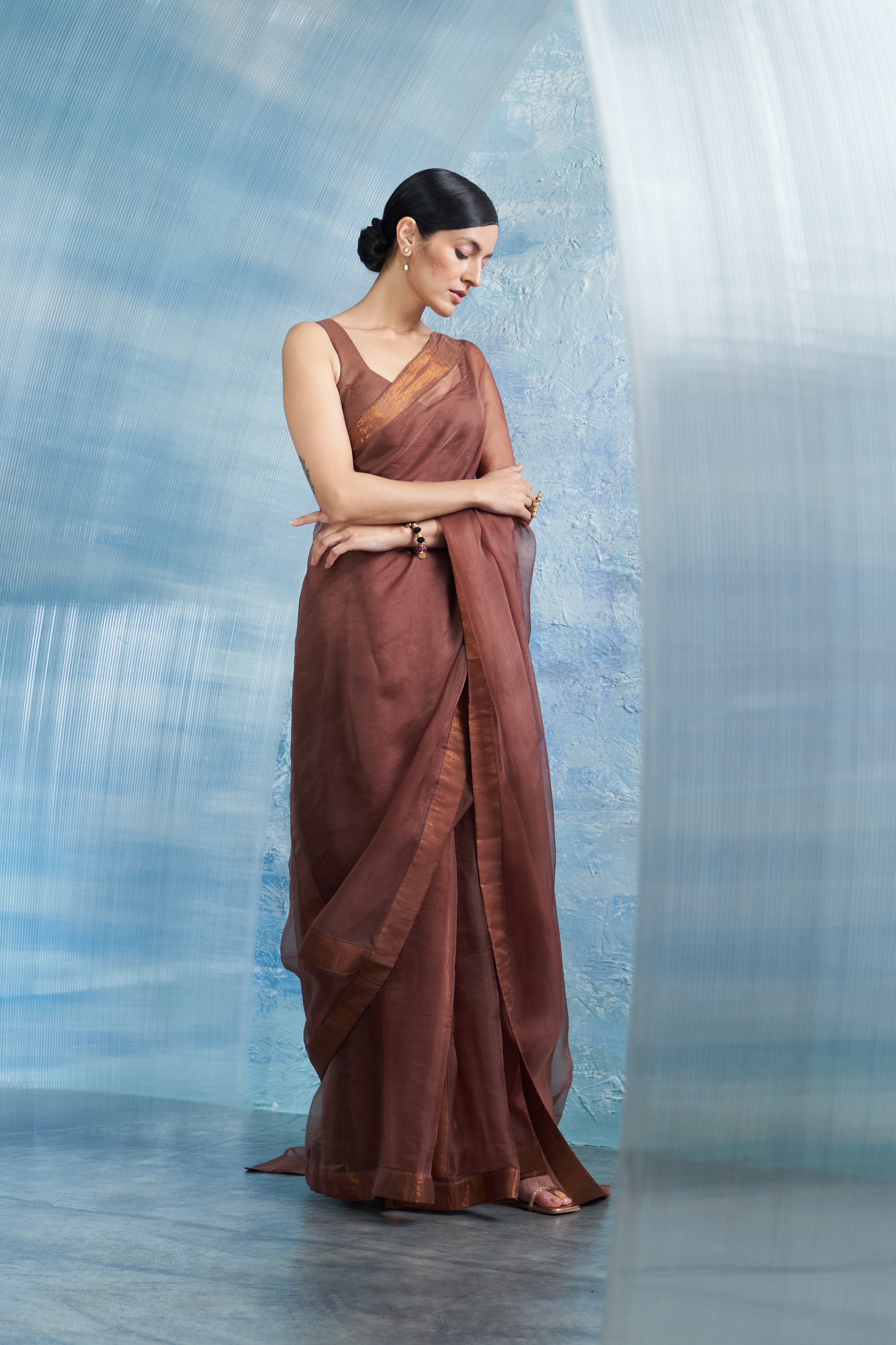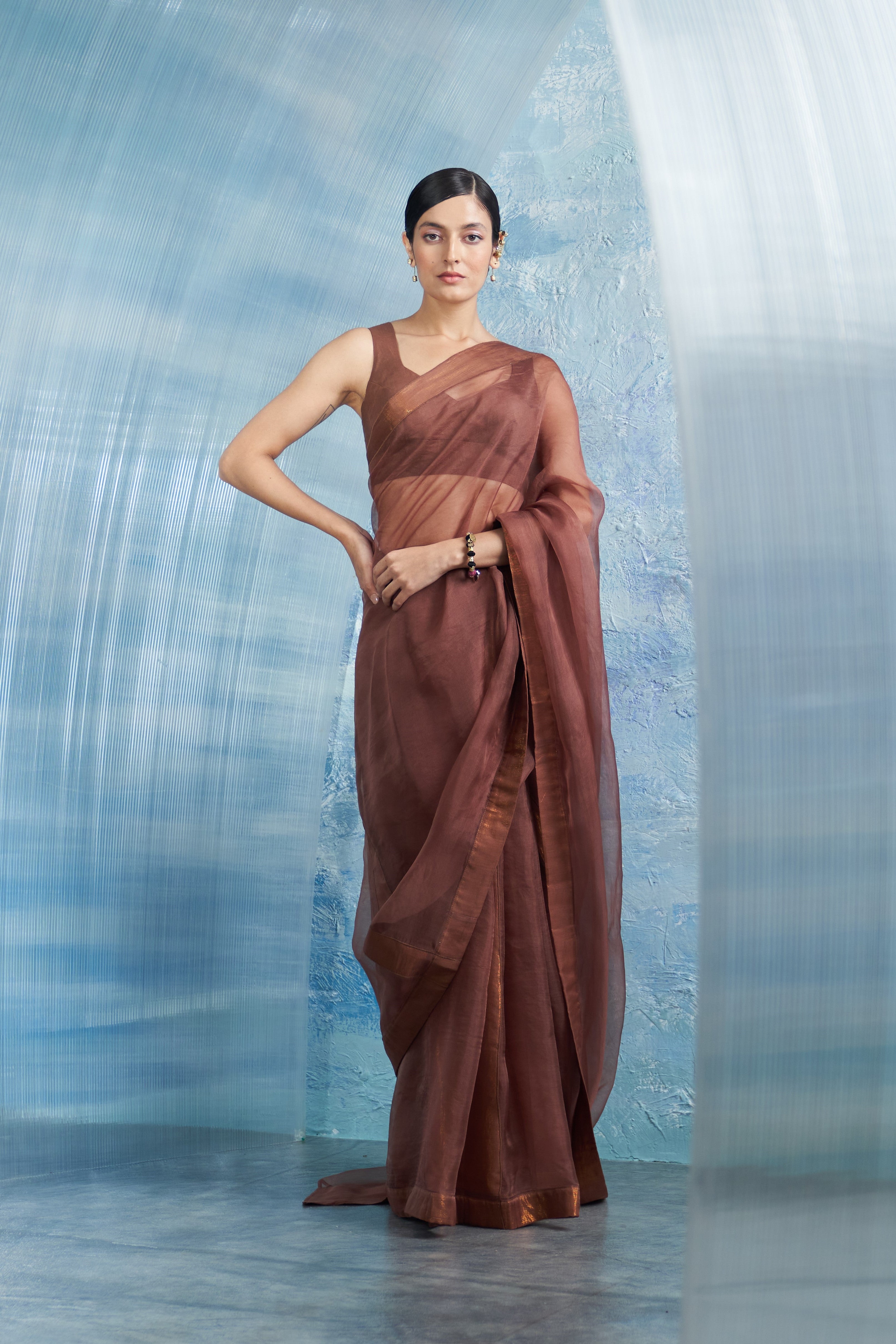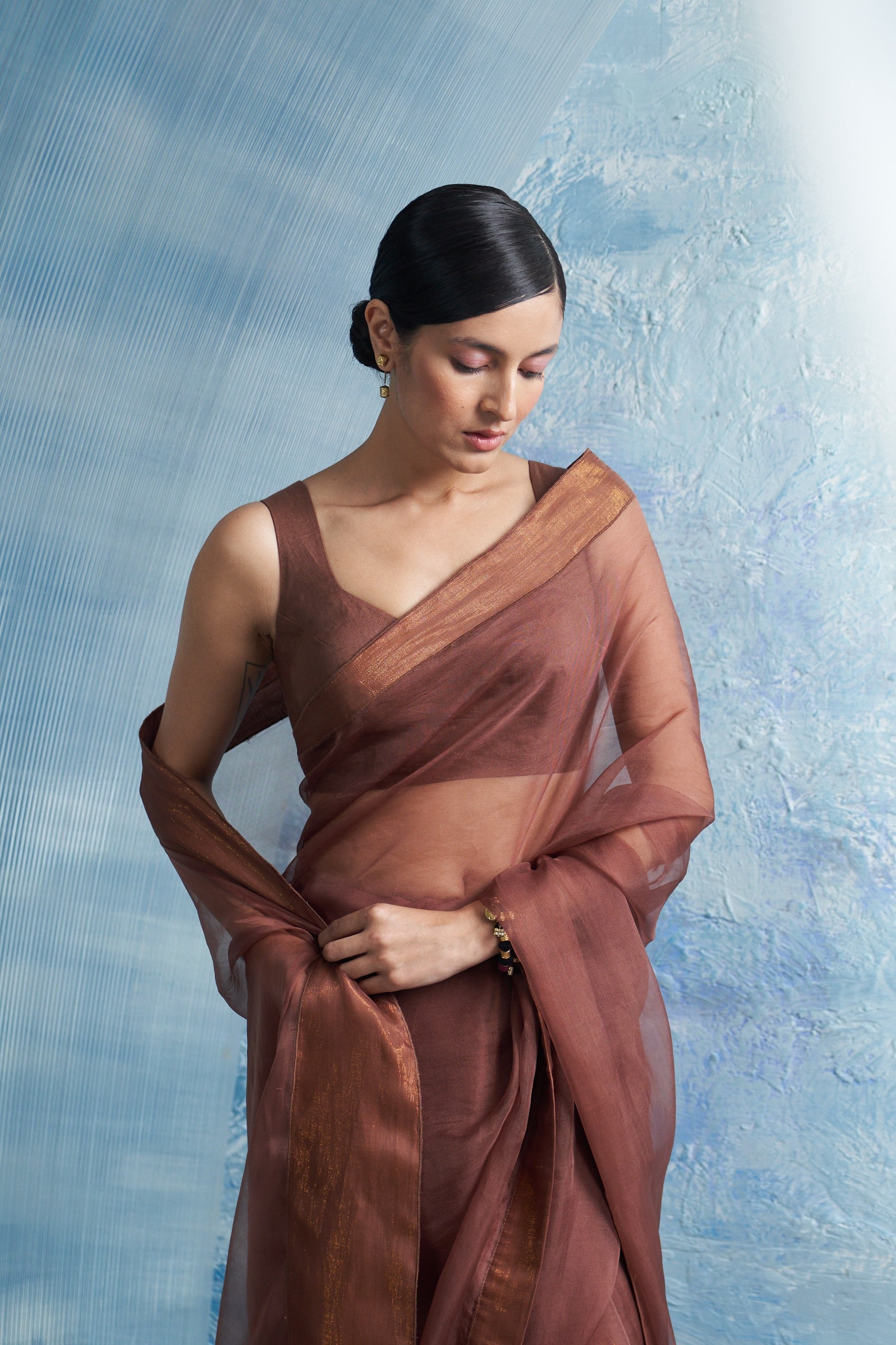 Our show-stopping masterpiece, Aura Shimmer Organza Saree, designed to mesmerize with every graceful movement. Crafted from ethereal organza fabric, this saree is adorned with subtle shimmer accents that delicately catch the light, casting a spell of enchantment wherever you go. Paired with a linen blouse, this ensemble strikes the perfect balance between raw, natural beauty and refined sophistication. The simplicity of the linen blouse enhances the radiance of the shimmering organza saree, resulting in a harmonious fusion of textures and tones.