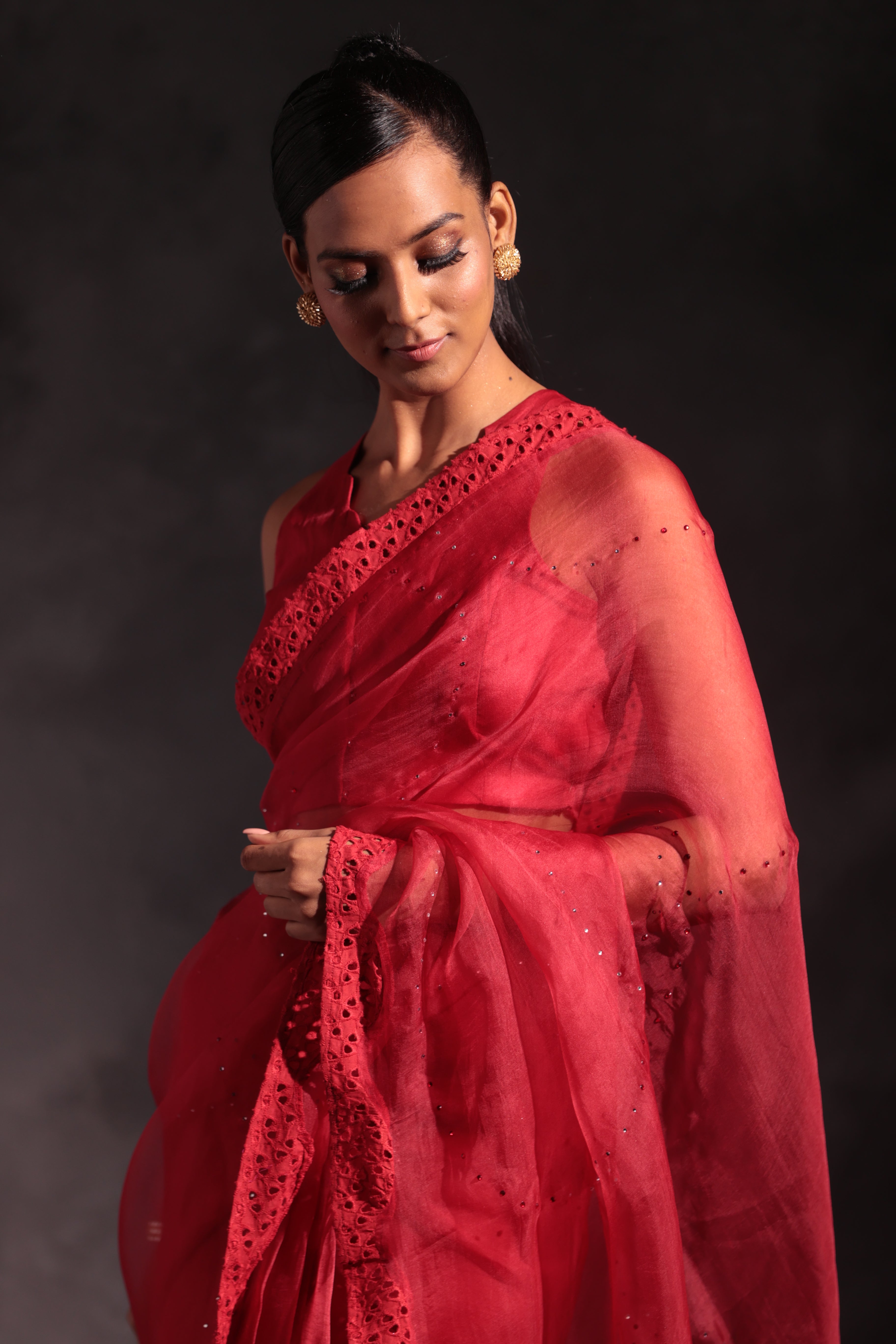 Swarovski Scarlet Red Organza Saree - Set of 2