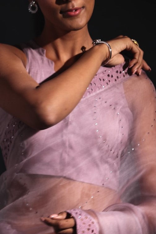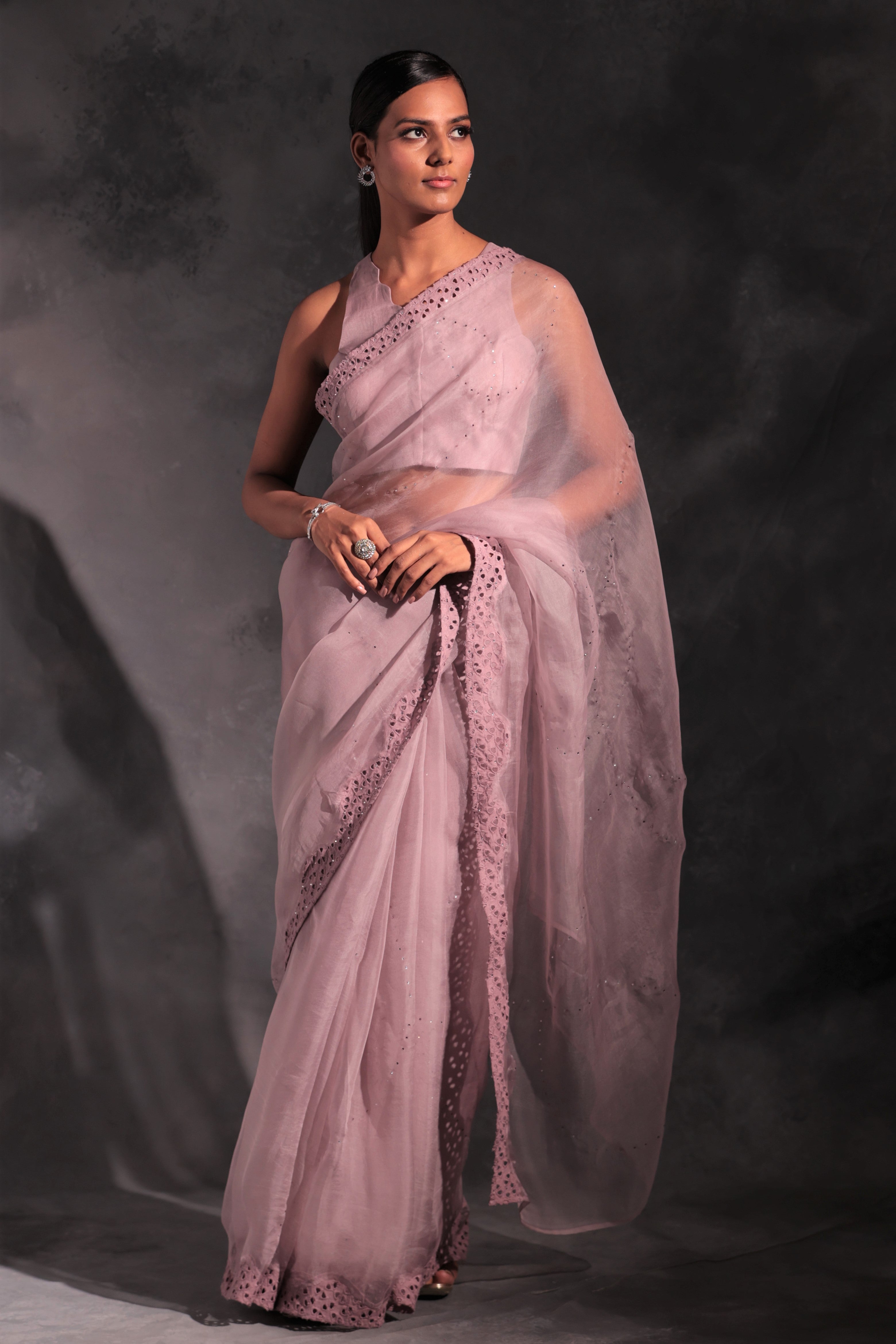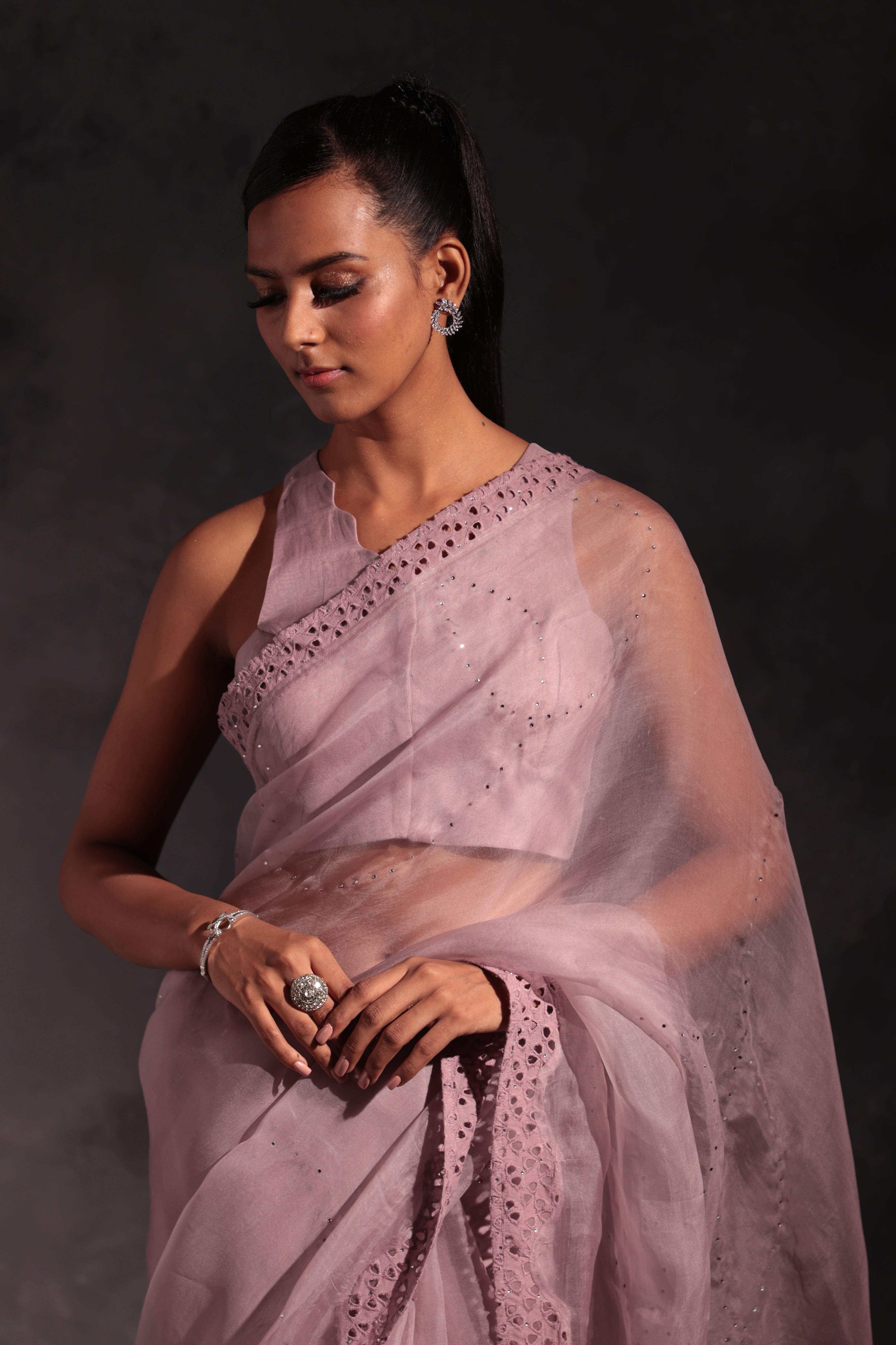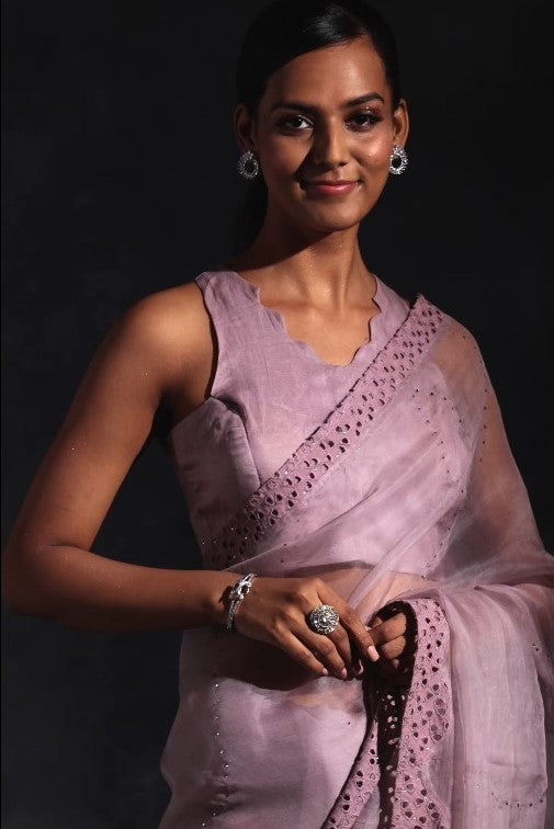 Organza saree with cutwork border and pallu. Saree is embellished with swarovski, comes with a jagged neckline crop top blouse.