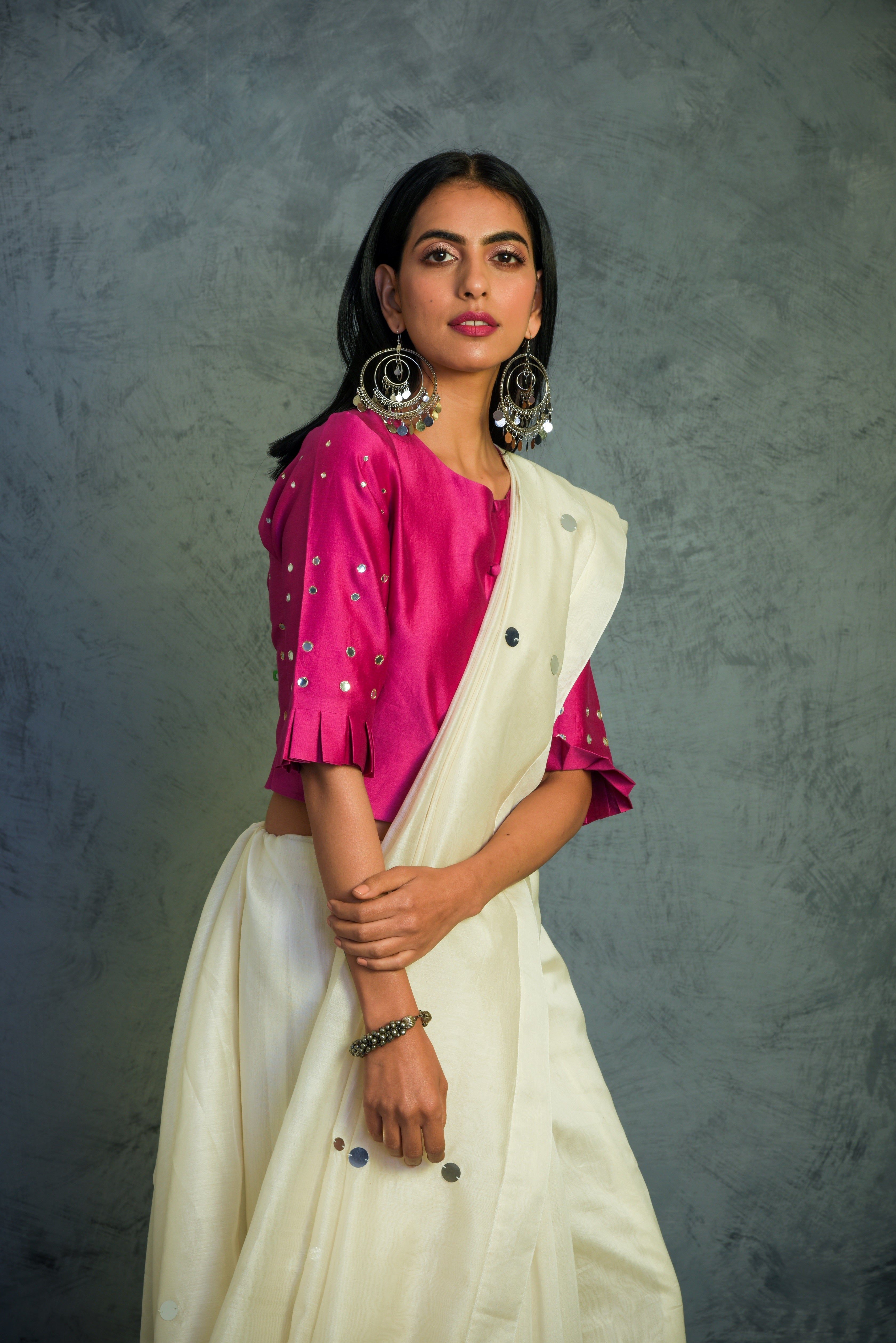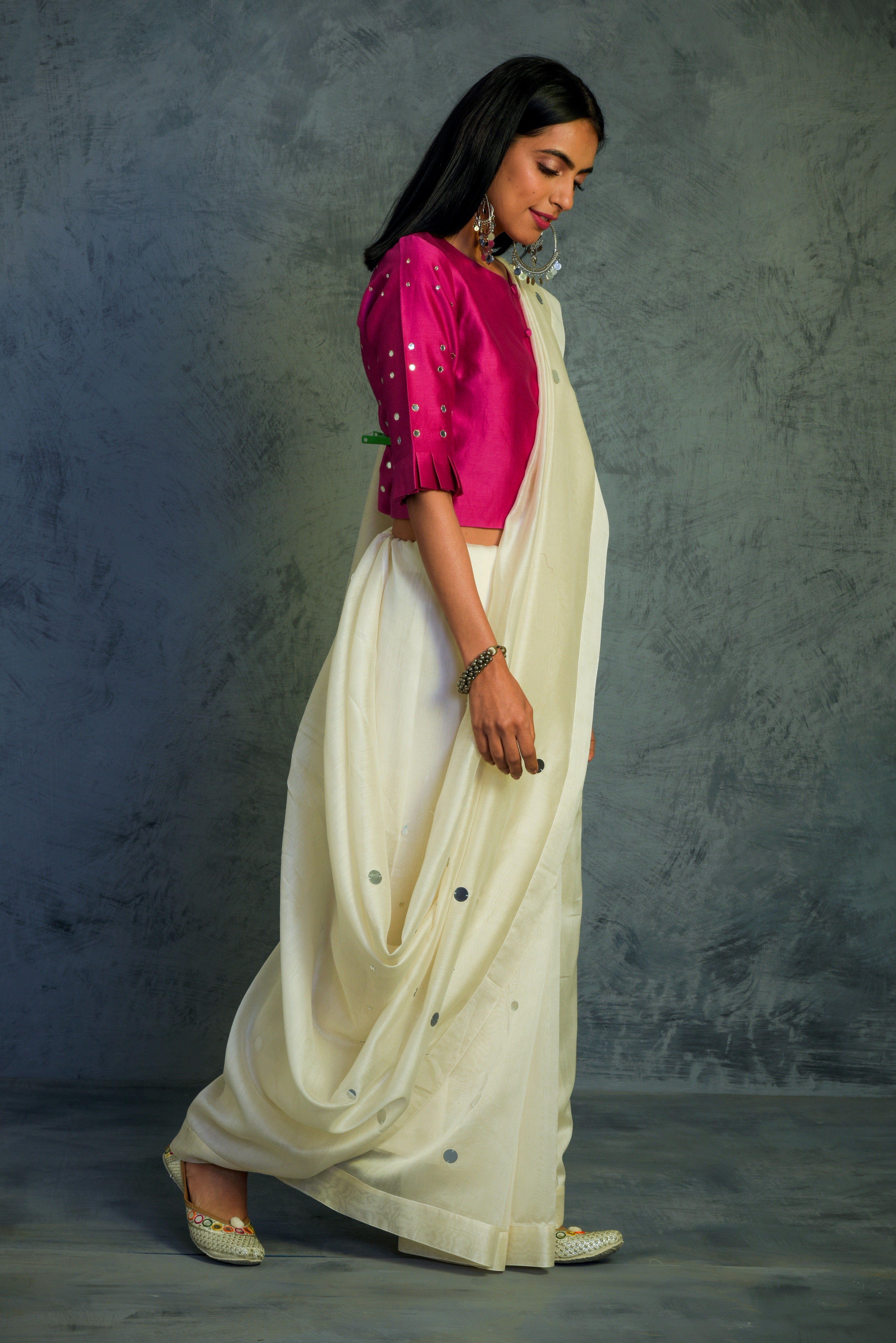 Chanderi saree embellished with mirror work on pleats and pallu, comes along with a pleated sleeve crop blouse embellished with mirror work. Enjoy the celebrations in this beautiful and unique saree.