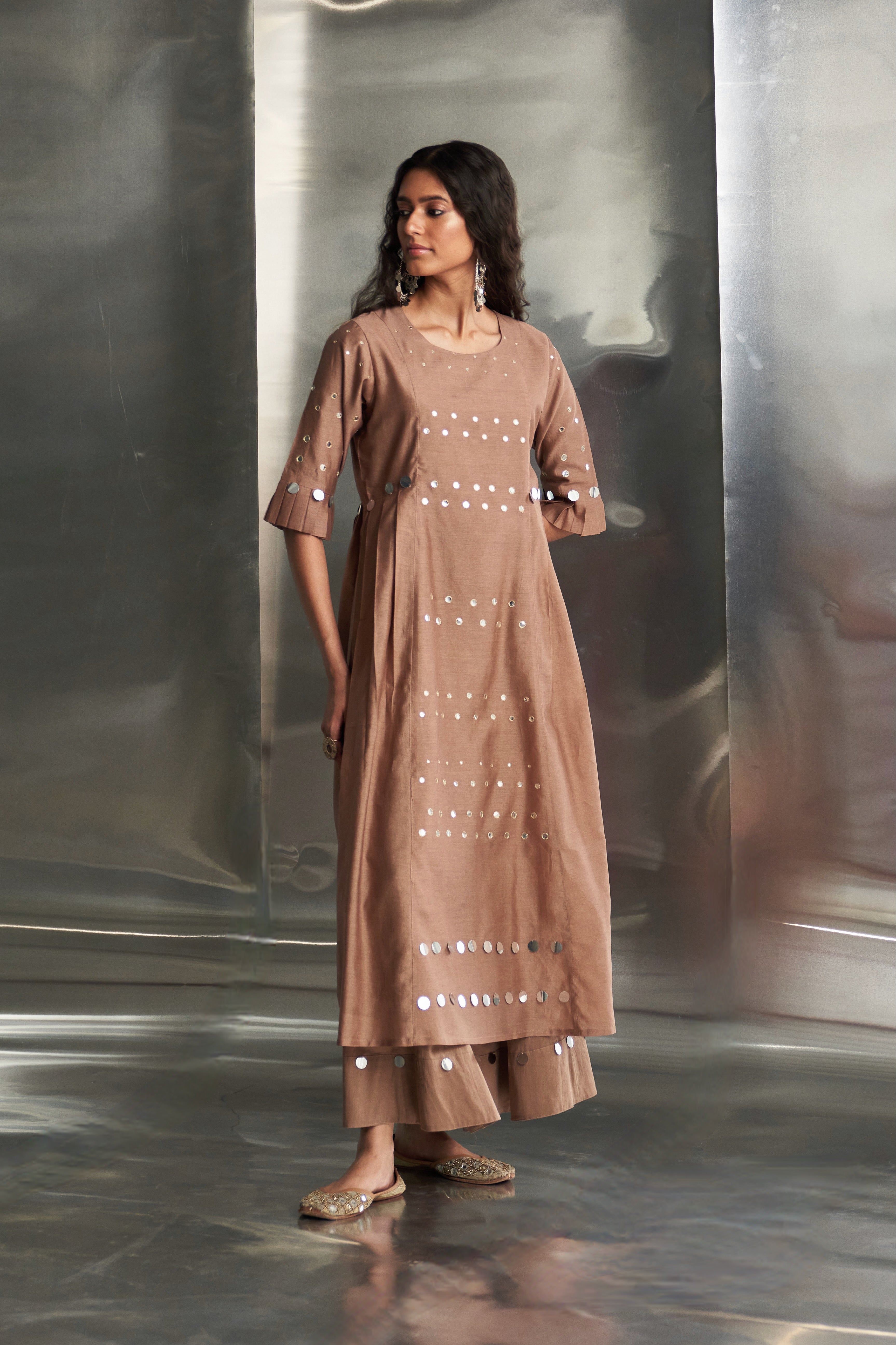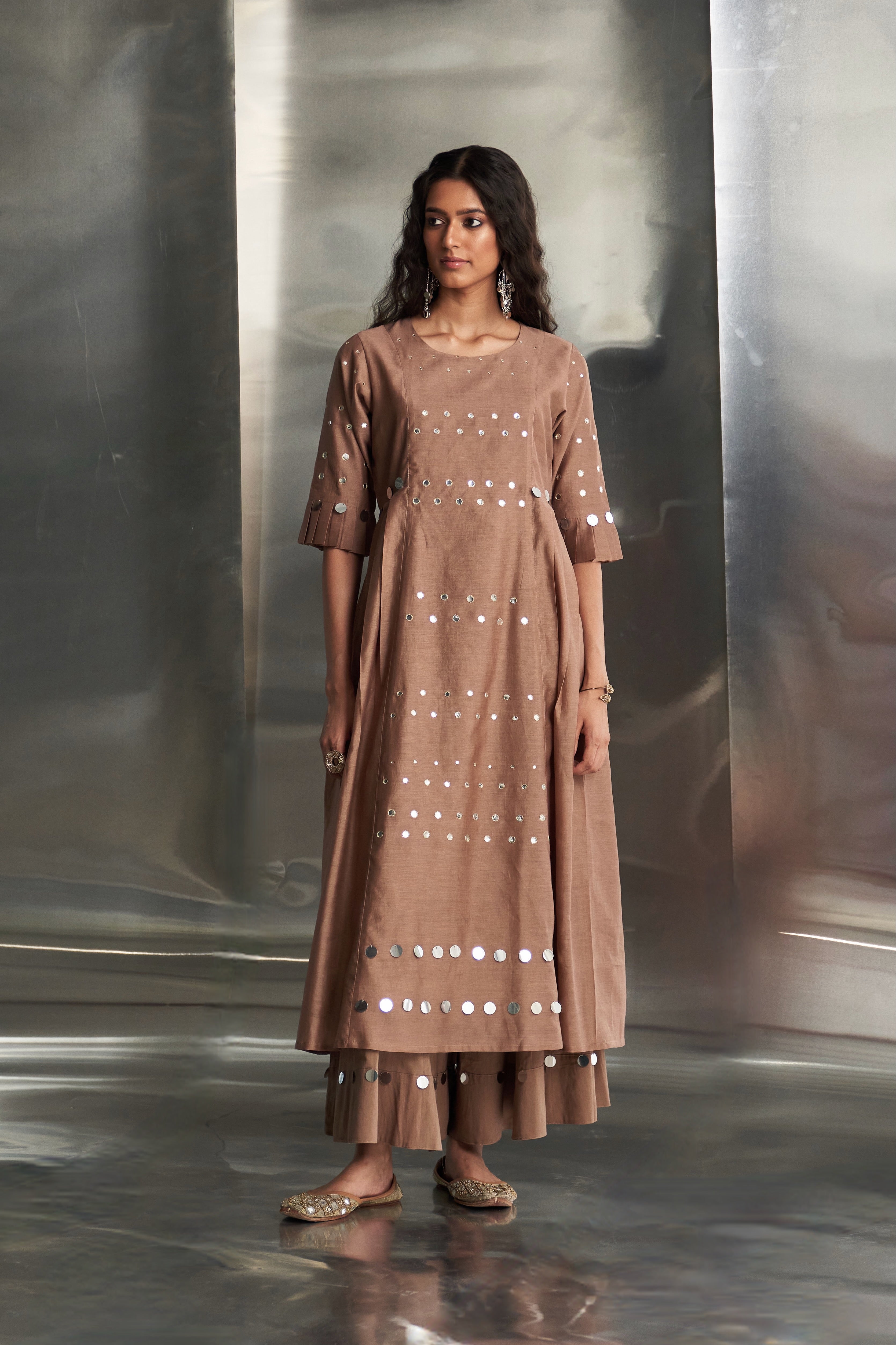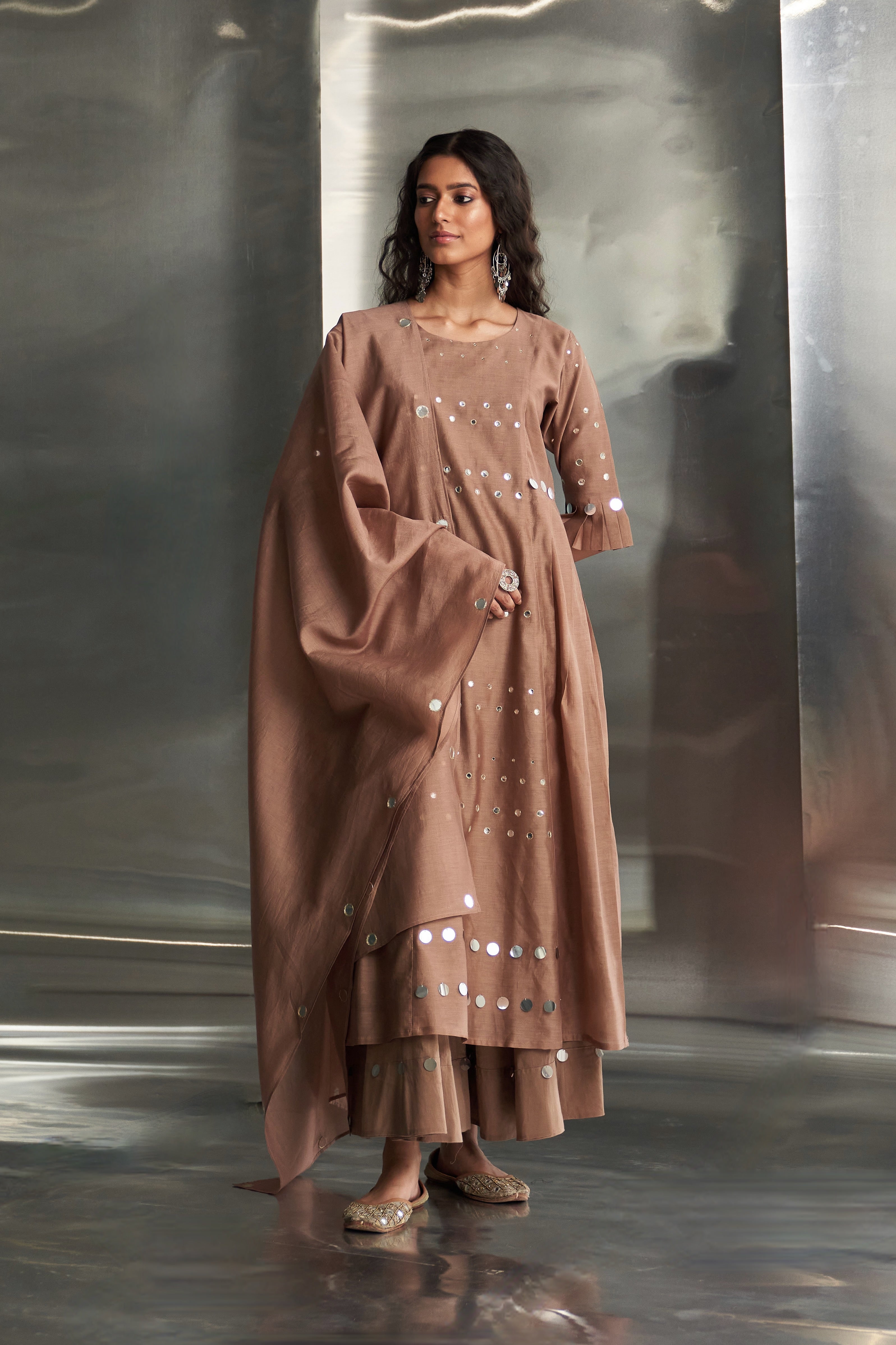 This Chanderi kurta features mirror work on the front panel and sleeves, showcasing a beautiful ginger hue. The stylish pleated sleeves add flair to this Kurta set, complemented by a Chanderi dupatta embroidered with mirror work along the borders. Complete the look with wide flare cotton palazzos highlighted with mirrors, ensuring a stylish and coordinated ensemble.