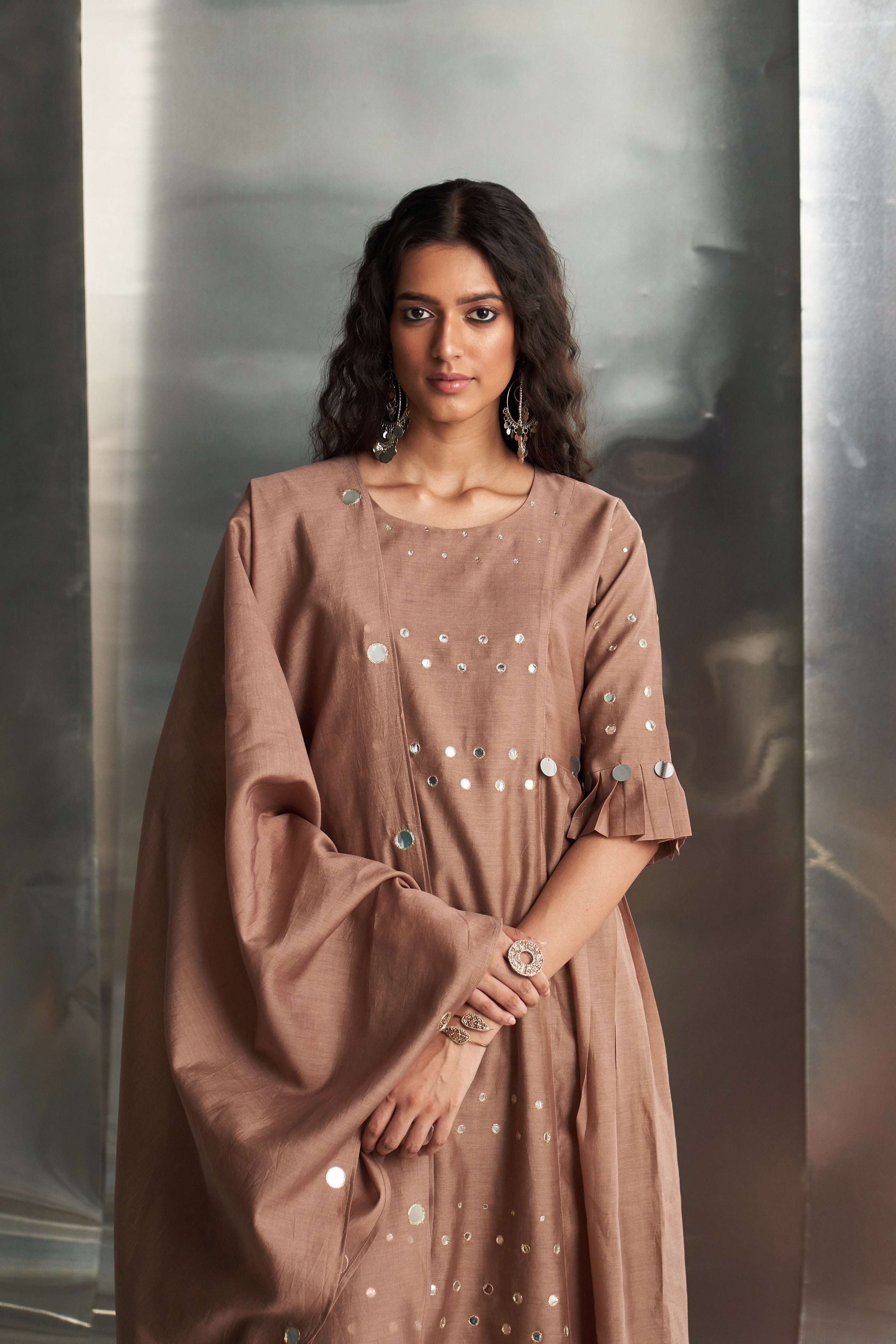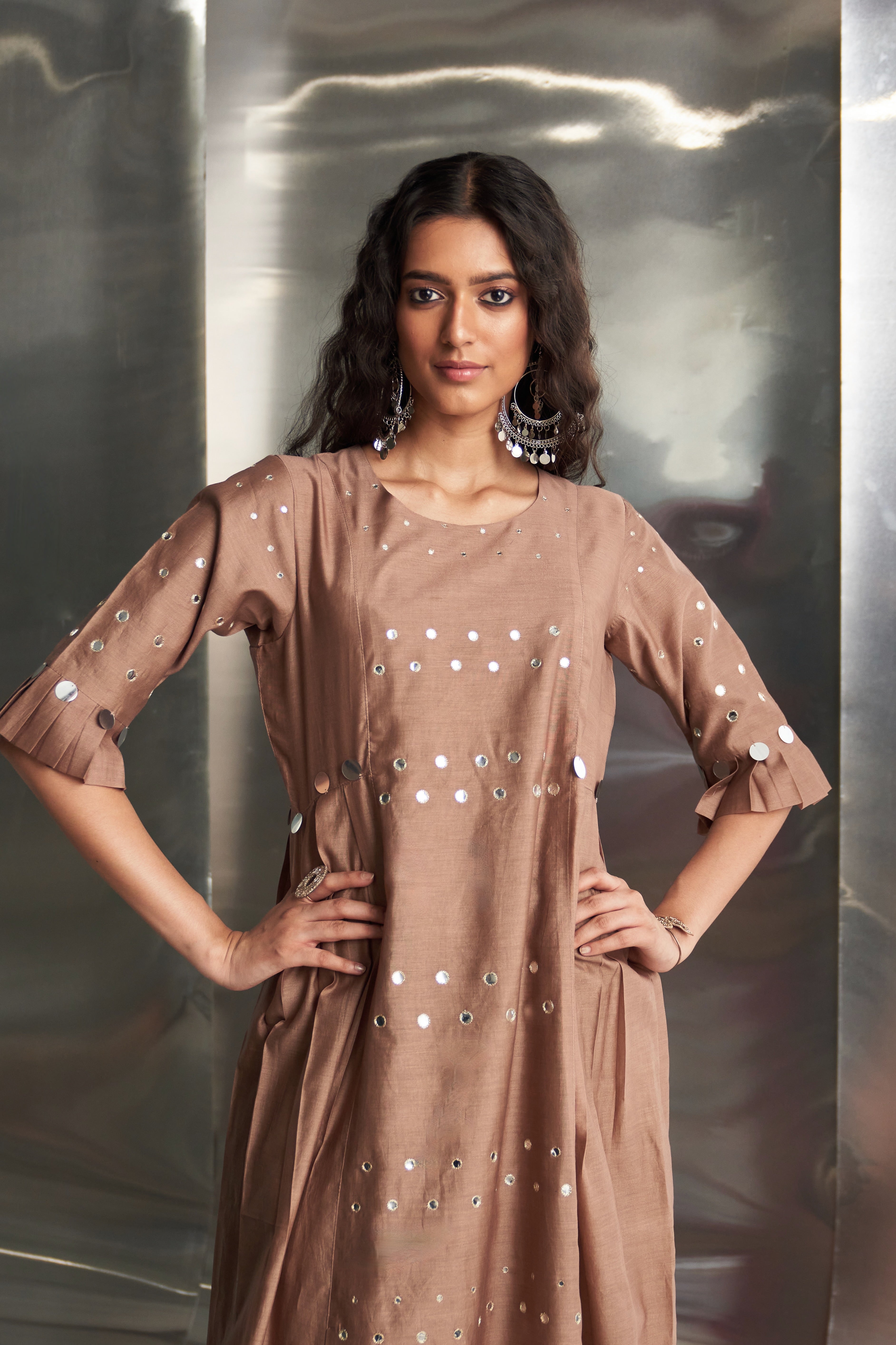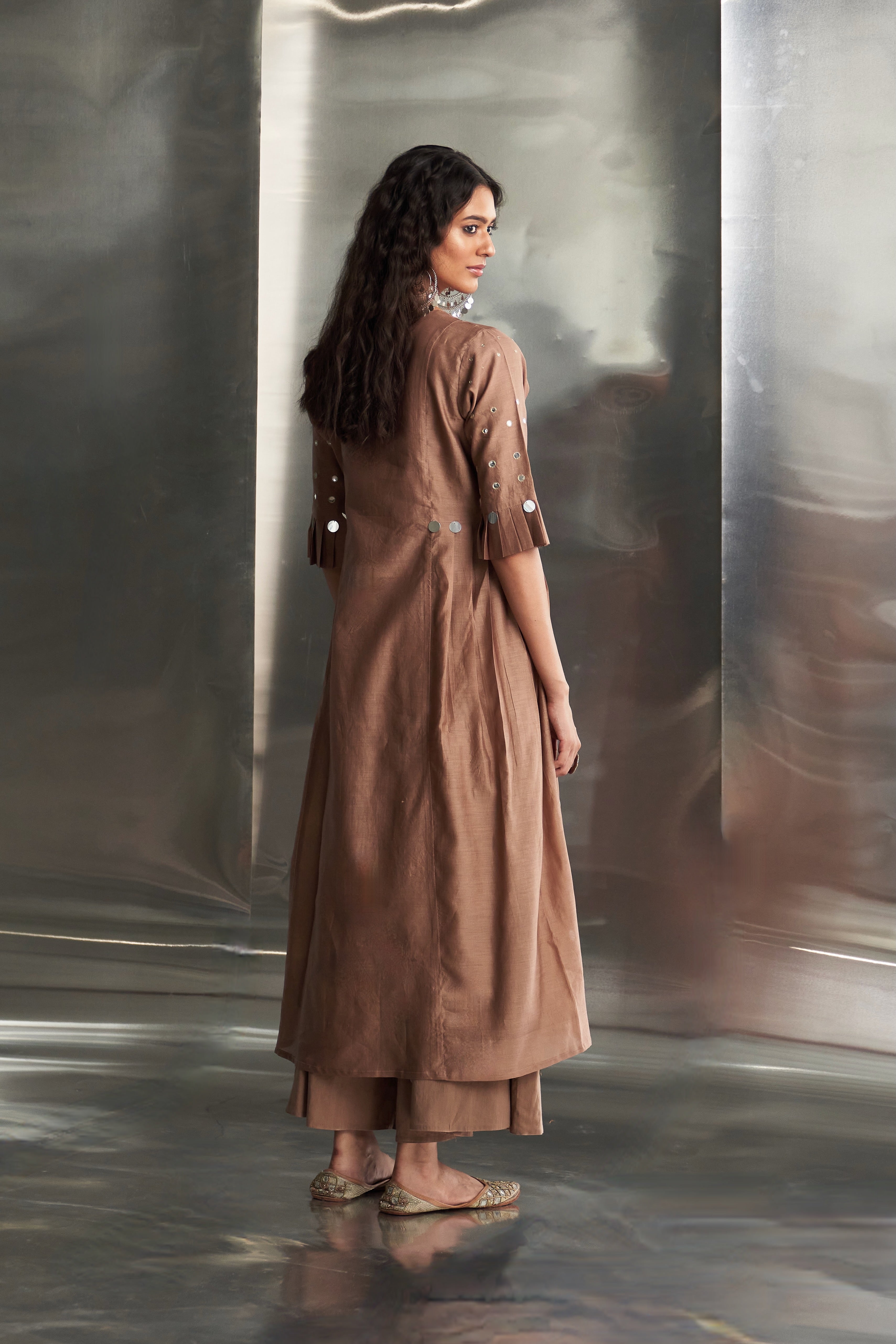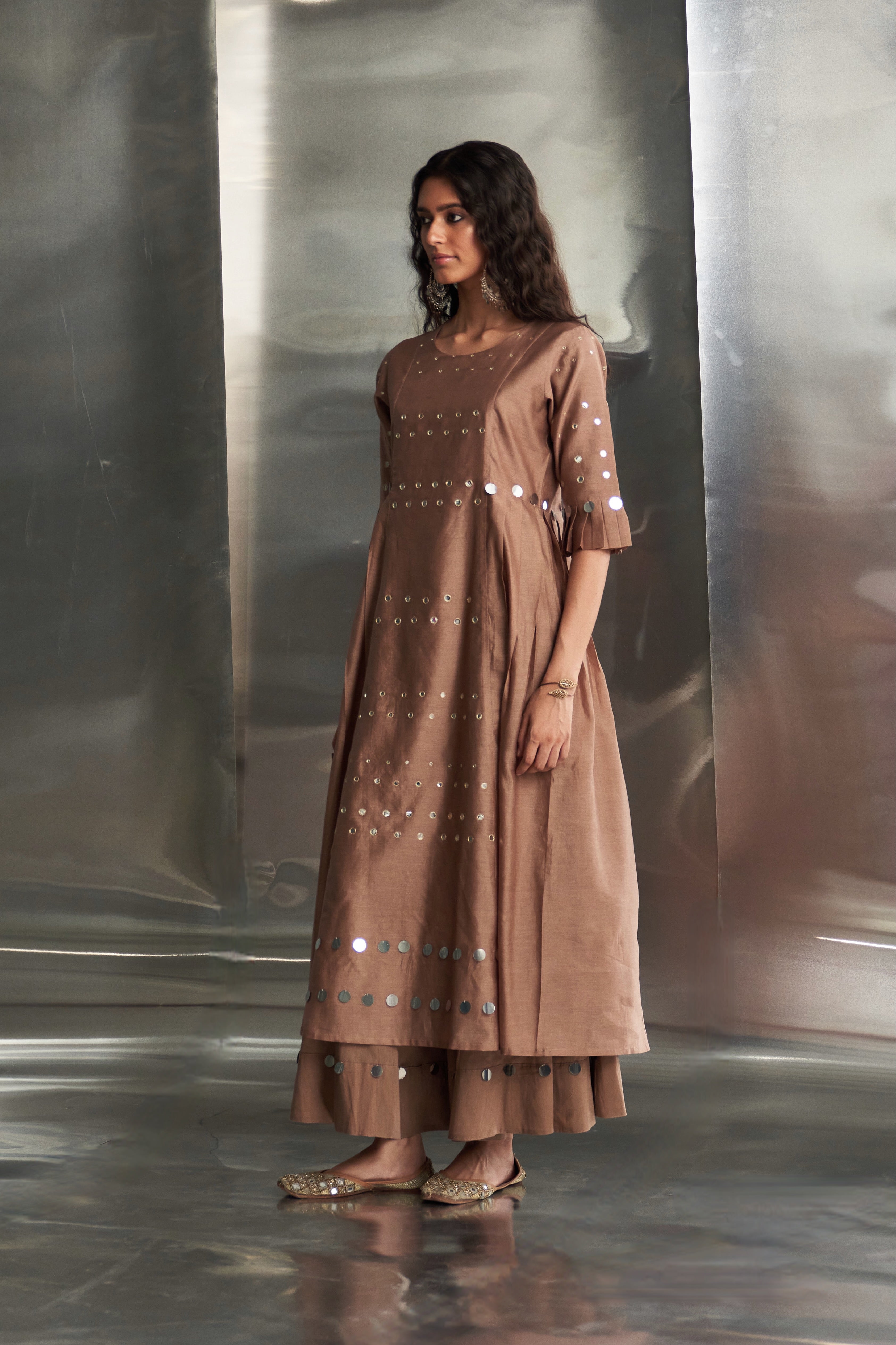 This Chanderi kurta features mirror work on the front panel and sleeves, showcasing a beautiful ginger hue. The stylish pleated sleeves add flair to this Kurta set, complemented by a Chanderi dupatta embroidered with mirror work along the borders. Complete the look with wide flare cotton palazzos highlighted with mirrors, ensuring a stylish and coordinated ensemble.