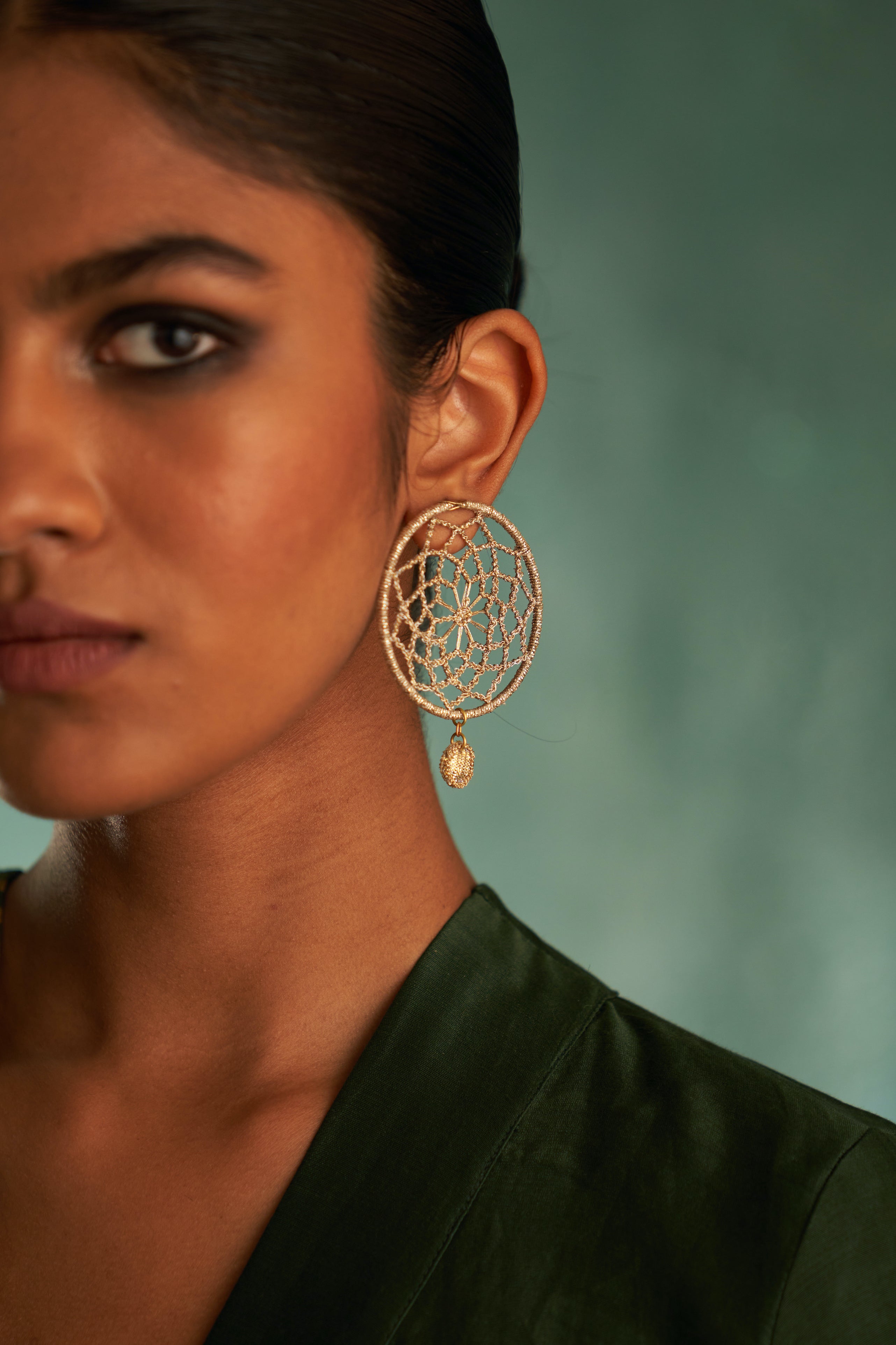 Exuding grace, these gold tone earrings, meticulously crafted from zari are a treat to the eyes. Zari is intricately shaped and manipulated to form intricate patterns showcases artisan's skill and creativity, resulting in a wearable work of art that adds a touch of sophistication and individuality to any ensemble.