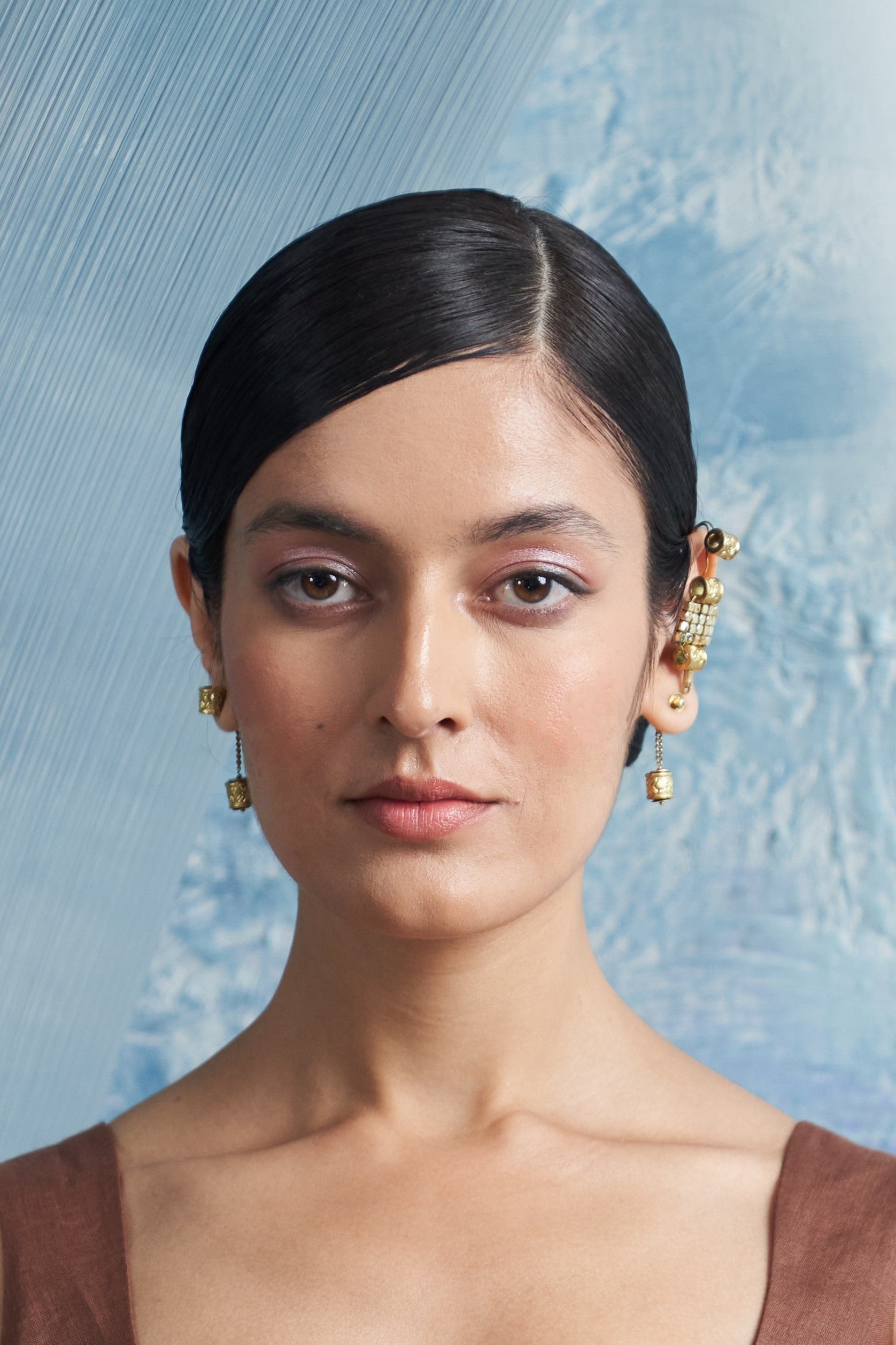 Our stylish and contemporary Stud Earring Set, a unique ensemble designed to make a statement. This set features a combination of a sleek stud earring paired with an ear cuff for an edgy twist on traditional styles. On the other ear, a delicate drop earring dangles gracefully, adding a touch of elegance to your look. Embrace versatility and individuality with this one-of-a-kind set that effortlessly blends modern flair with timeless charm. Elevate your style game with these captivating and unconventional earrings.