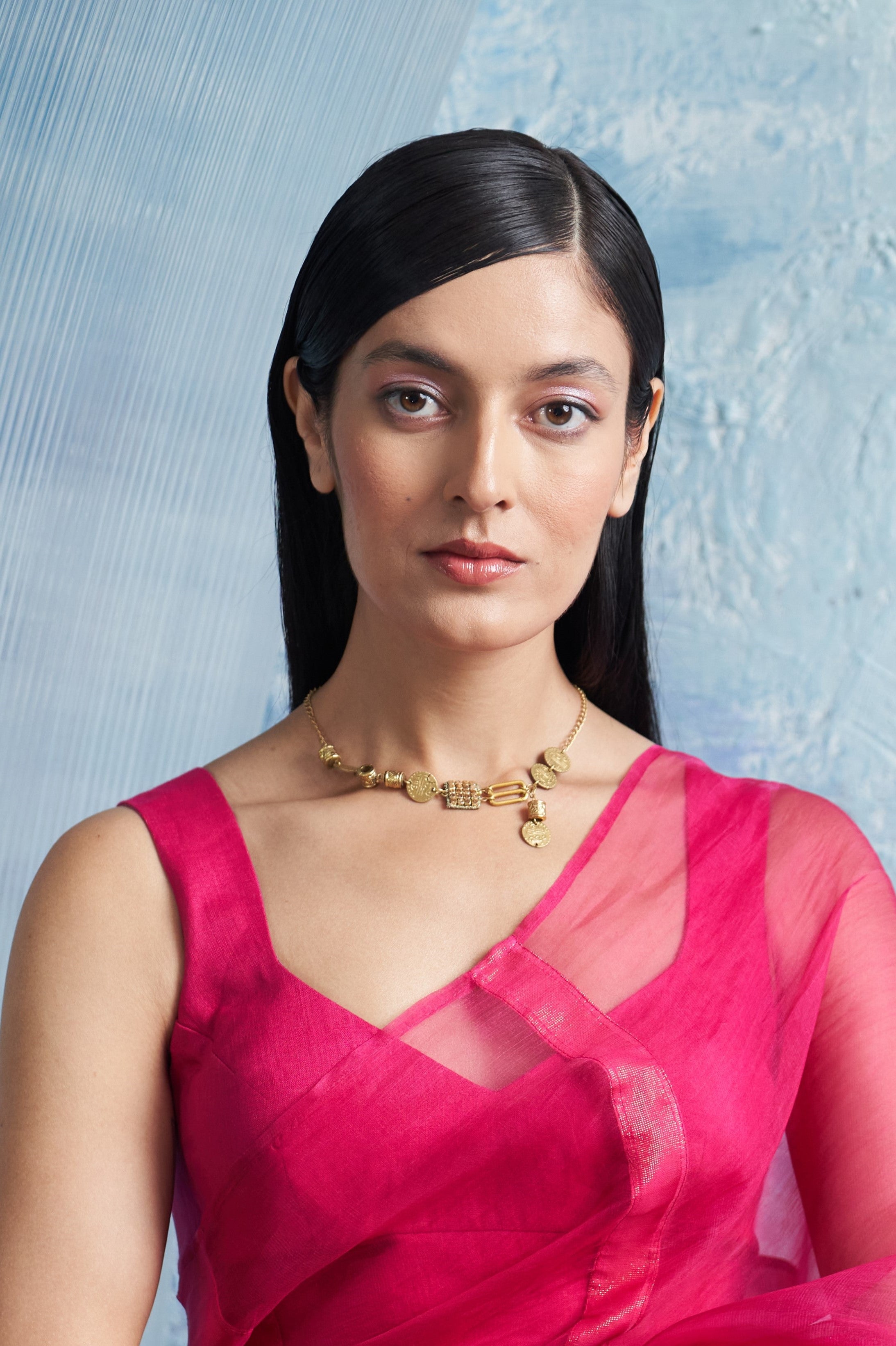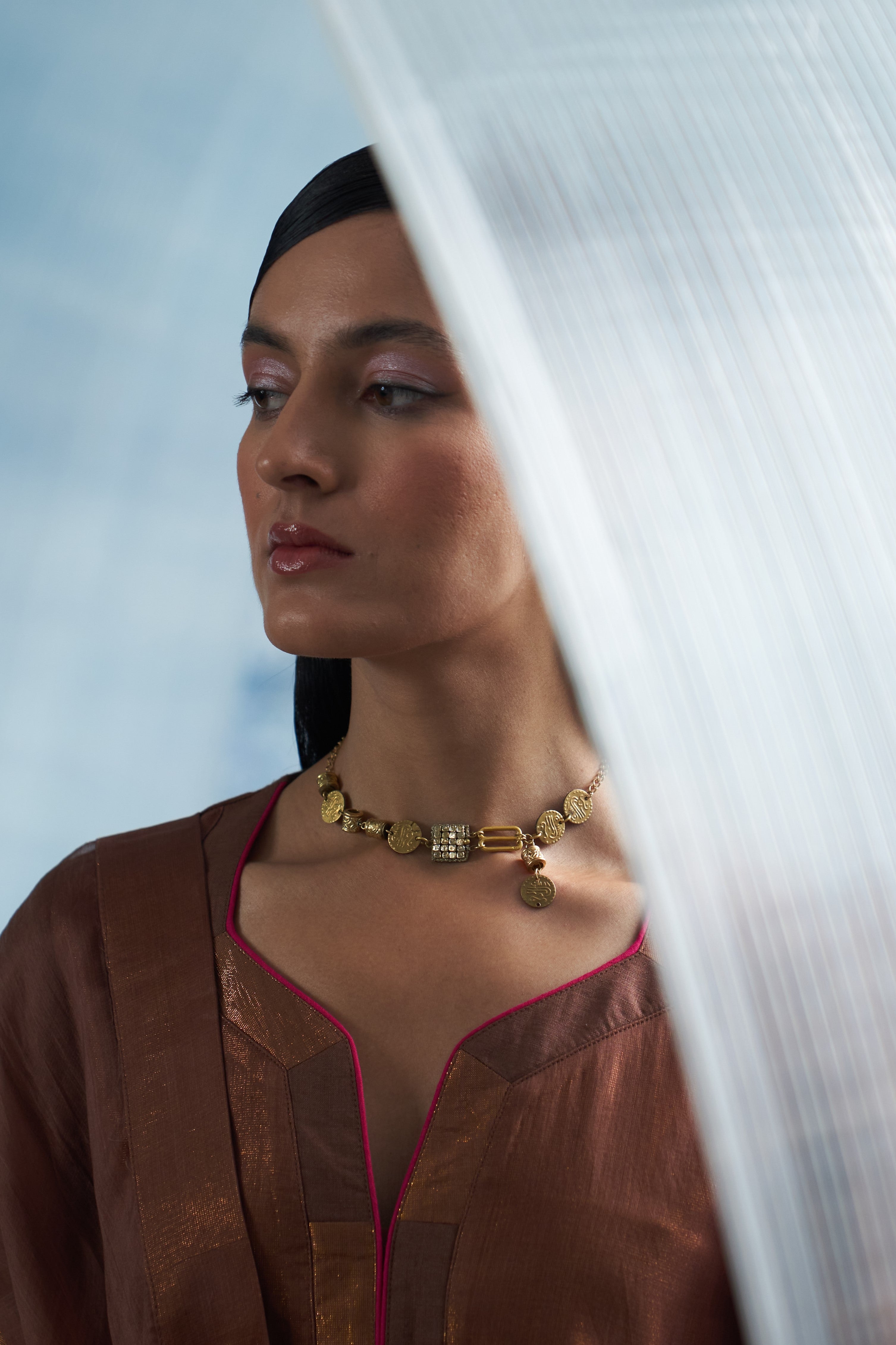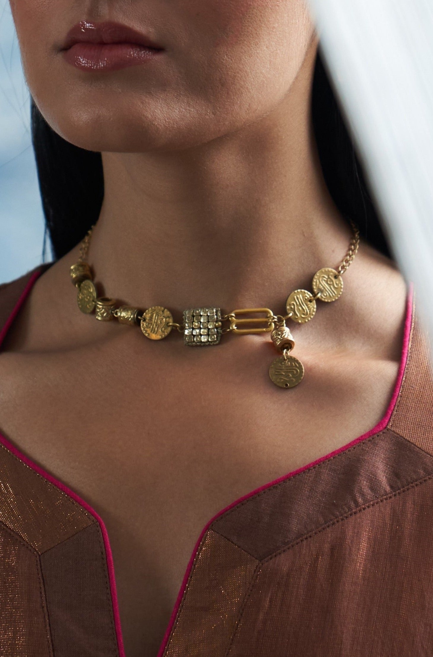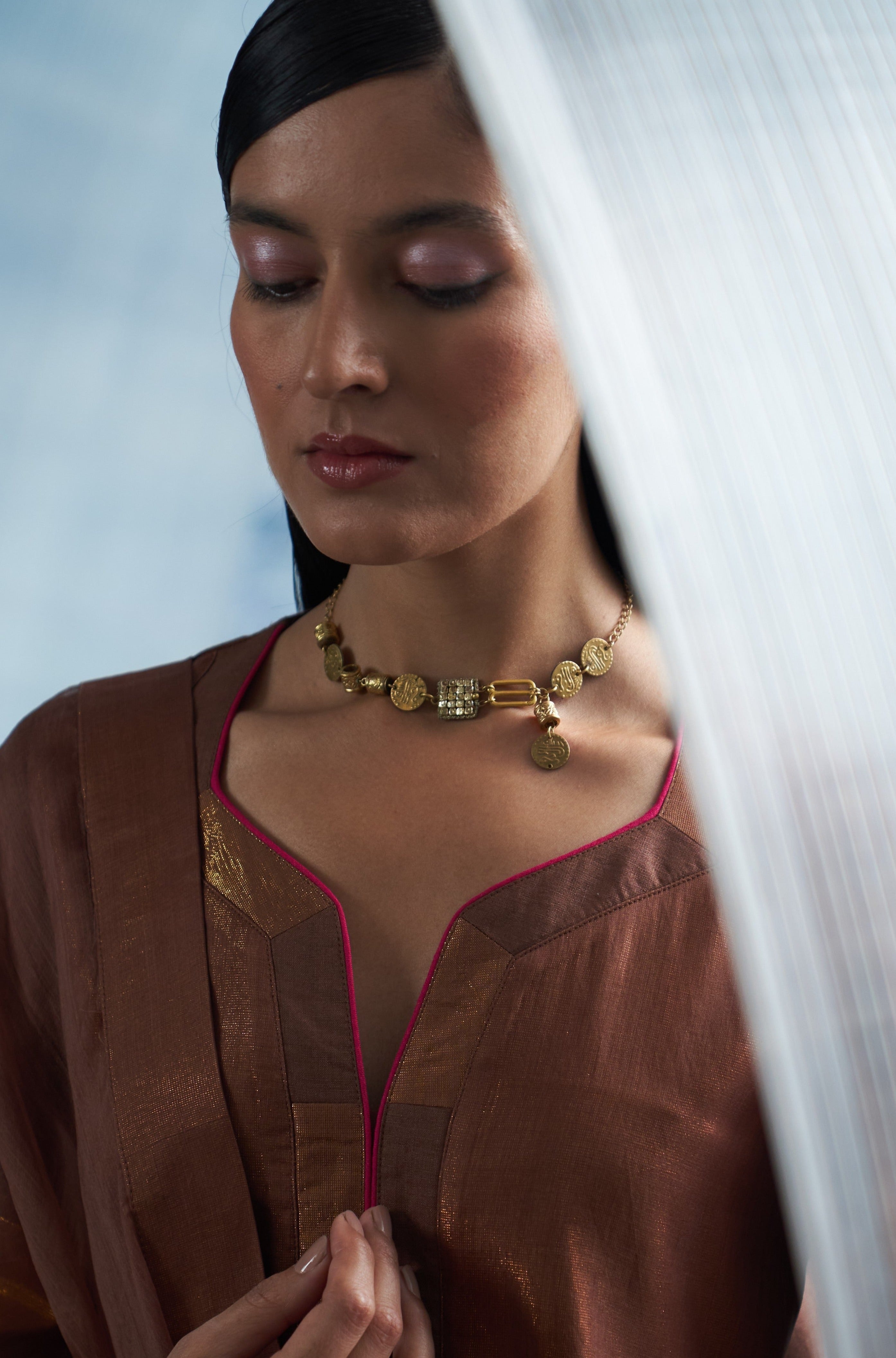 The exquisite Aura Elemental Neckpiece, meticulously handcrafted with utmost care from intricately assembled brass metal capsules. Complete with a chain closure for adjusting the length, this neckpiece is a stunning addition to any ensemble. Whether you're seeking a distinctive accessory for yourself or a refined gift option, it radiates an aura of charm and sophistication that is sure to captivate.