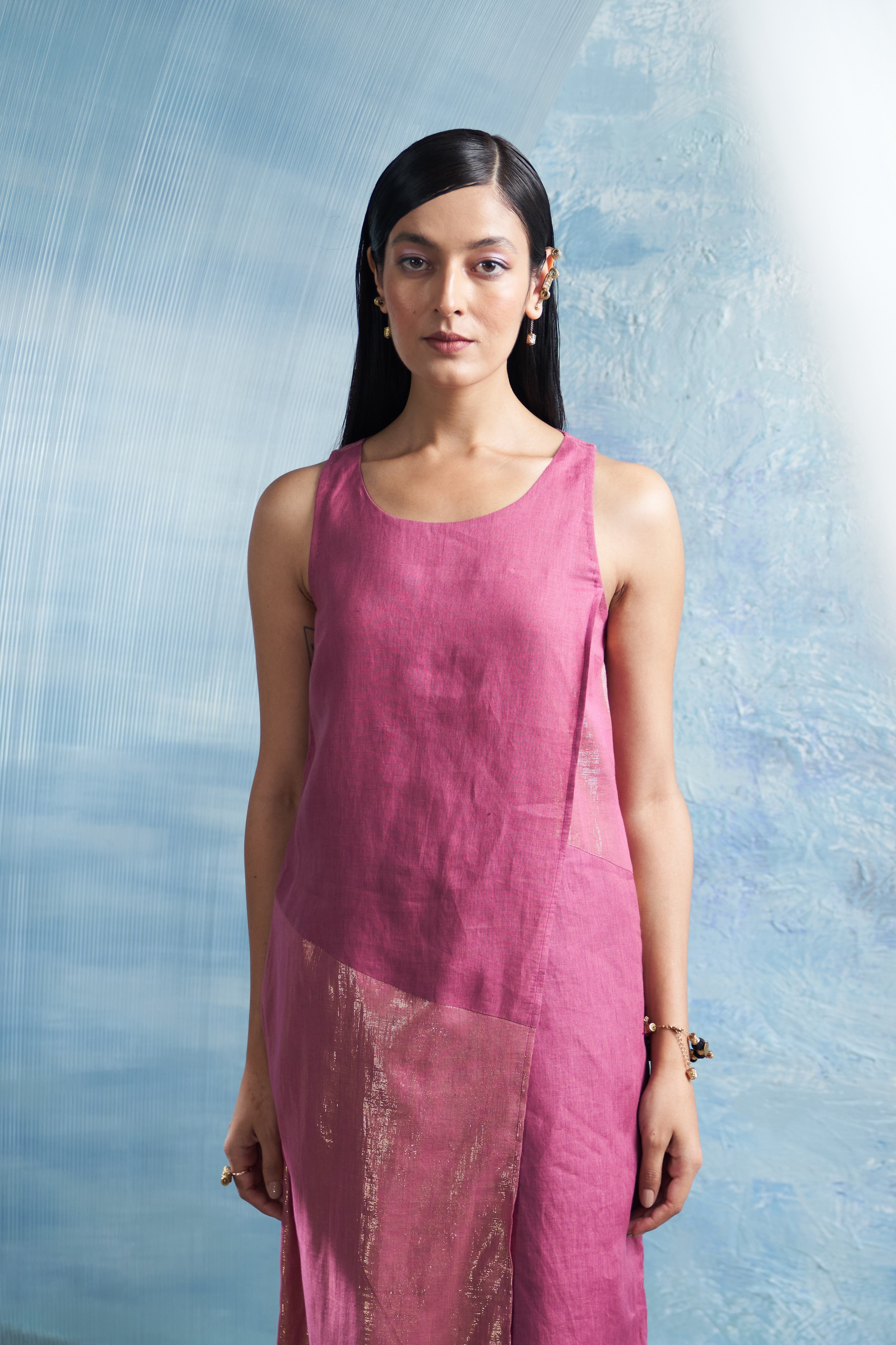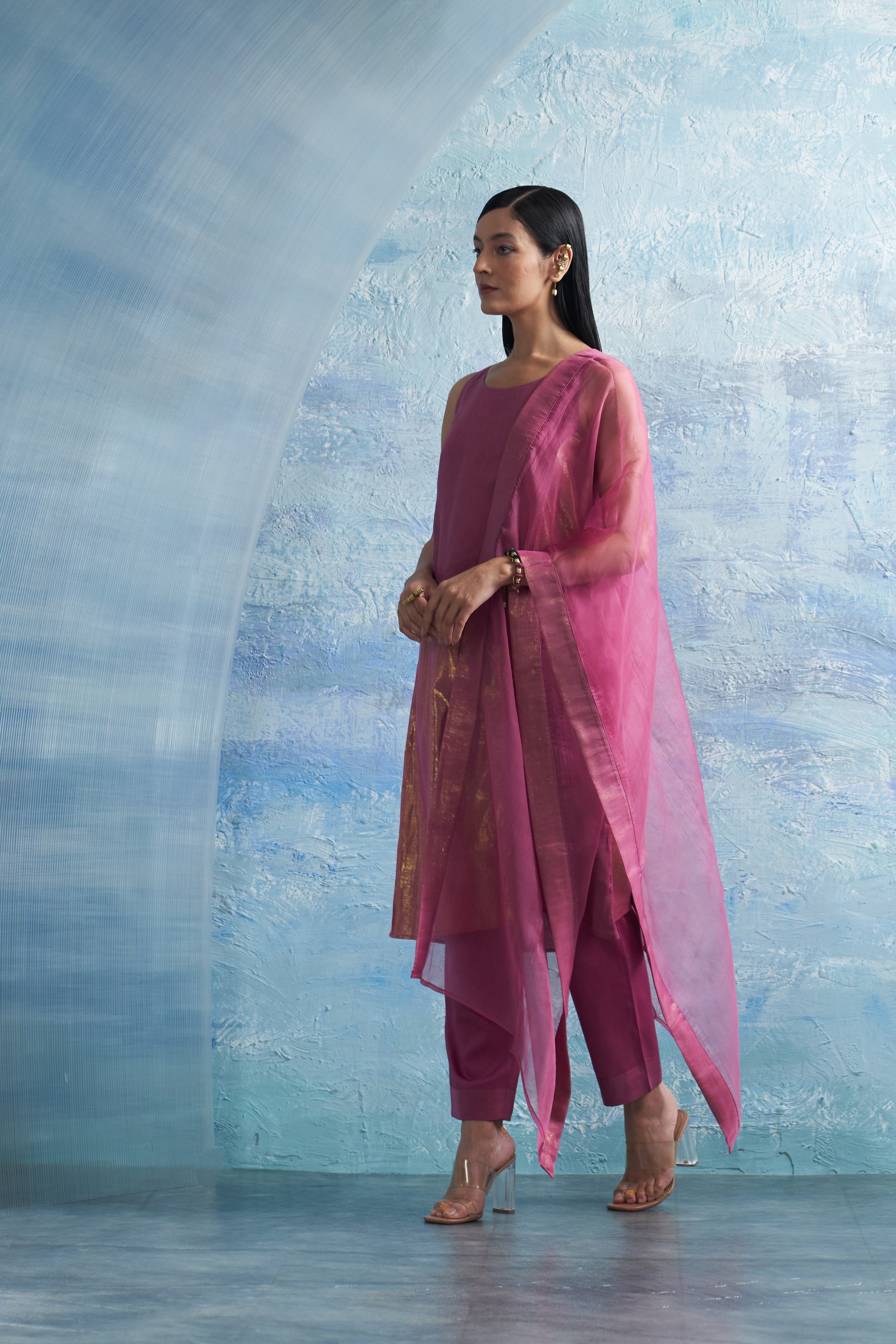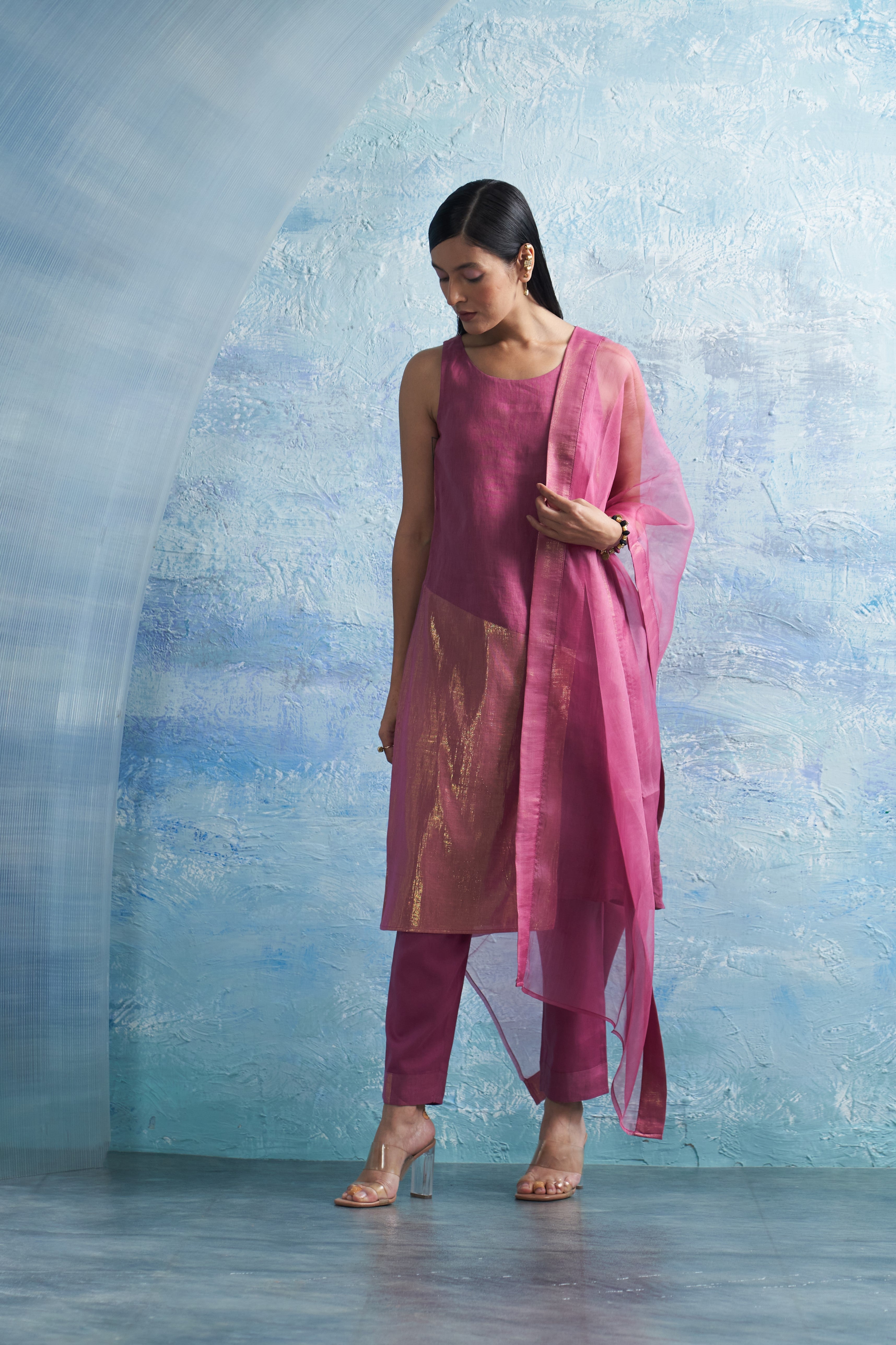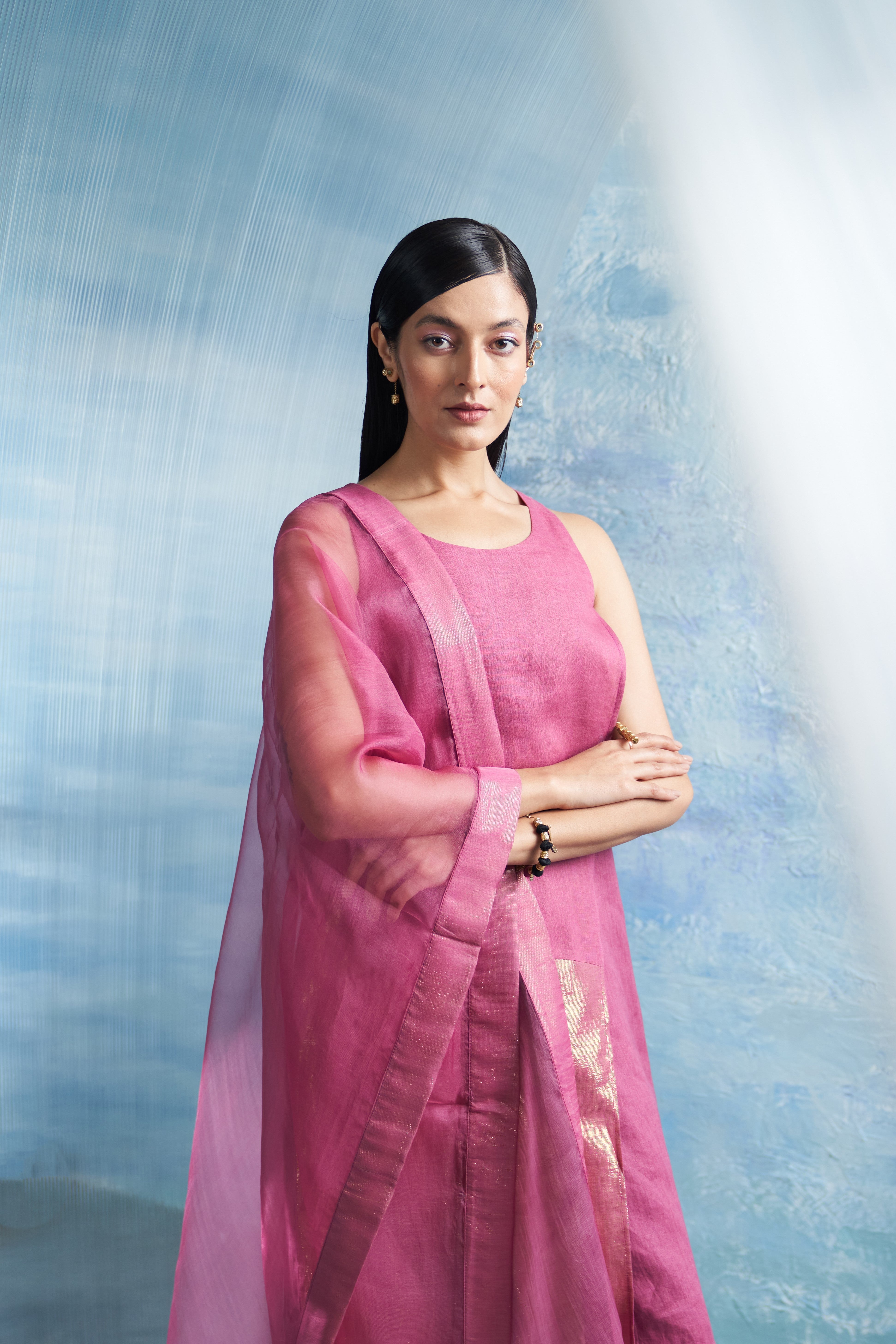 Embrace the fusion of modern style and timeless elegance with our Overlap Panel Kurta. It features a unique design with overlapping panels, adding depth and dimension to your ensemble. Crafted with precision from premium Linen fabric accentuated with a hint of shimmer, it boasts a luxurious feel and impeccable drape. Teamed with sheer organza dupatta, elevates the chic quotient of this ensemble. Completing the ensemble are the flowy cotton satin pants, offering both comfort and style in equal measure.