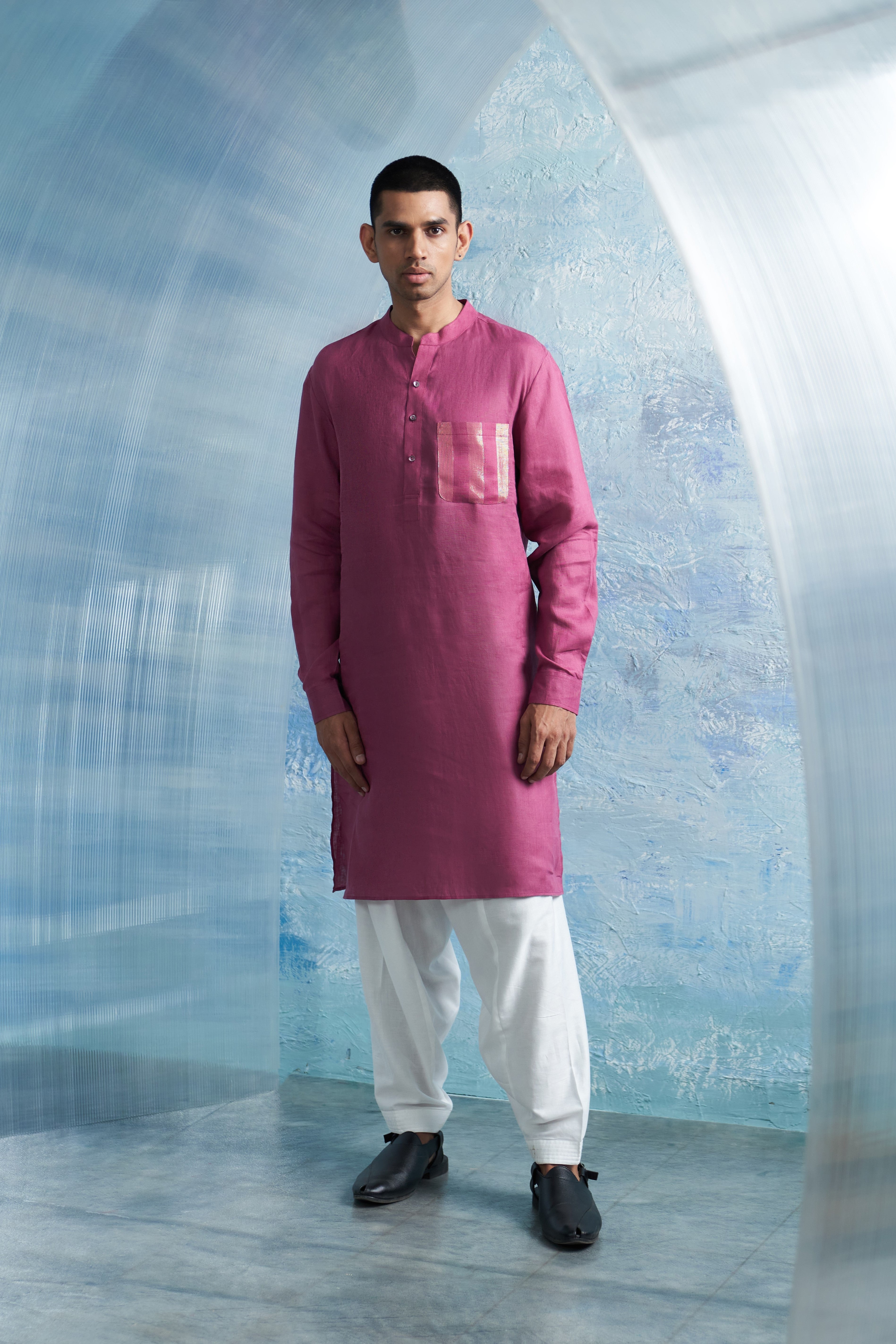 Indulge in elegance with our classic straight kurta, crafted in a standout grape pink linen—a striking addition to our Aura collection. This exceptional kurta boasts delicate hints of shimmer on the pocket, elevating its timeless charm with a touch of refinement. Paired with a cotton satin salwar for a traditional look or styled with classic straight pants for versatility.