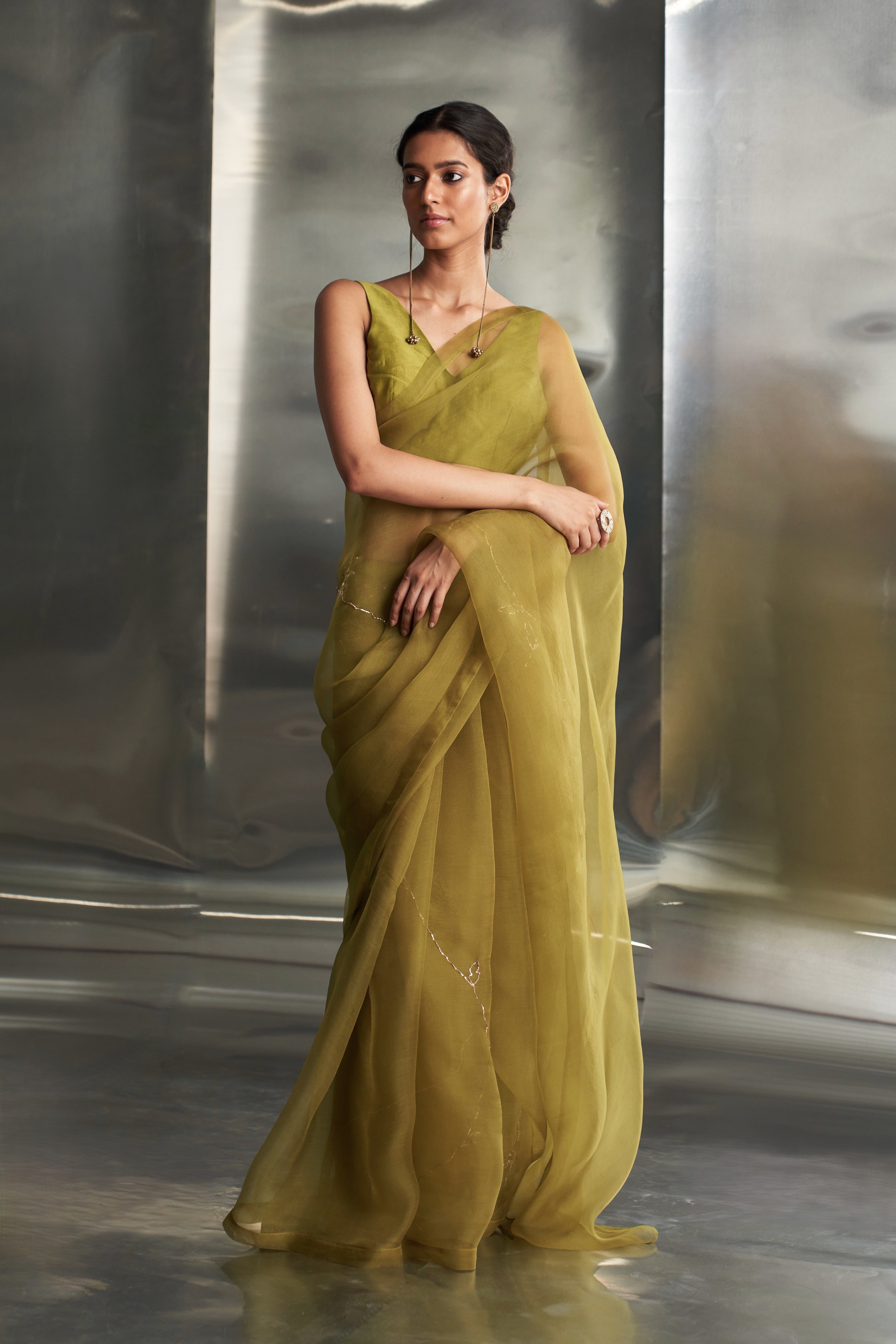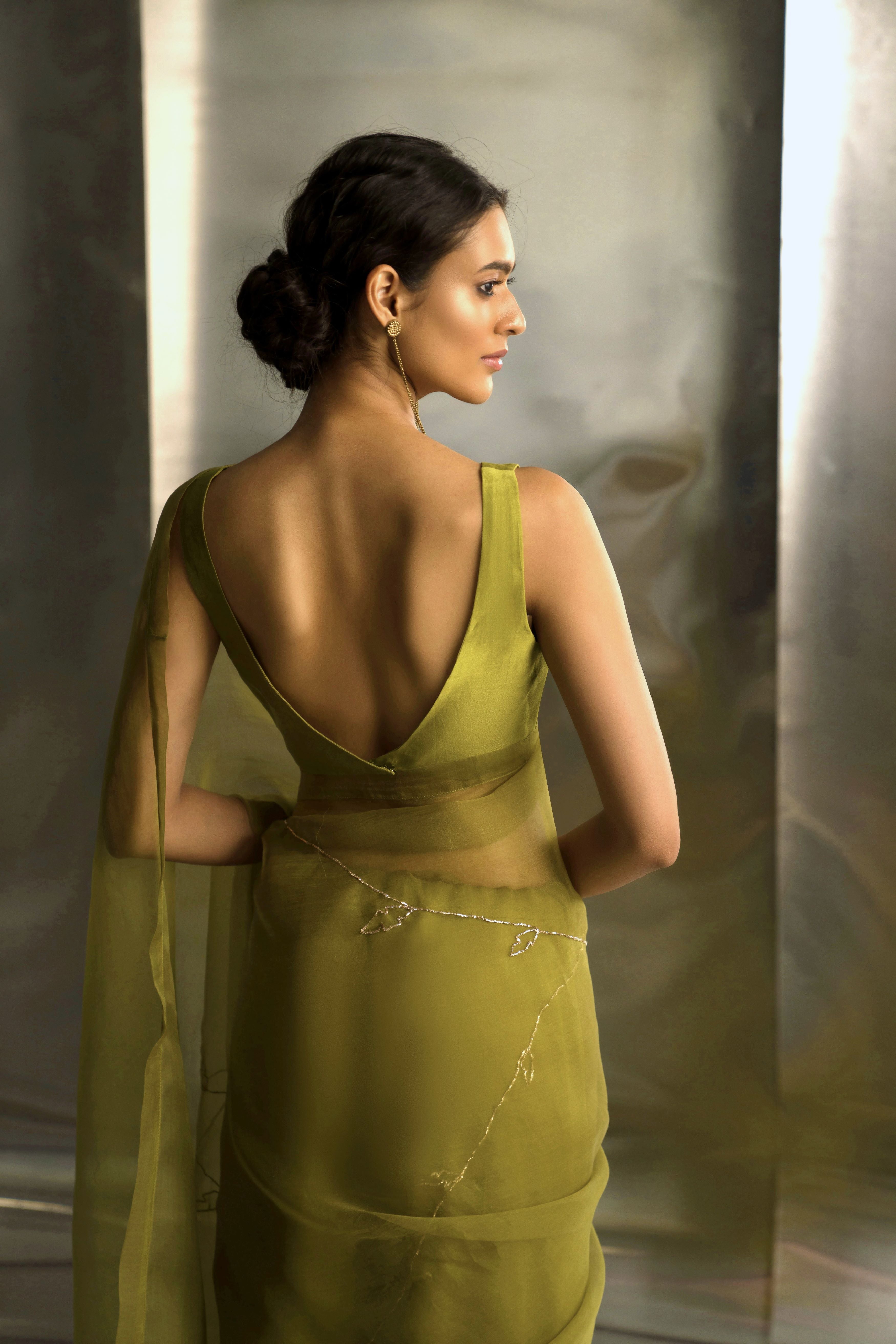 This rich and vibrant saree, crafted in a stunning berry green hue from pure organza fabric, showcases intricate golden nakshi hand embroidery inspired by graceful leaf motifs. Paired with a deep-neck, sleeveless Chanderi blouse (padded) that adds a touch of glamour, this ensemble embodies timeless elegance.